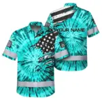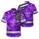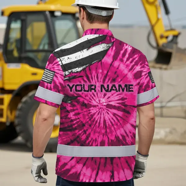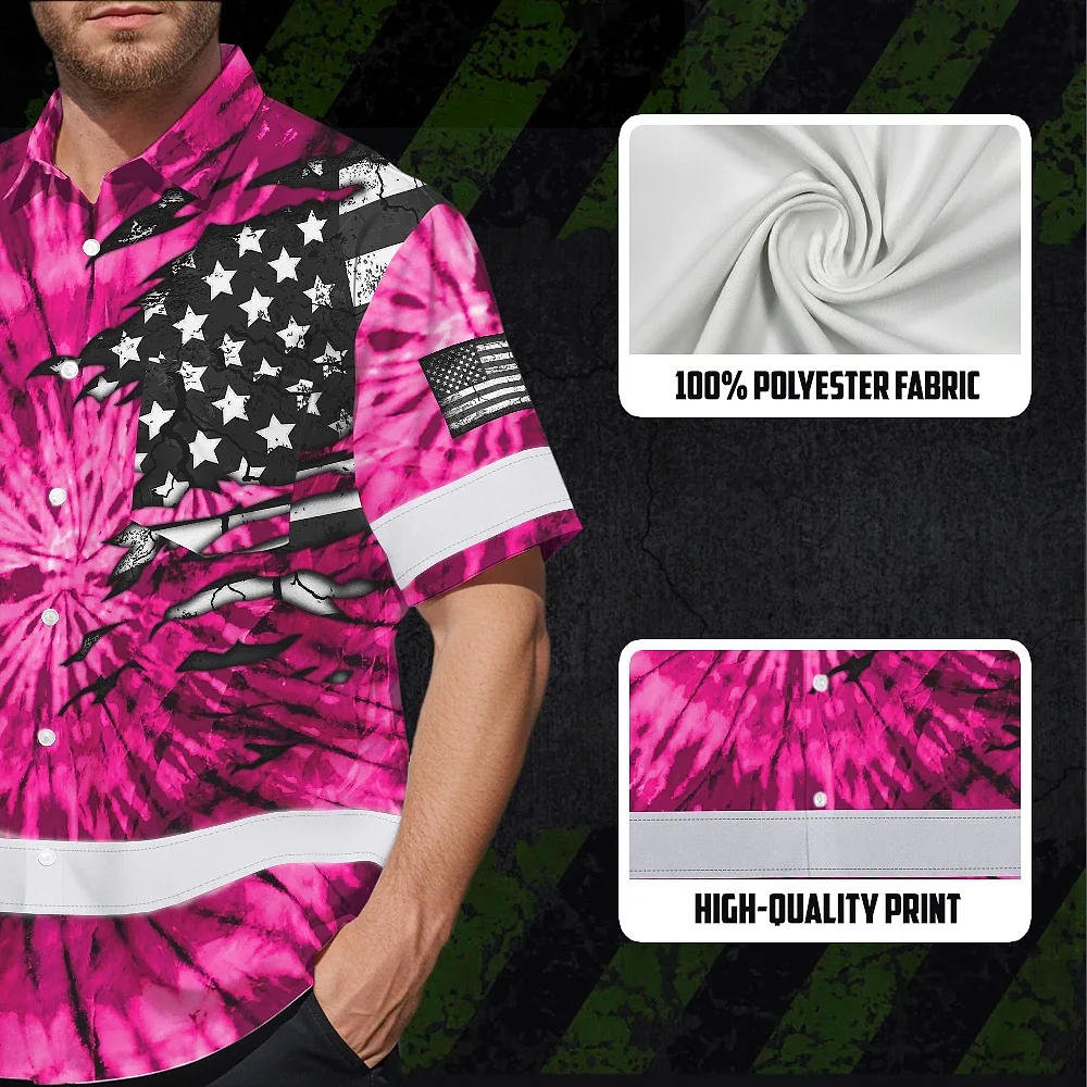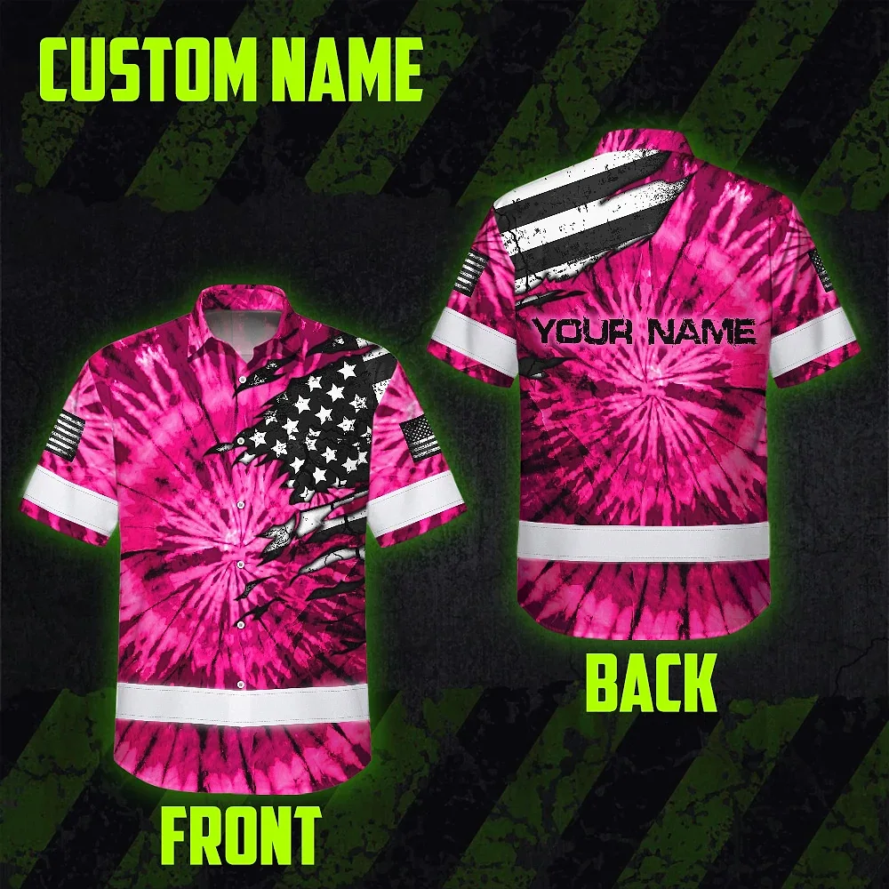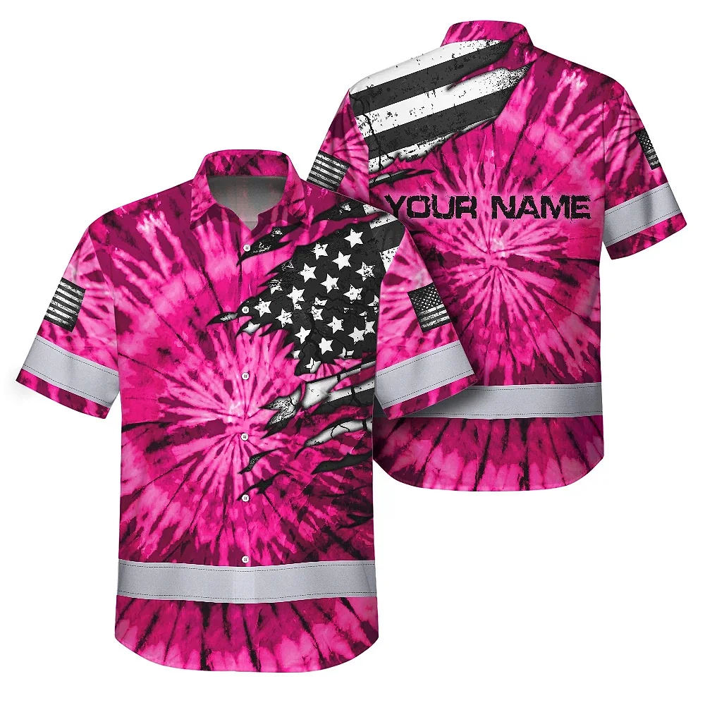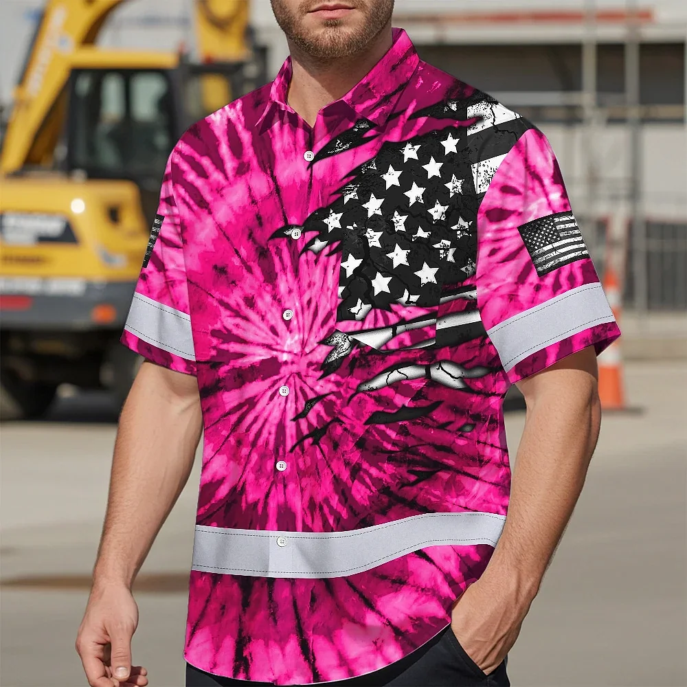 Hi Vis Hawaiian Shirt Reflective Tapes Pink Tie Dye US Flag Scratch Custom Name Safety Workwear For Workers, Runners, Cyclists