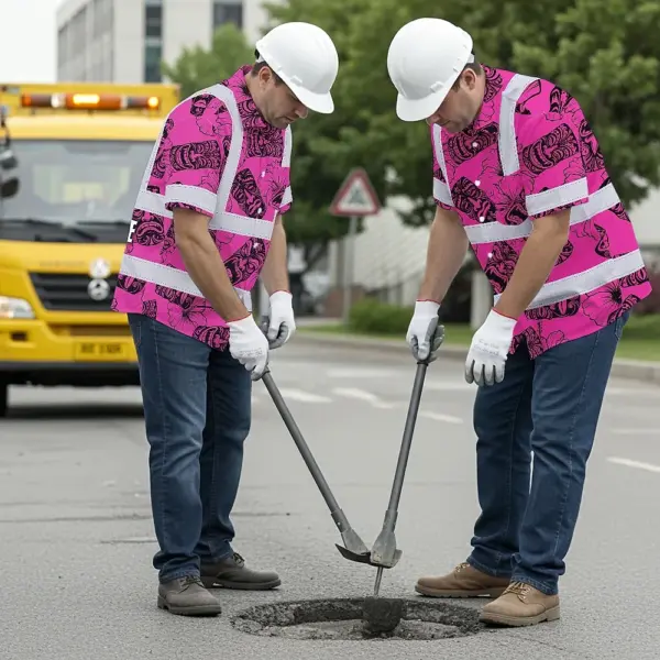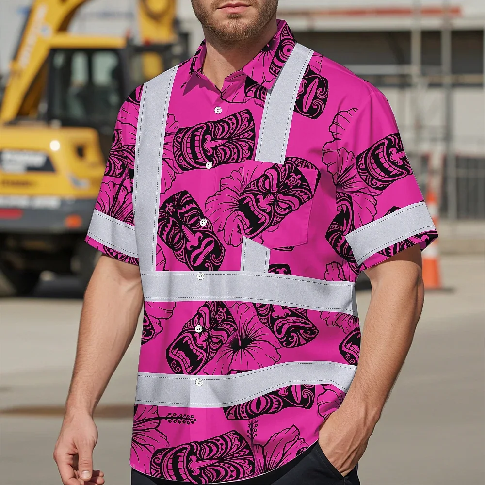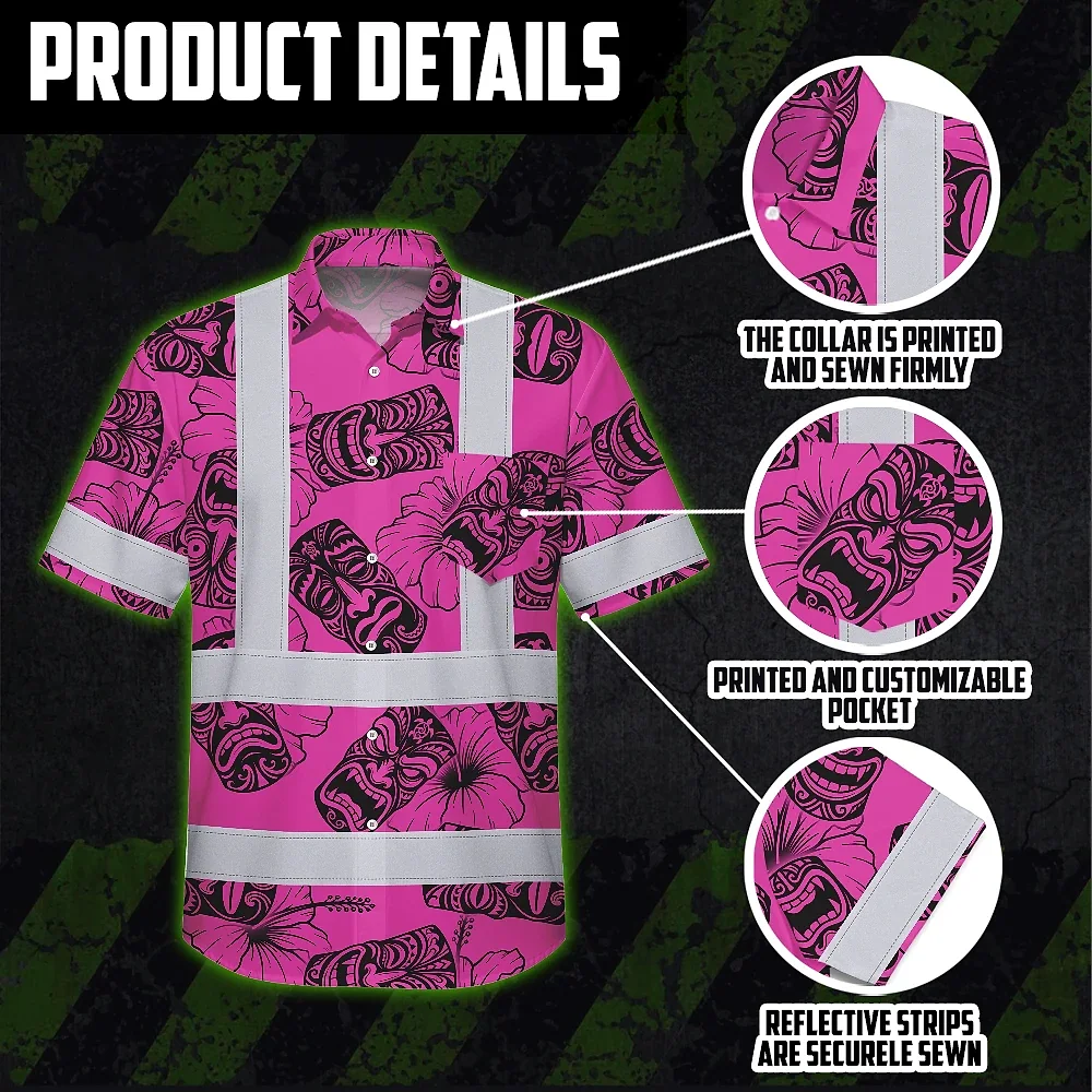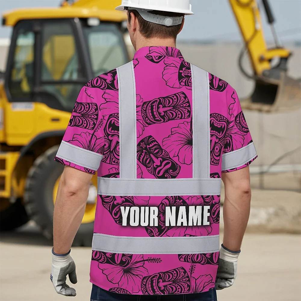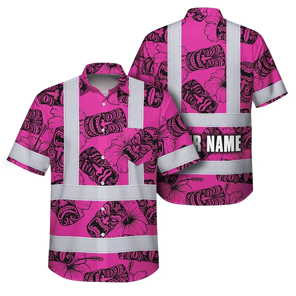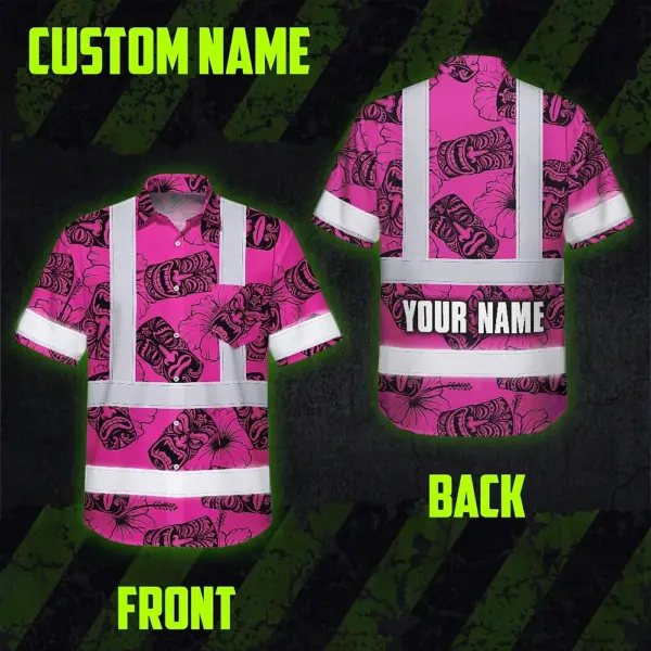 Hi Vis Hawaiian Shirt Reflective Tapes Pink Tiki Custom Name Safety Workwear For Workers, Truckers, Operators