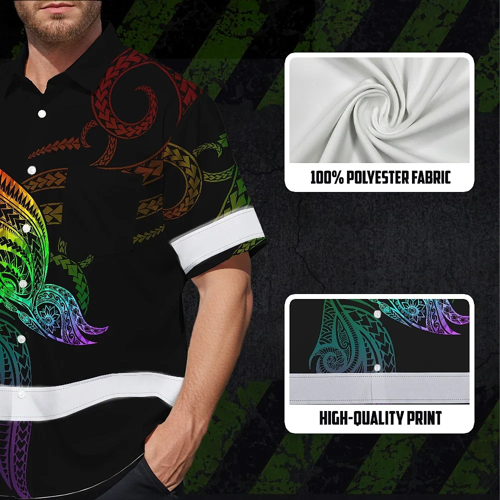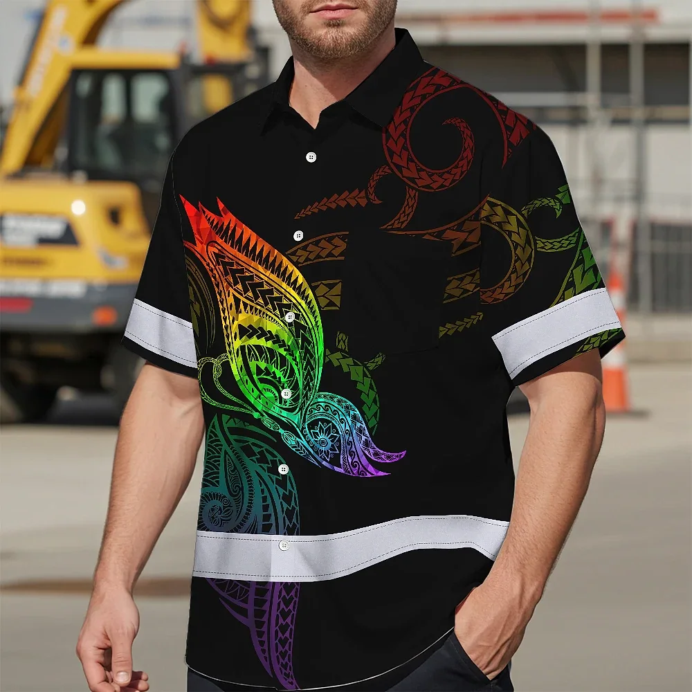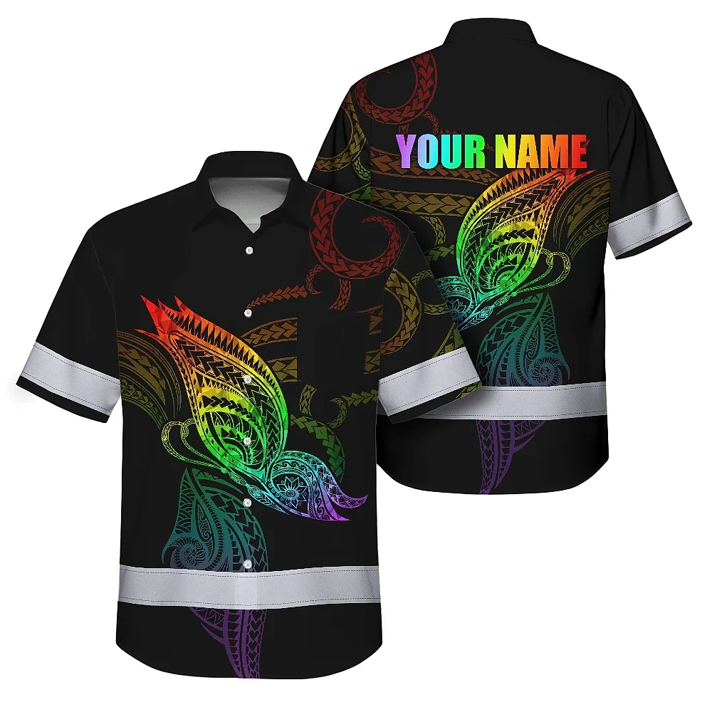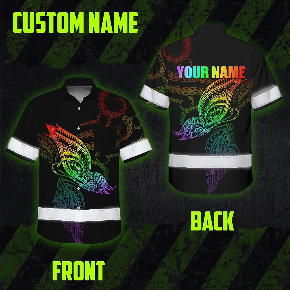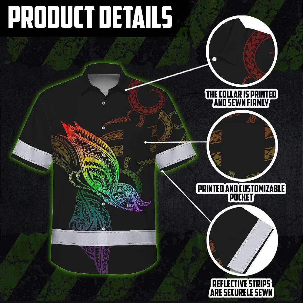 Hi Vis Hawaiian Shirt Reflective Tapes Rainbow Butterfly Polynesian Custom Name Safety Workwear For Workers, Truckers, Operators