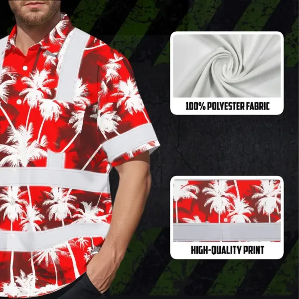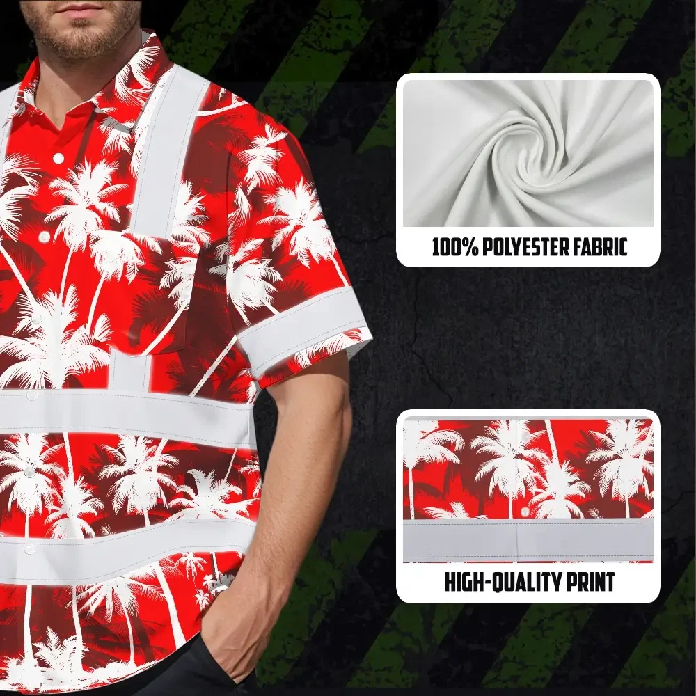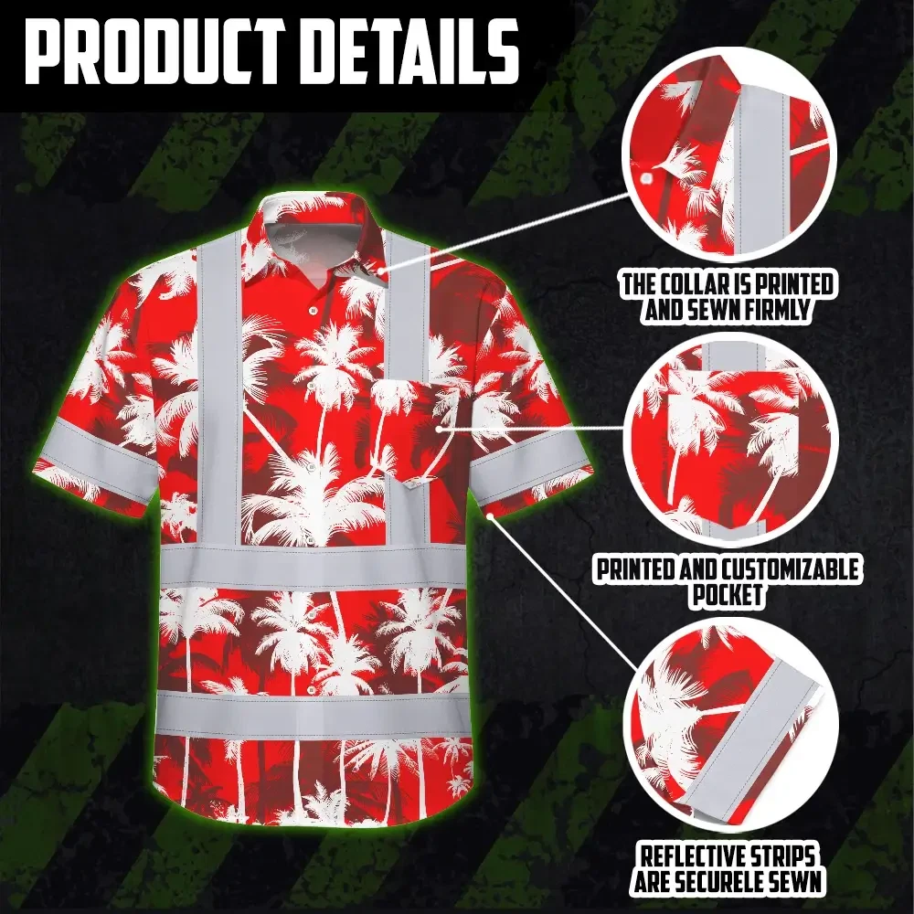 Hi Vis Hawaiian Shirt Reflective Tapes Red Neon Flowers Custom Name Safety Workwear For Workers, Truckers, Operators