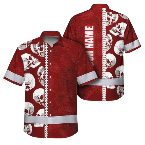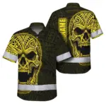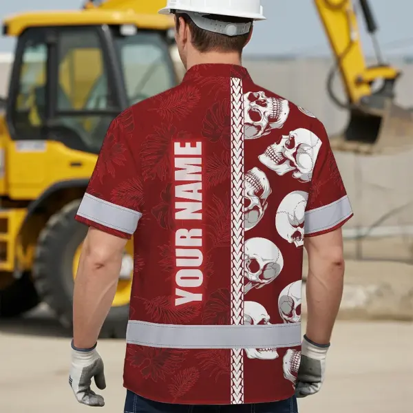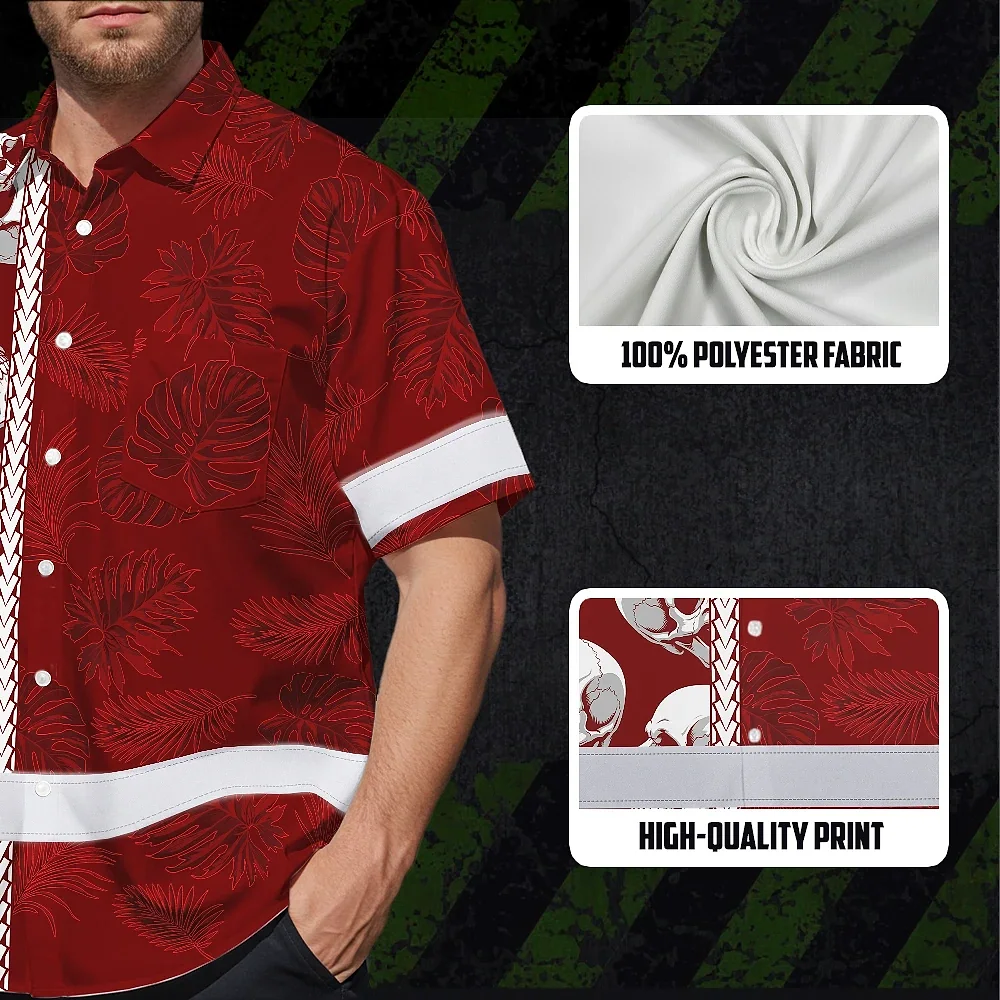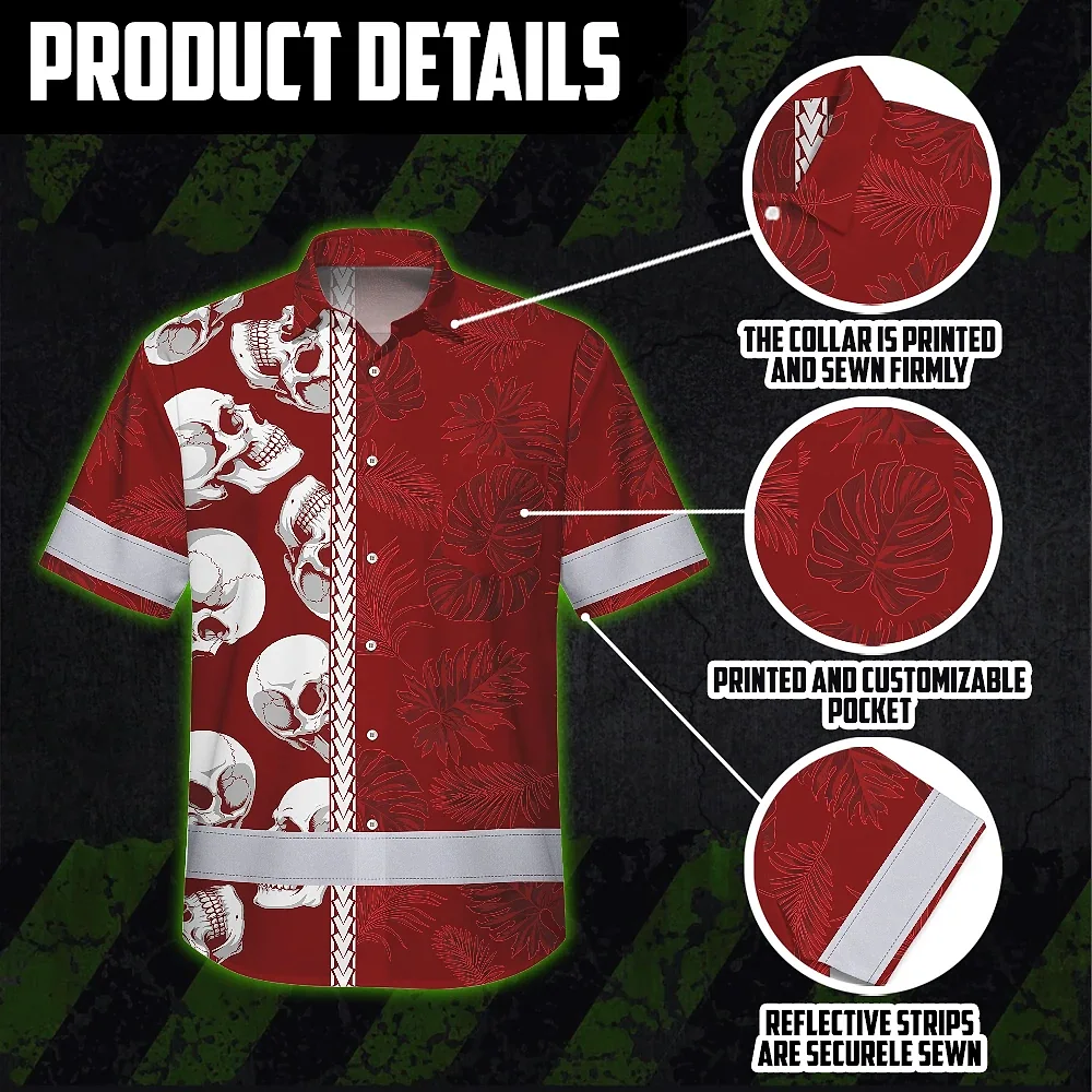 Hi Vis Hawaiian Shirt Reflective Tapes Red Neon Polynesian Skull Custom Name Safety Workwear For Workers, Truckers, Operators