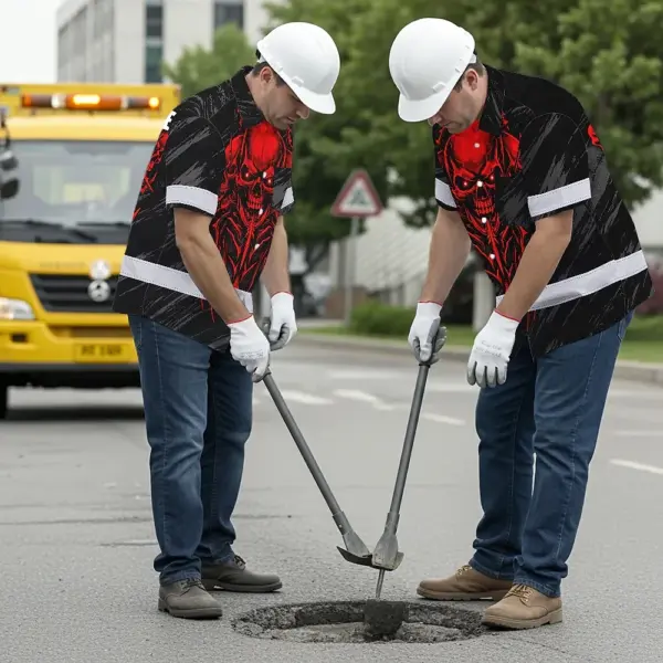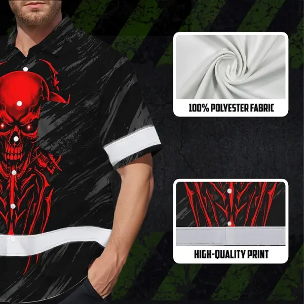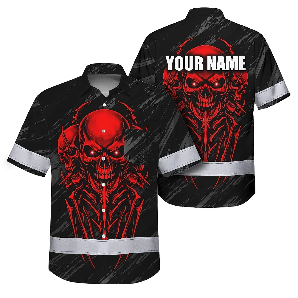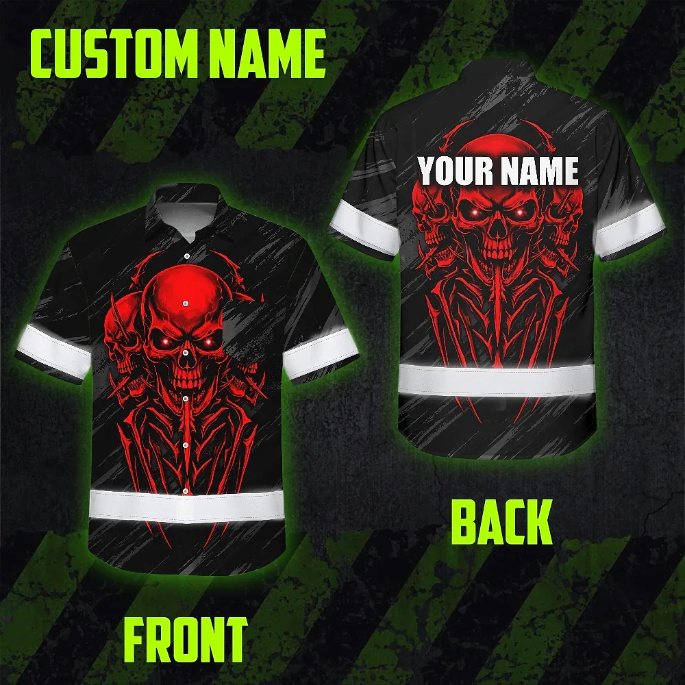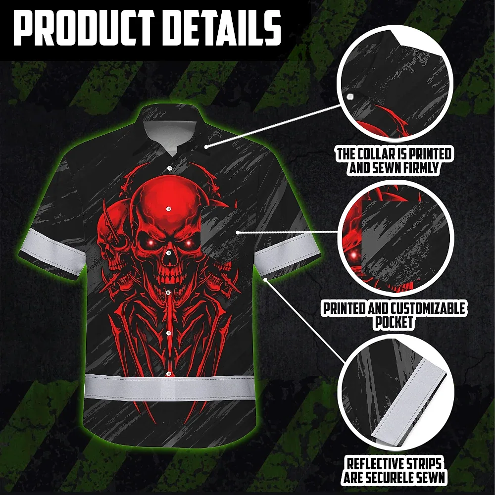 Hi Vis Hawaiian Shirt Reflective Tapes Red Neon Skull Custom Name Safety Workwear For Workers, Truckers, Operators