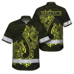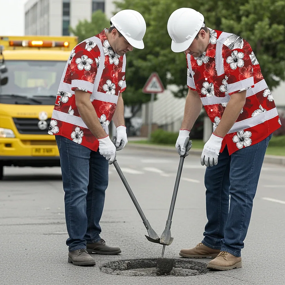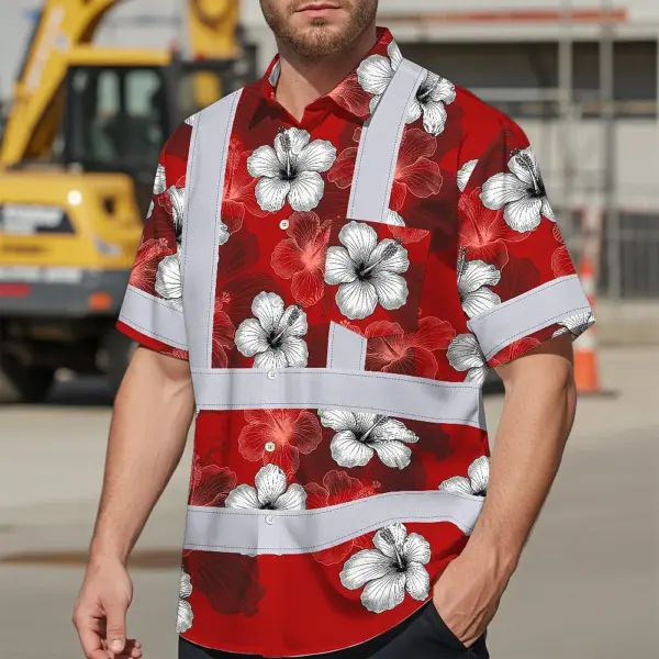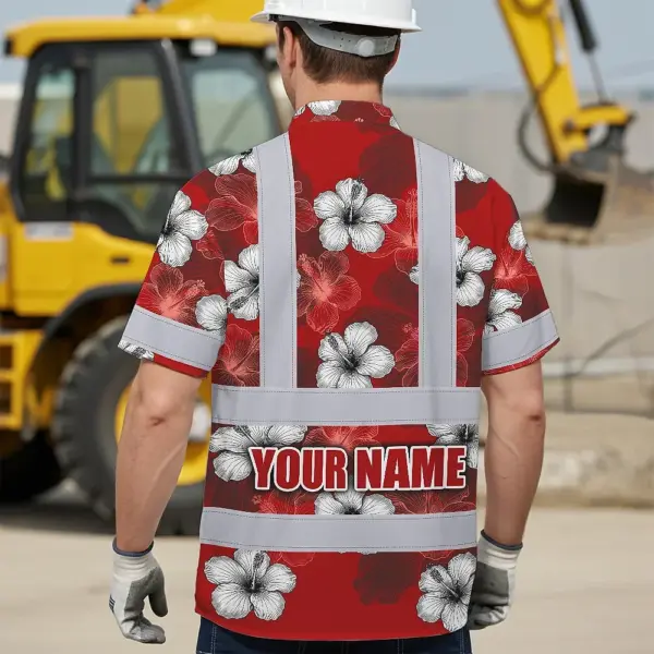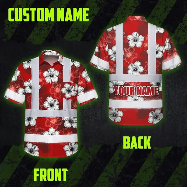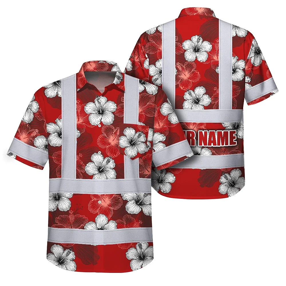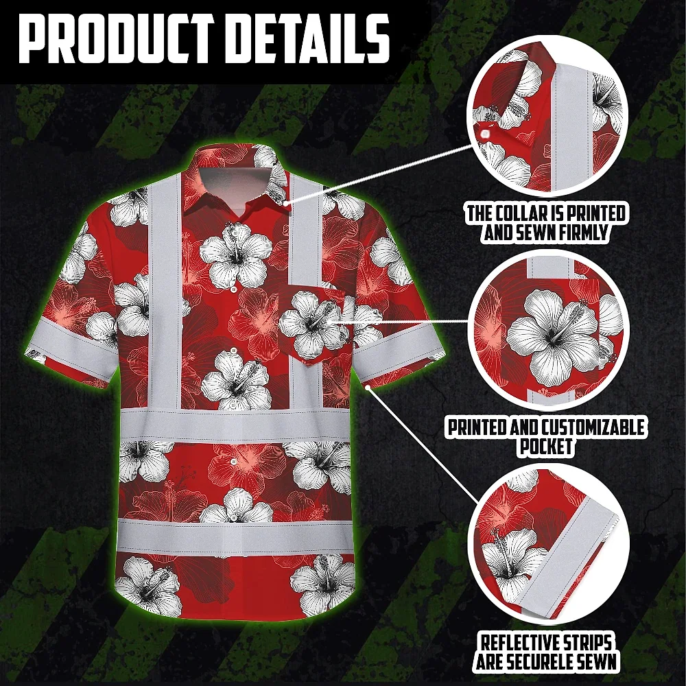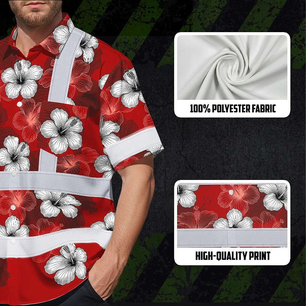 Hi Vis Hawaiian Shirt Reflective Tapes Red White Hibiscus Custom Name Safety Workwear For Workers, Truckers, Operators