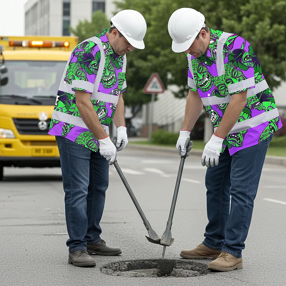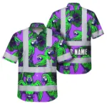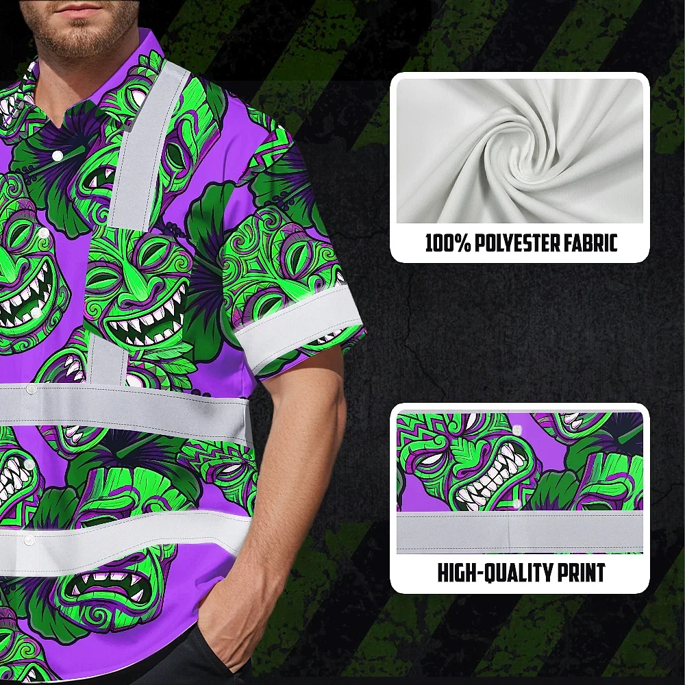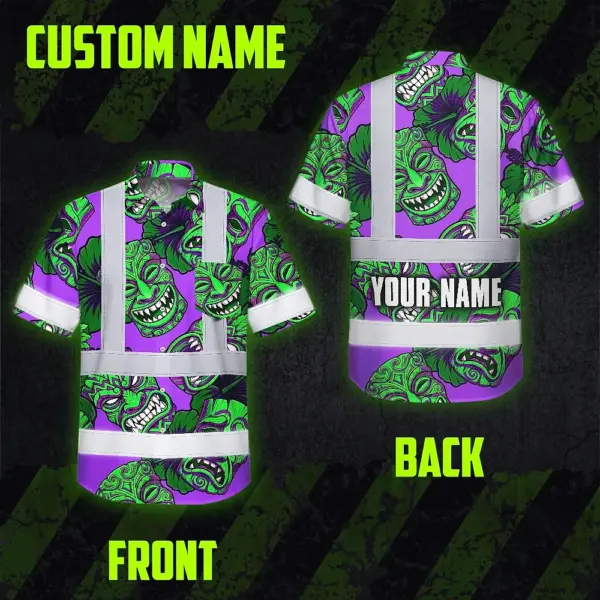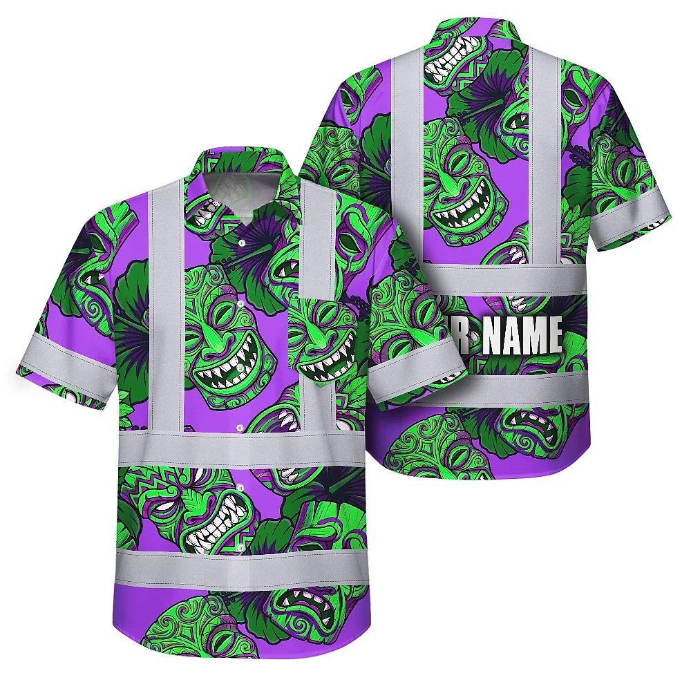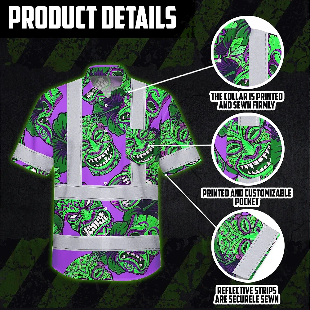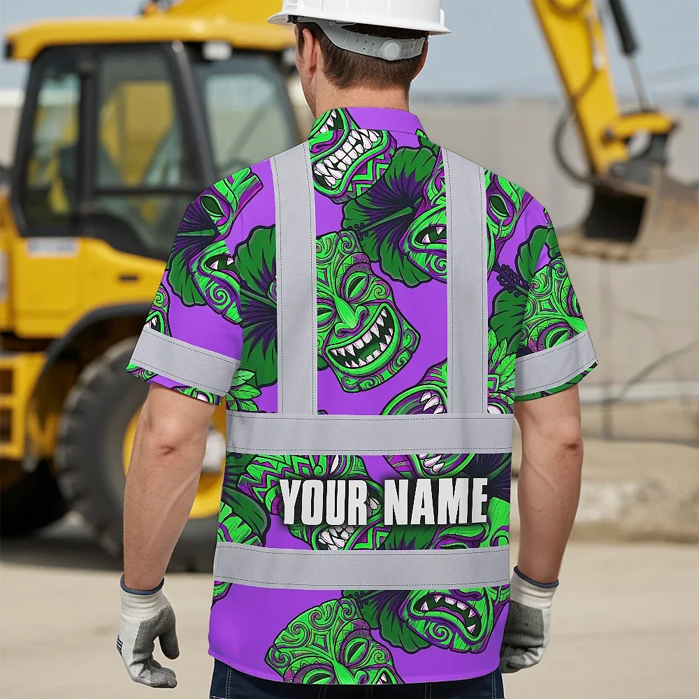 Hi Vis Hawaiian Shirt Reflective Tapes Violet Green Tiki Custom Name Safety Workwear For Workers, Truckers, Operators