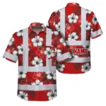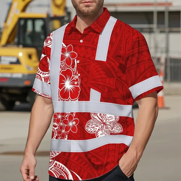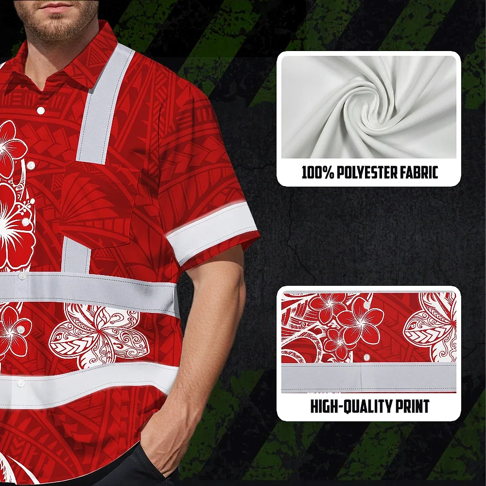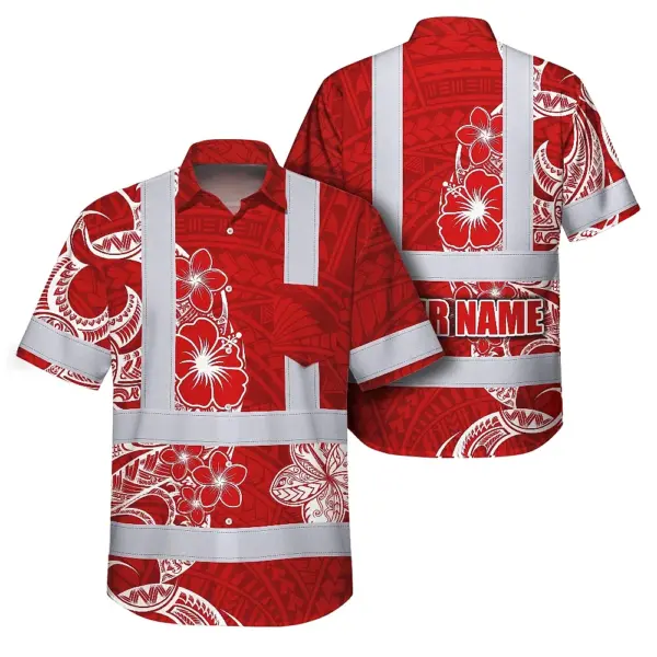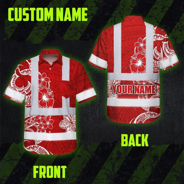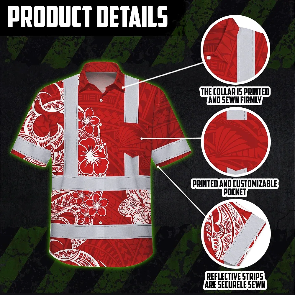 Hi Vis Hawaiian Shirt Reflective Tapes White Red Neon Polynesian Tribal Custom Name Safety Workwear For Workers, Truckers, Operators