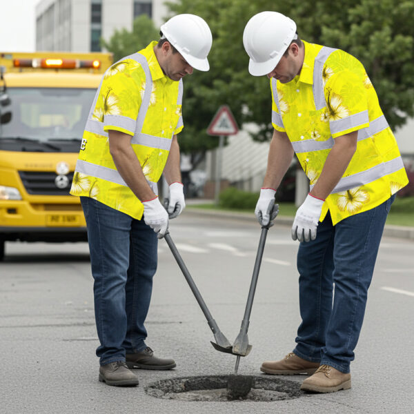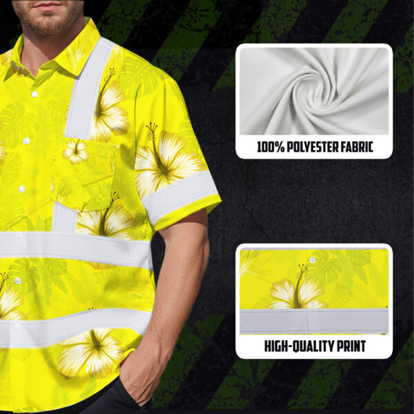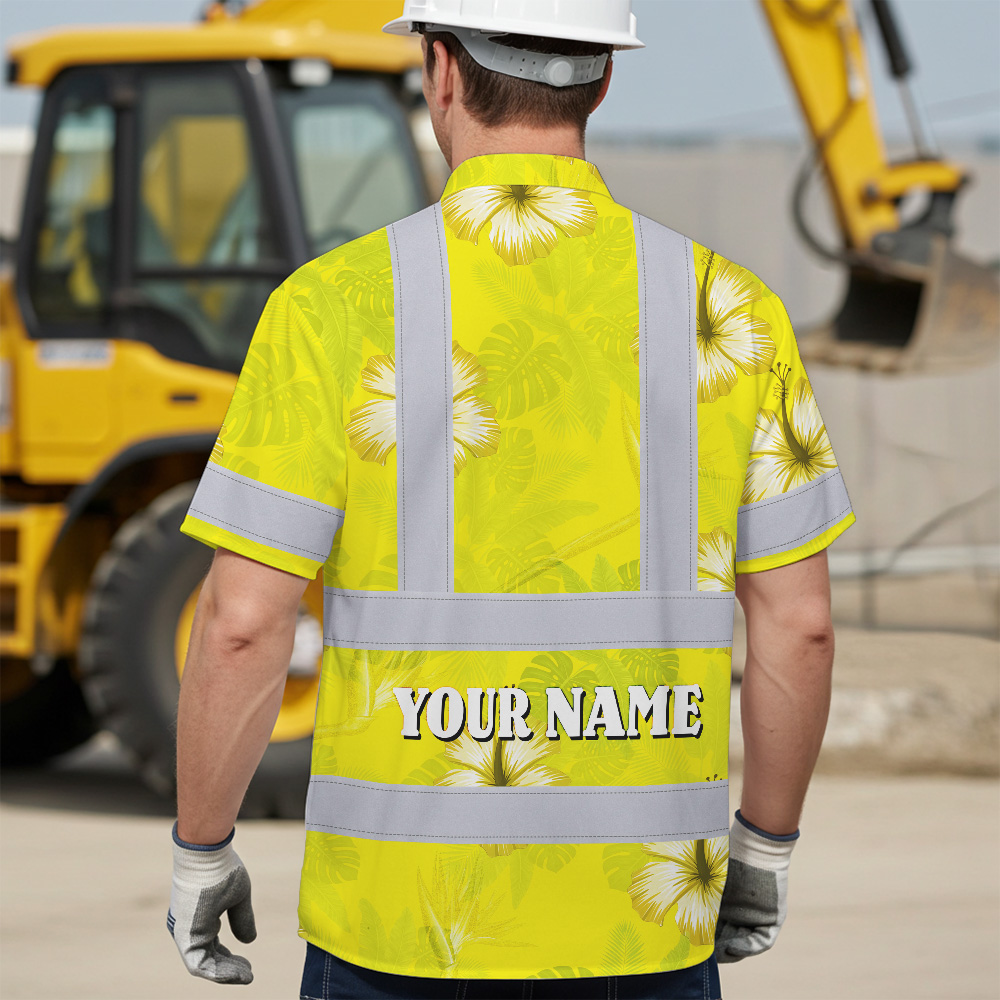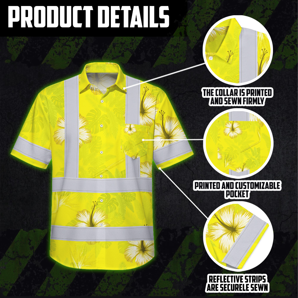 Hi Vis Hawaiian Shirt Reflective Tapes Yellow Neon Custom Name Safety Workwear For Workers, Truckers, Operators