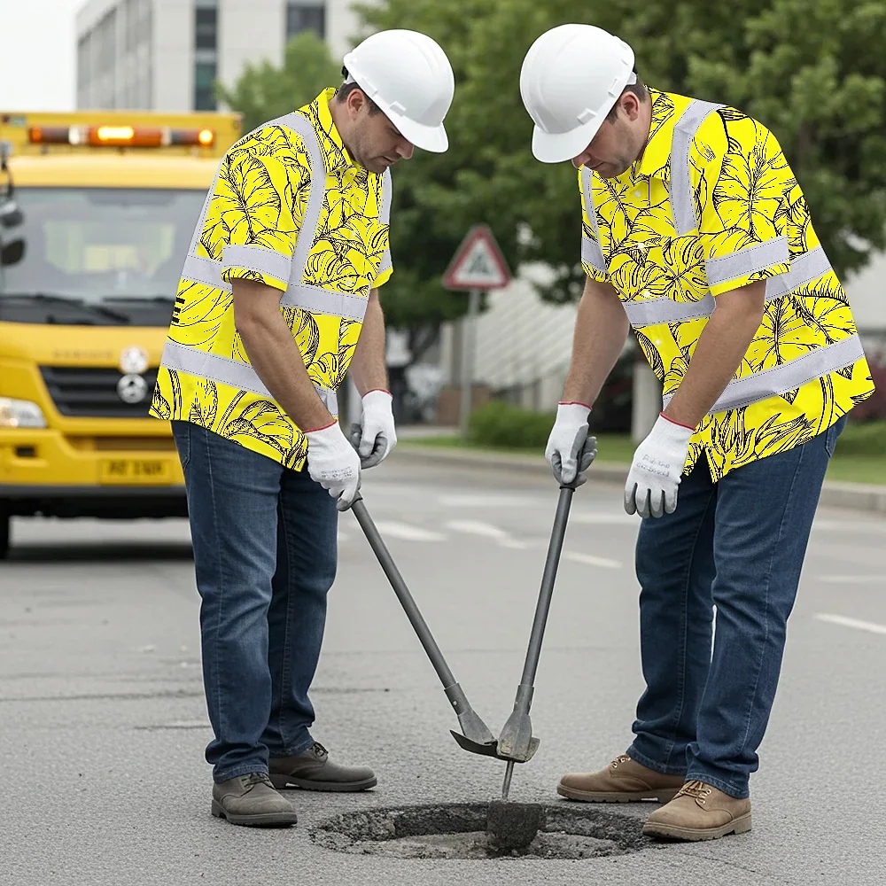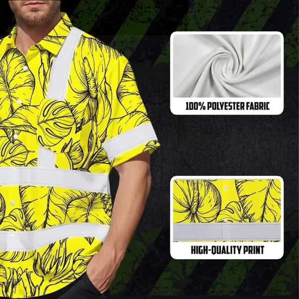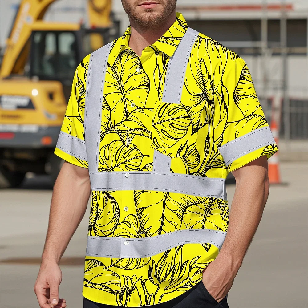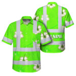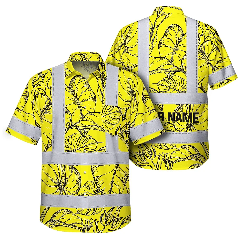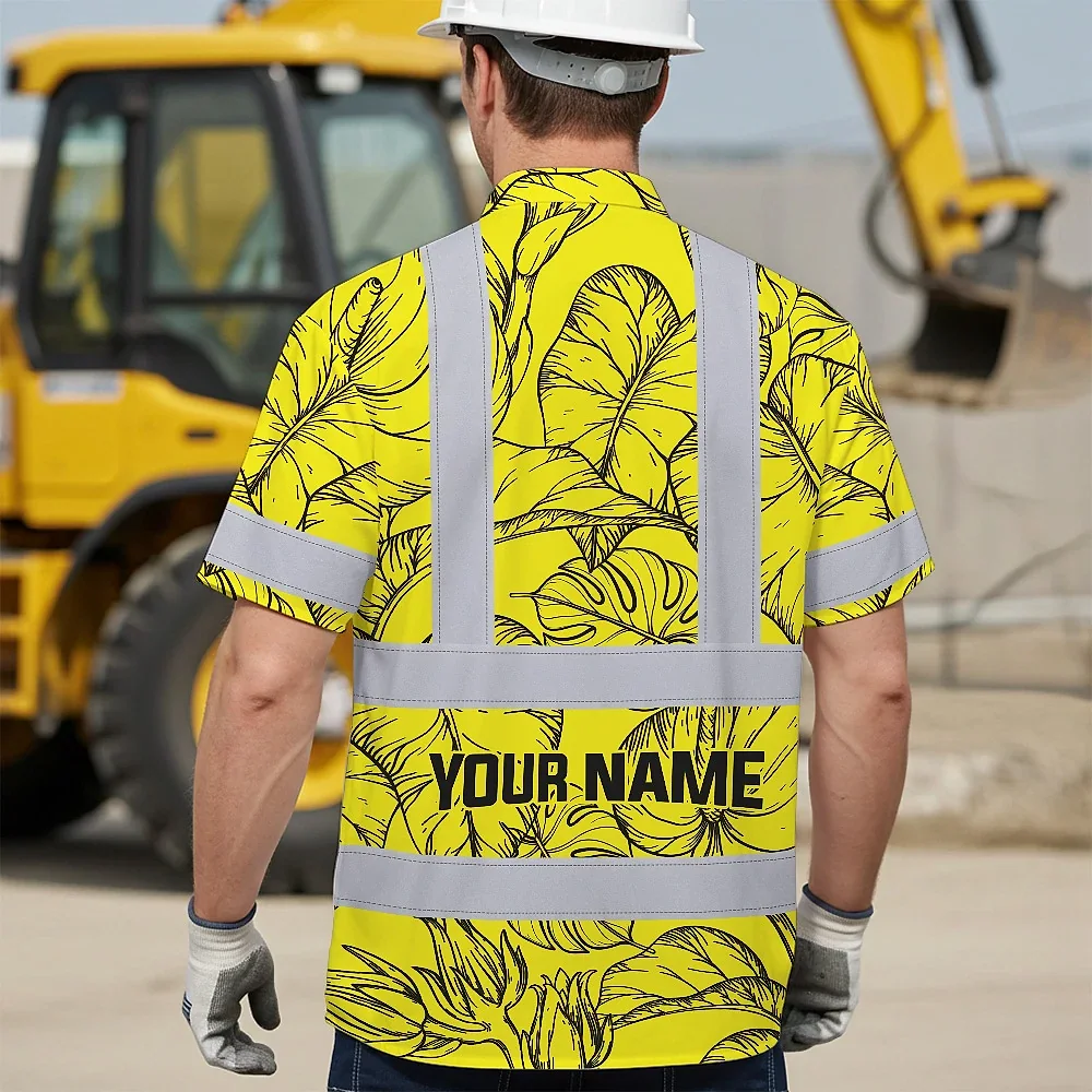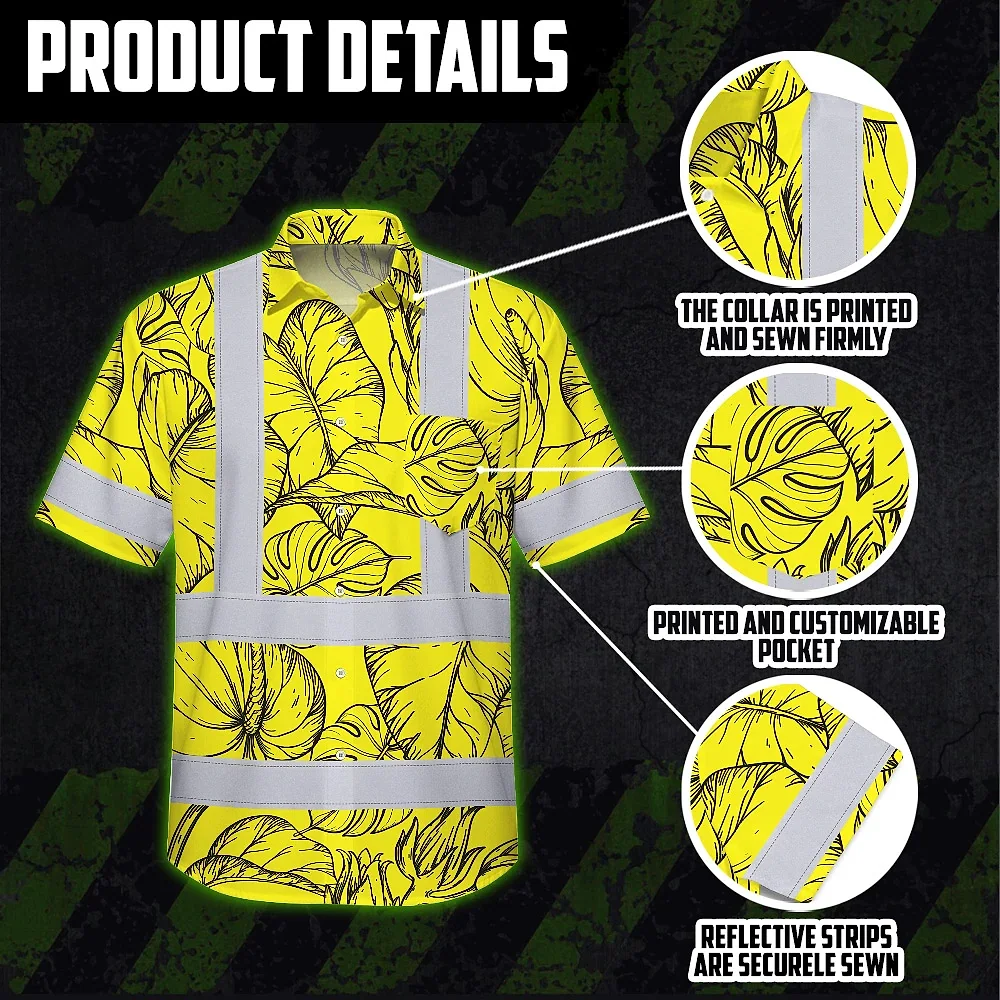 Hi Vis Hawaiian Shirt Reflective Tapes Yellow Neon Flowers Custom Name Safety Workwear For Workers, Truckers, Operators