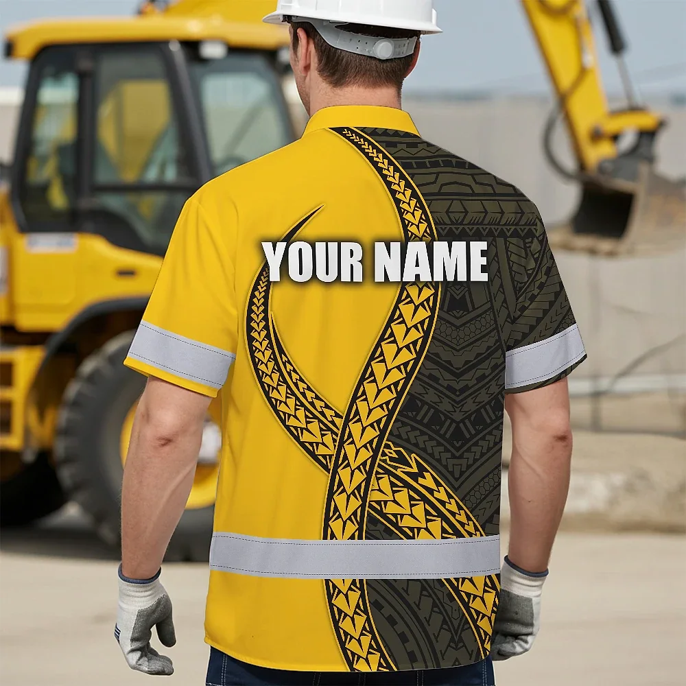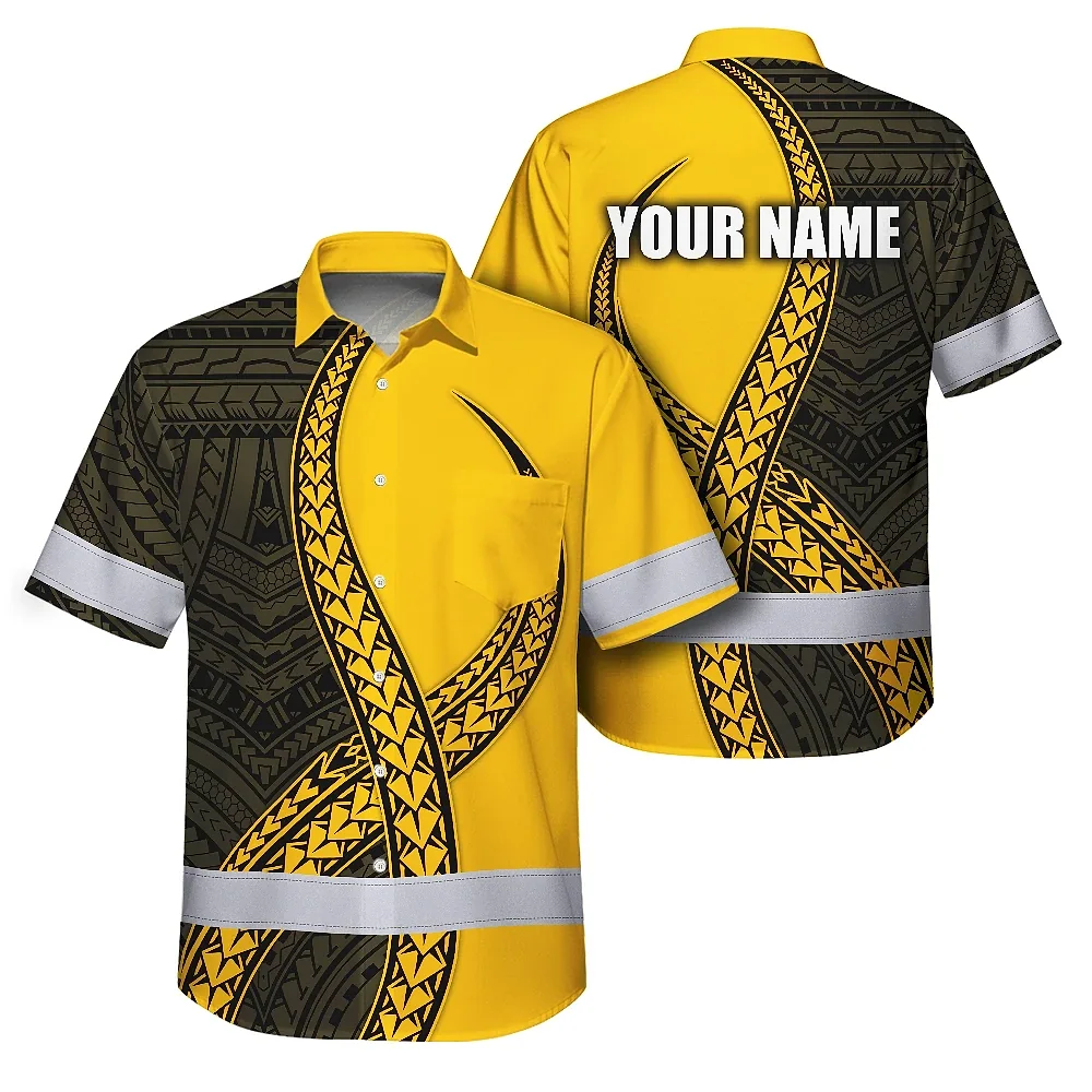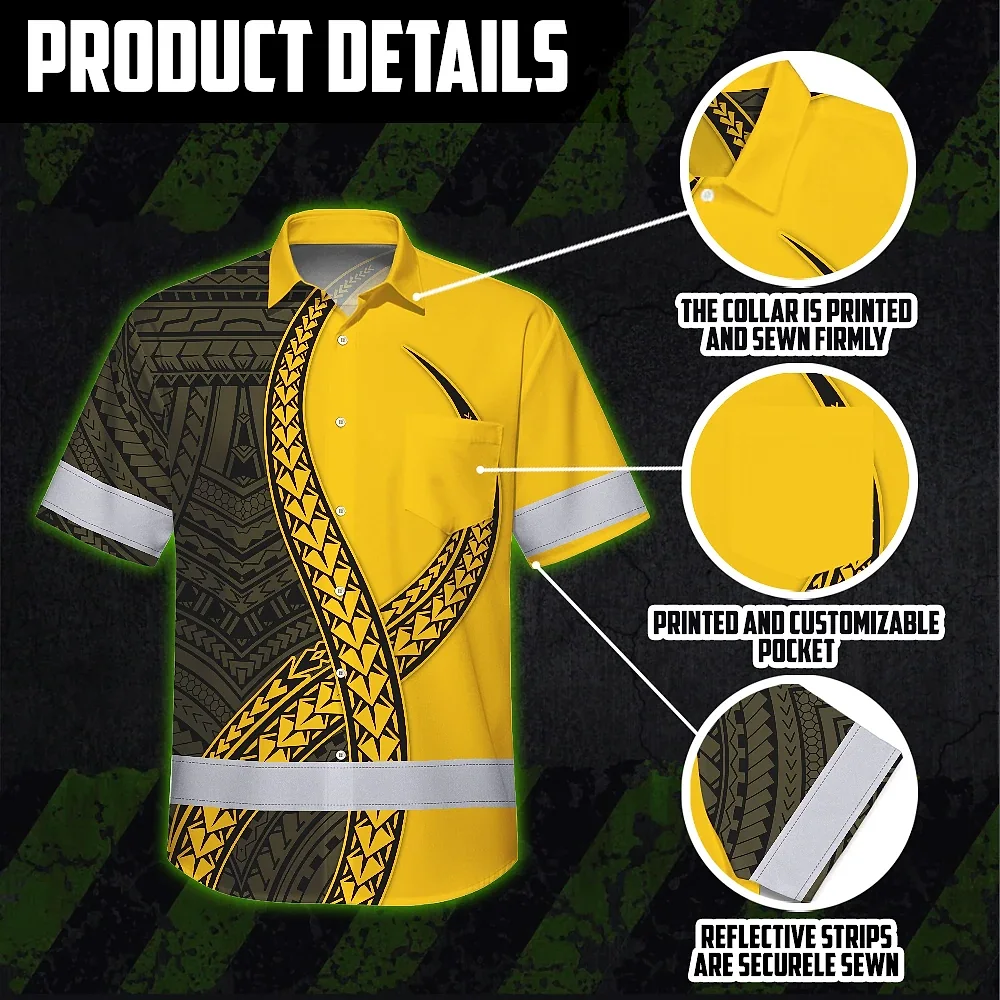Hi Vis Hawaiian Shirt Reflective Tapes Yellow Neon Polynesian Turtle Custom Name Safety Workwear For Workers, Truckers, Operators
