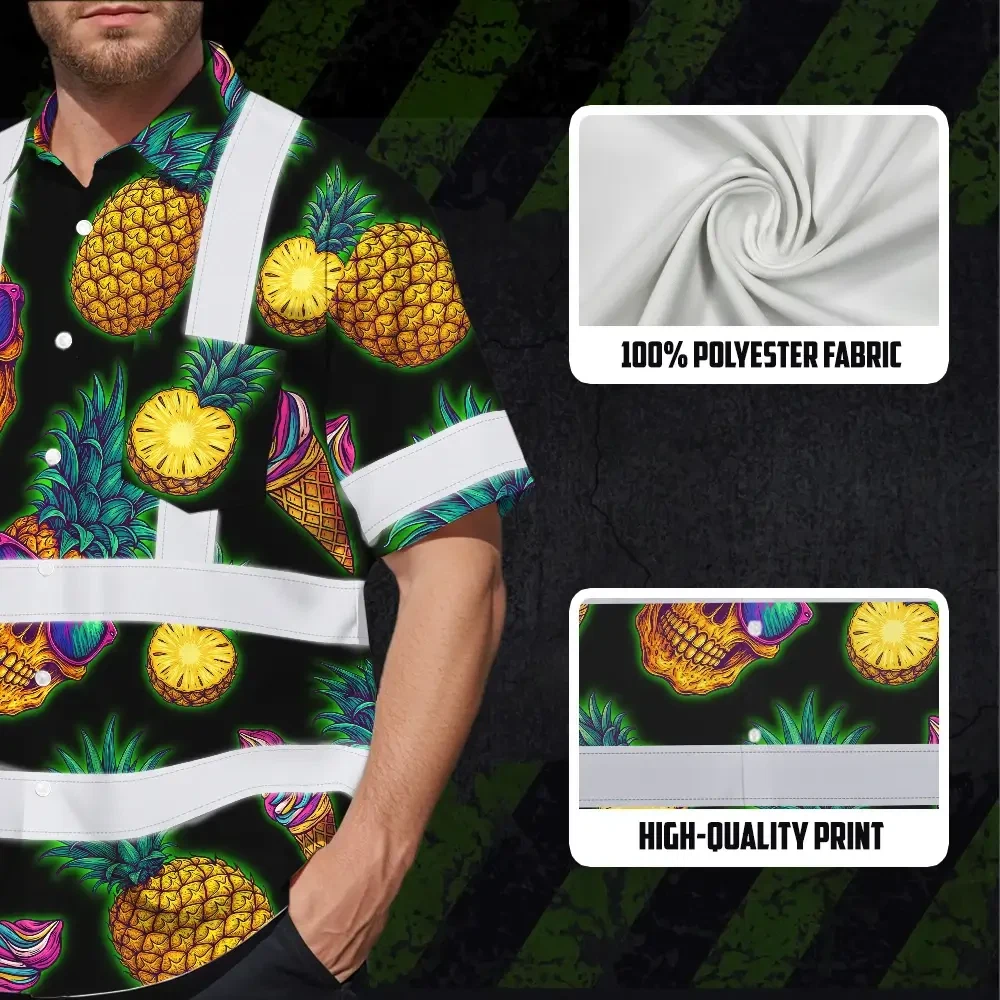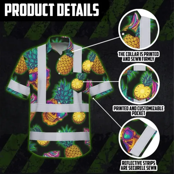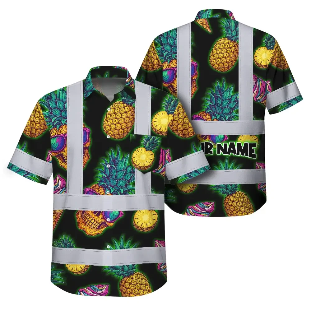 Hi Vis Hawaiian Shirt Reflective Tapes Yellow Neon Skull Custom Name Safety Workwear For Workers, Truckers, Operators
