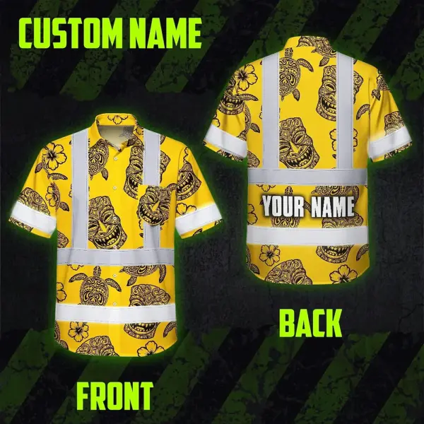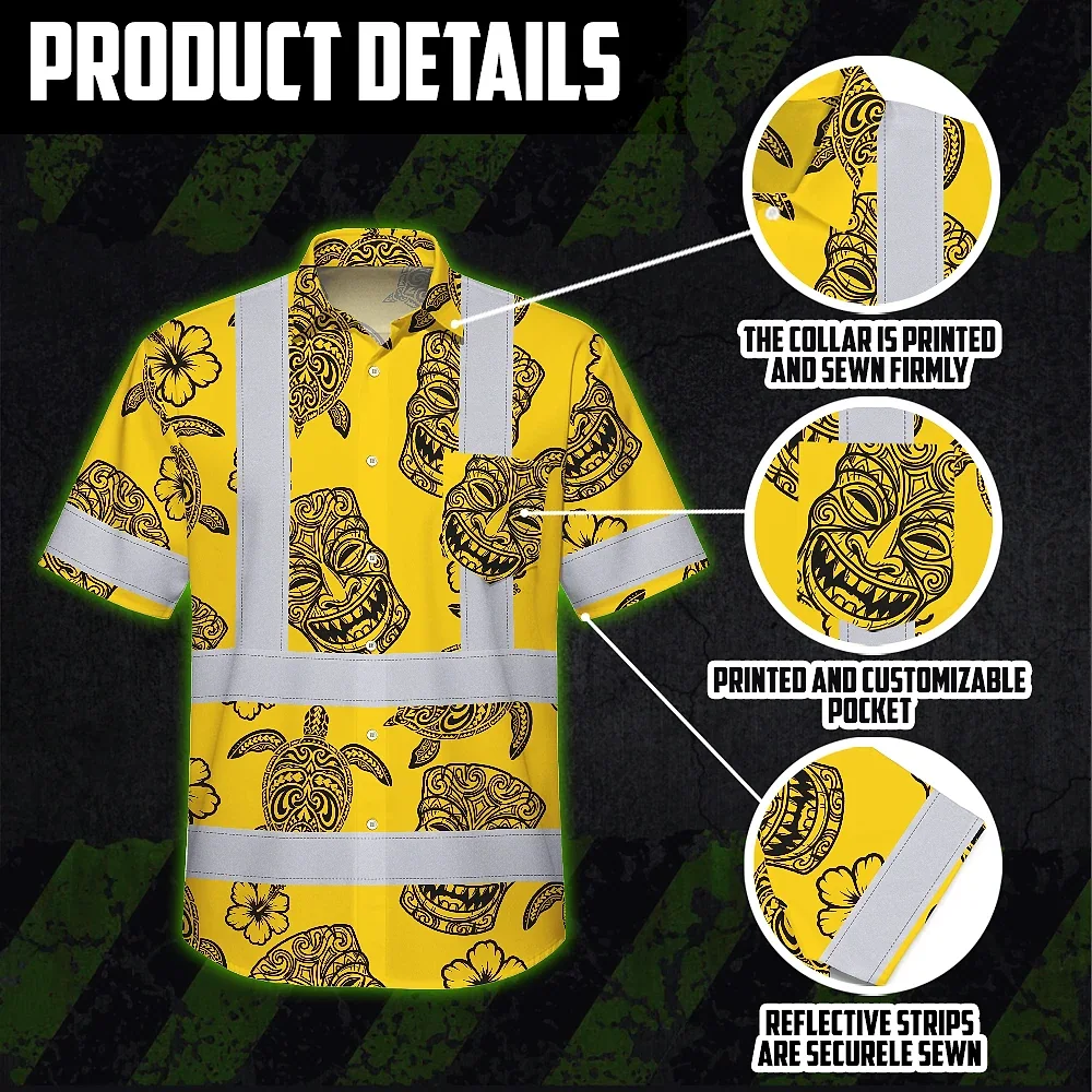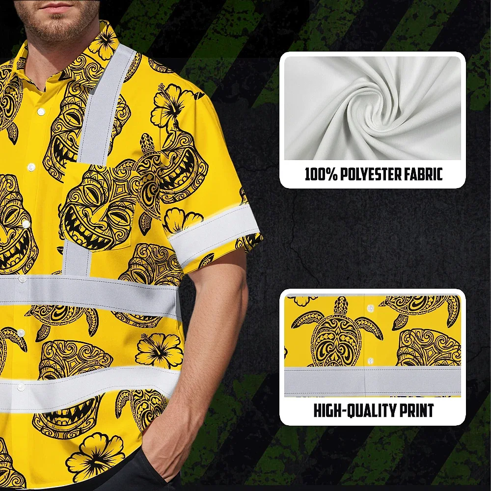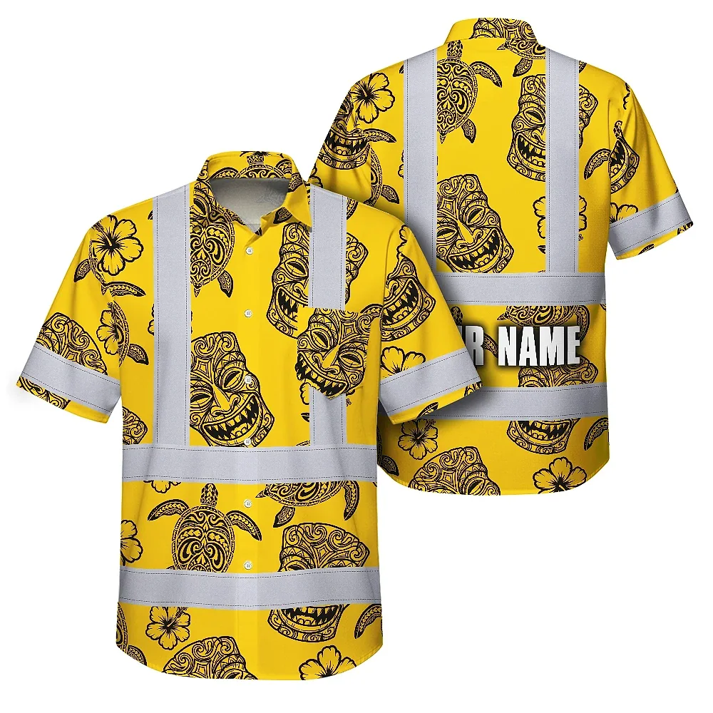 Hi Vis Hawaiian Shirt Reflective Tapes Yellow Neon Tiki Custom Name Safety Workwear For Workers, Truckers, Operators