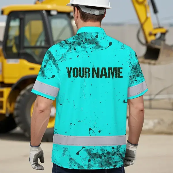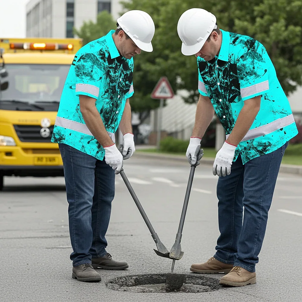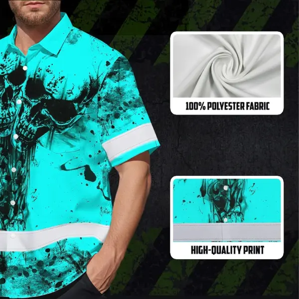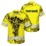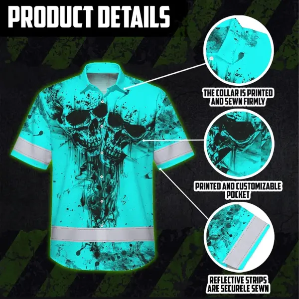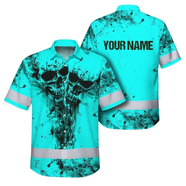 Hi Vis Hawaiian Skull Shirt, Blue Neon Custom Name High Visibility Short Sleeve Button Down Shirt for Workers, Truckers