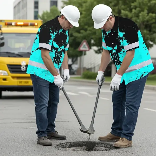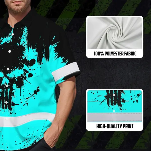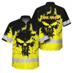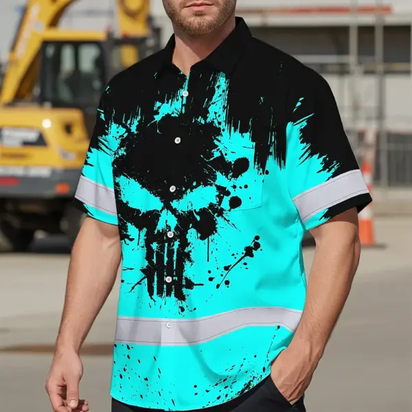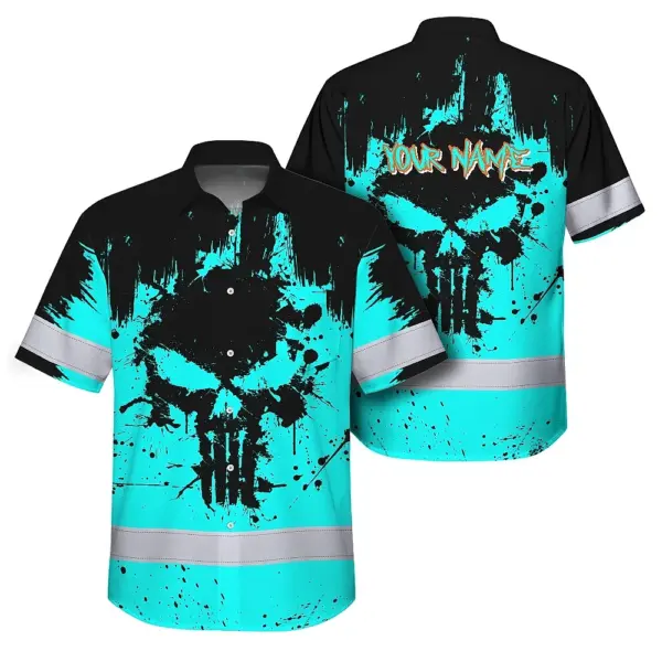 Hi Vis Hawaiian Skull Shirt, Blue Neon Custom Name High Visibility Short Sleeve Button Down Shirt for Workers, Truckers