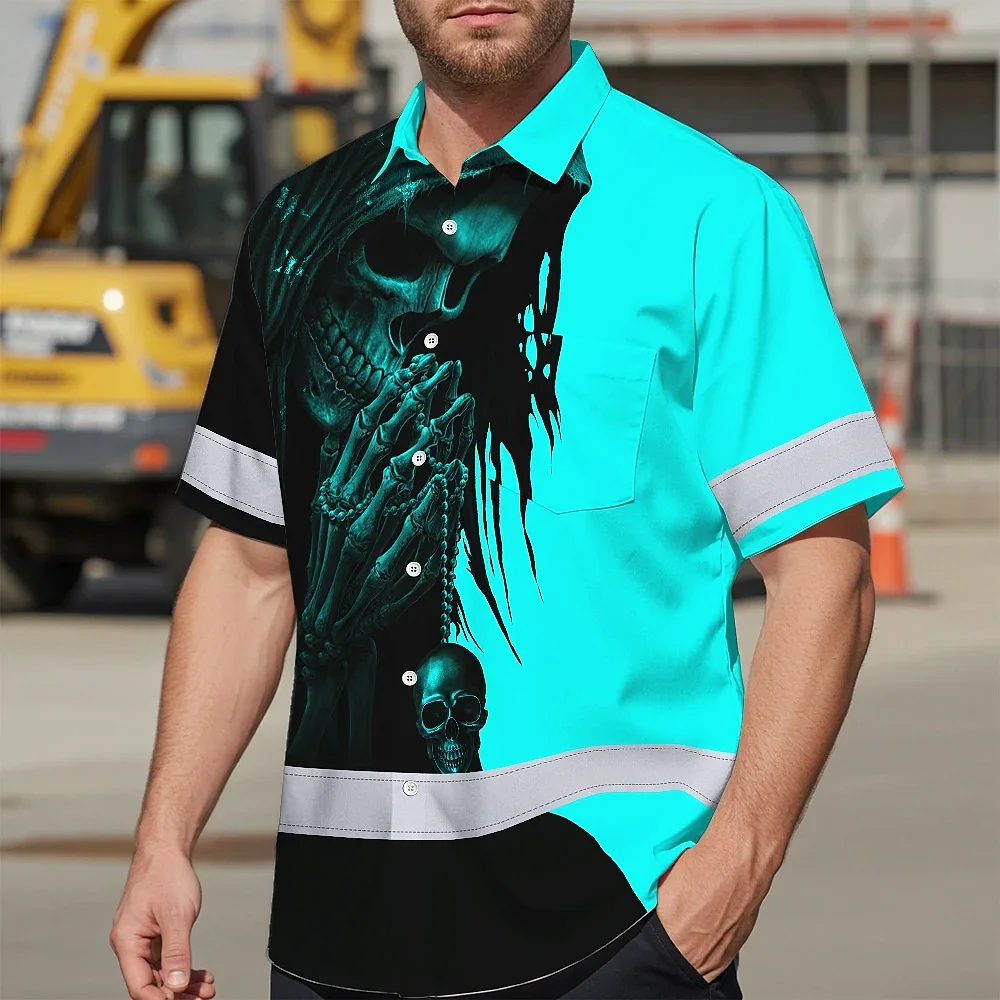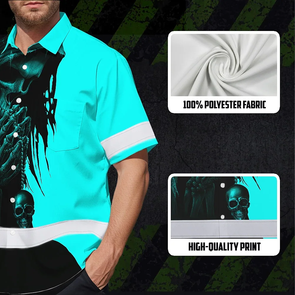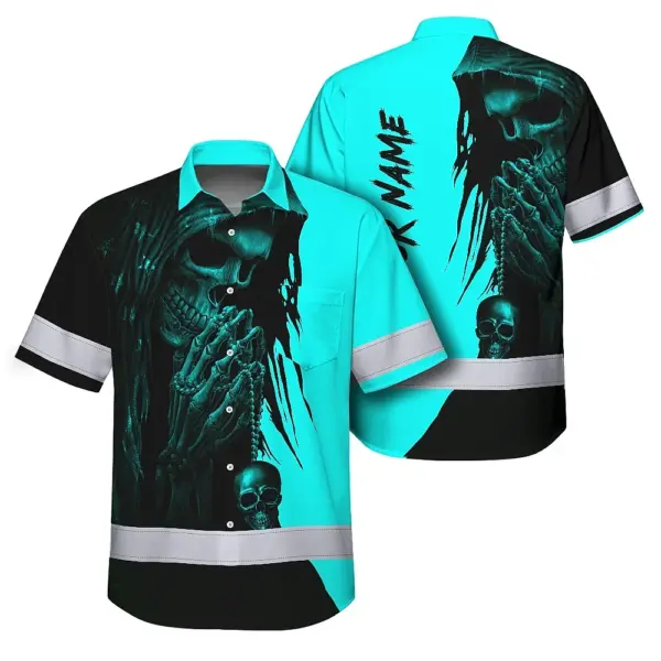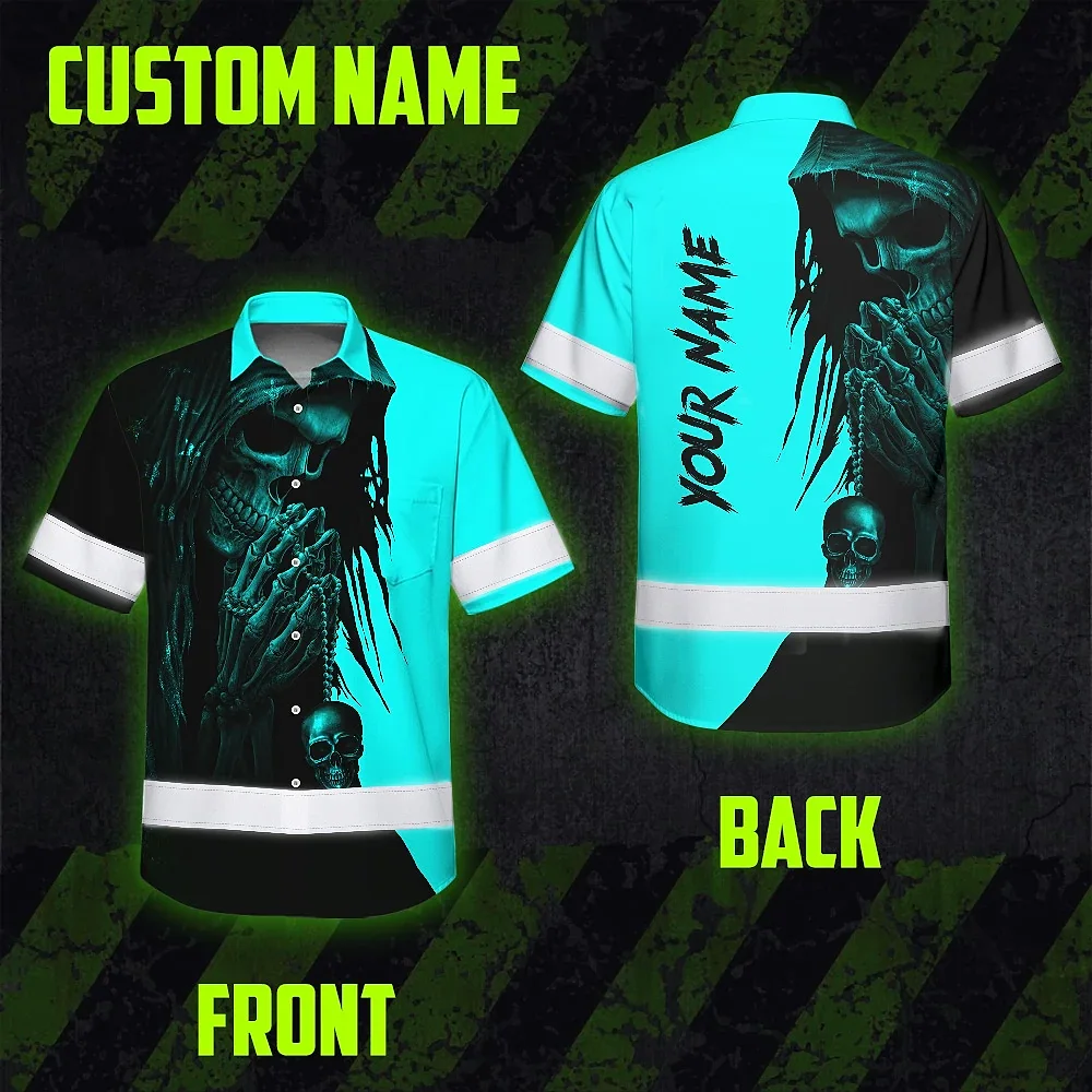 Hi Vis Hawaiian Skull Shirt, Blue Neon Custom Name High Visibility Short Sleeve Button Down Shirt for Workers, Truckers