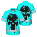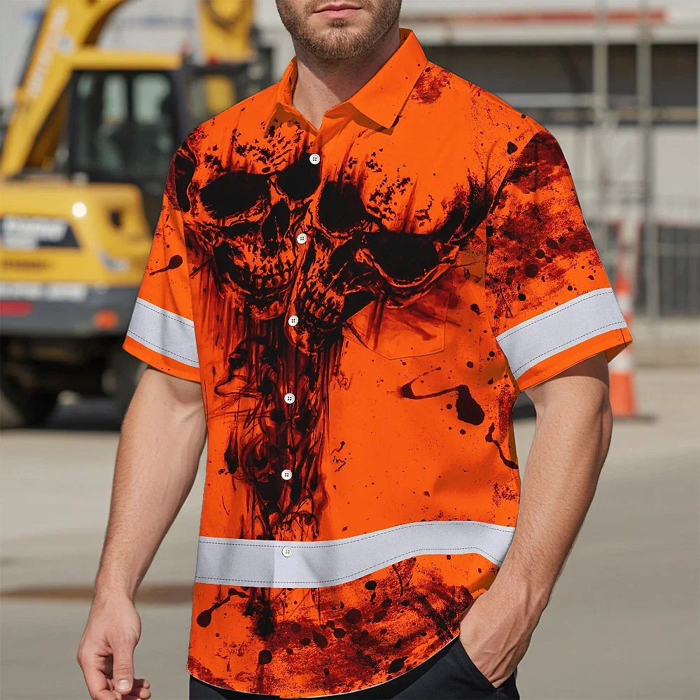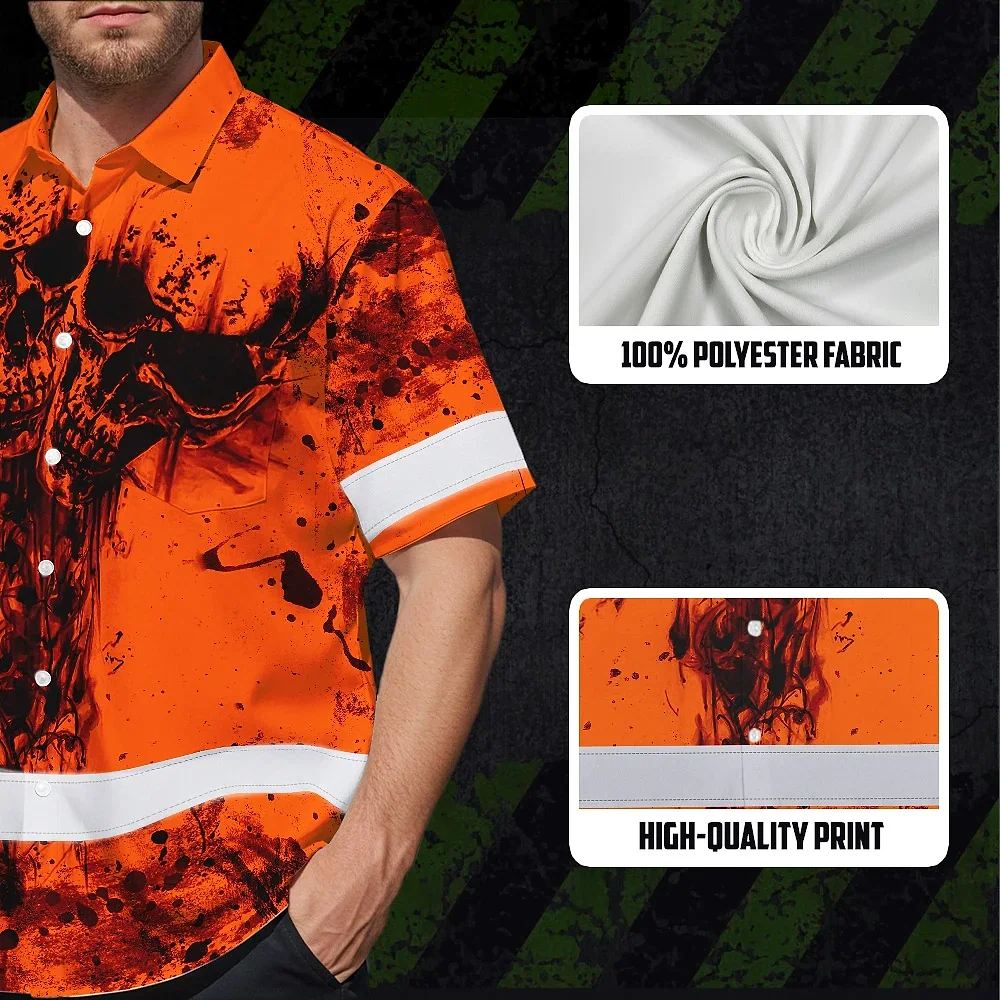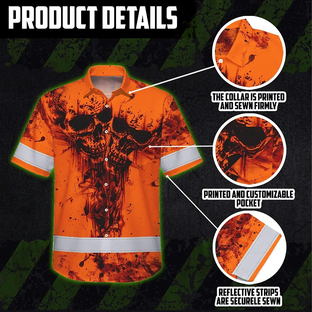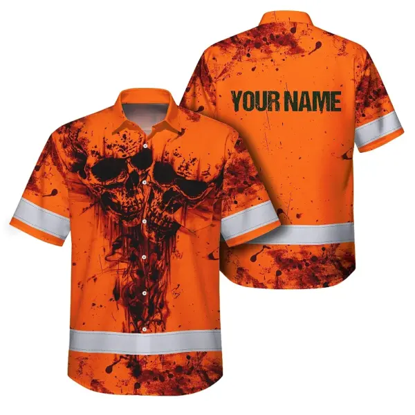 Hi Vis Hawaiian Skull Shirt, Orange Neon Custom Name High Visibility Short Sleeve Button Down Shirt for Workers, Truckers