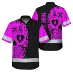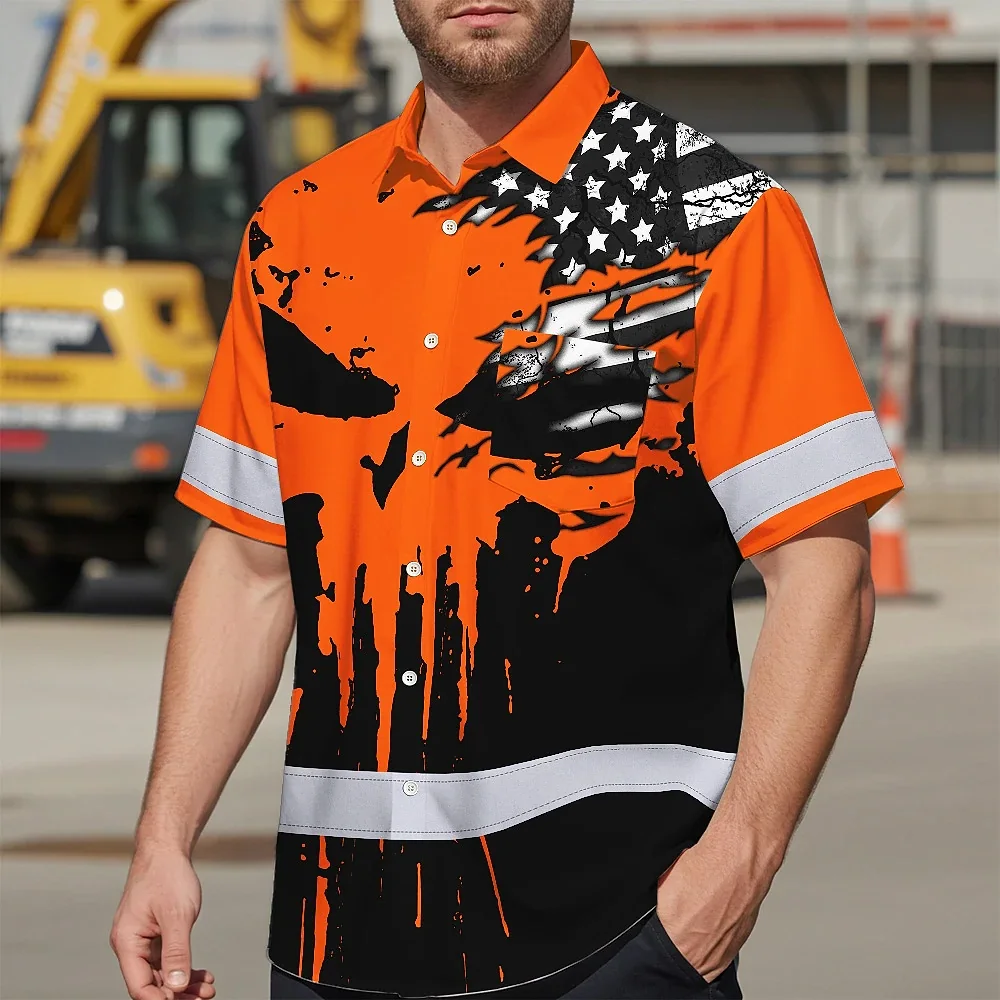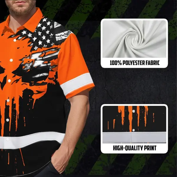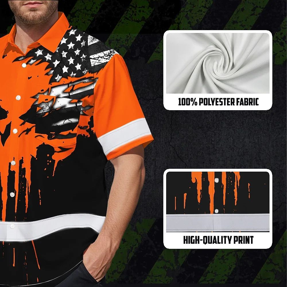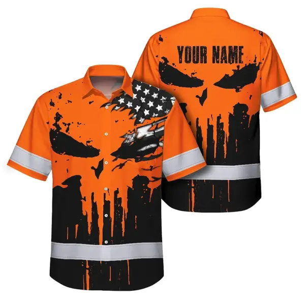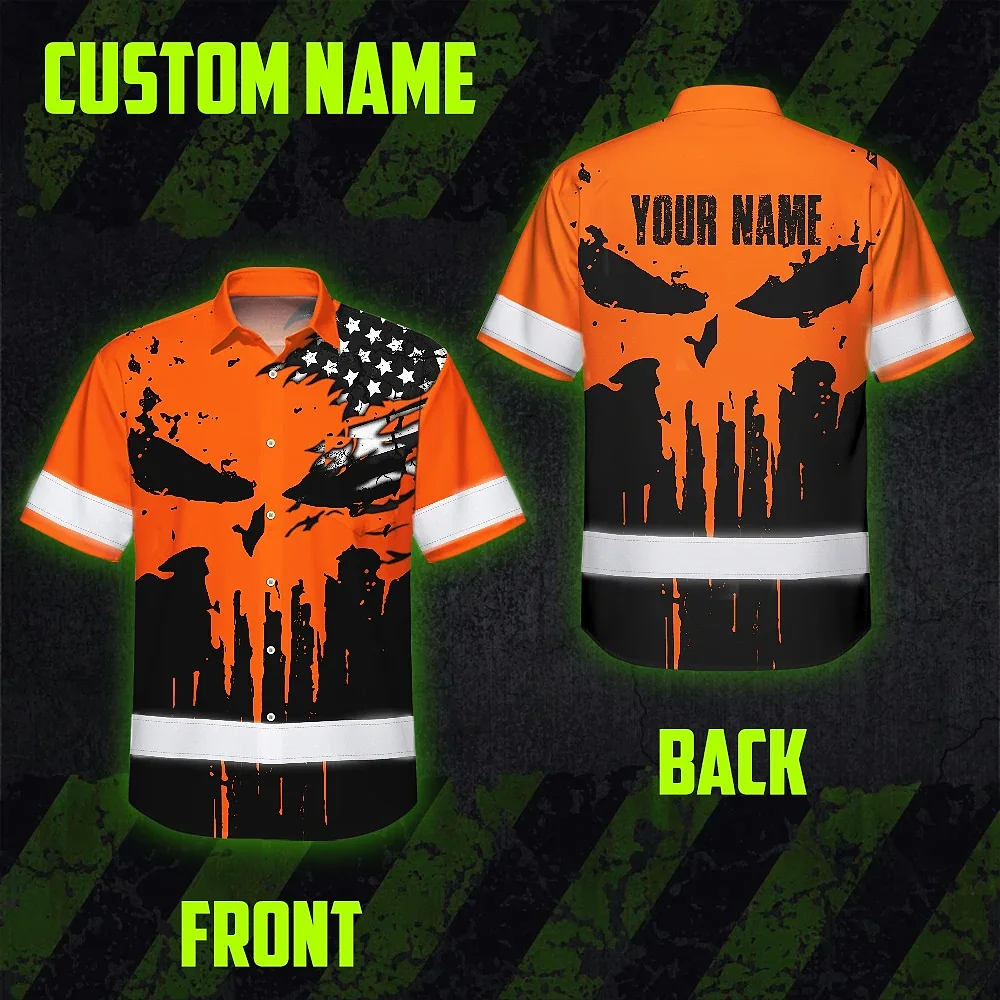 Hi Vis Hawaiian Skull Shirt, Orange Neon Custom Name High Visibility Short Sleeve Button Down Shirt for Workers, Truckers