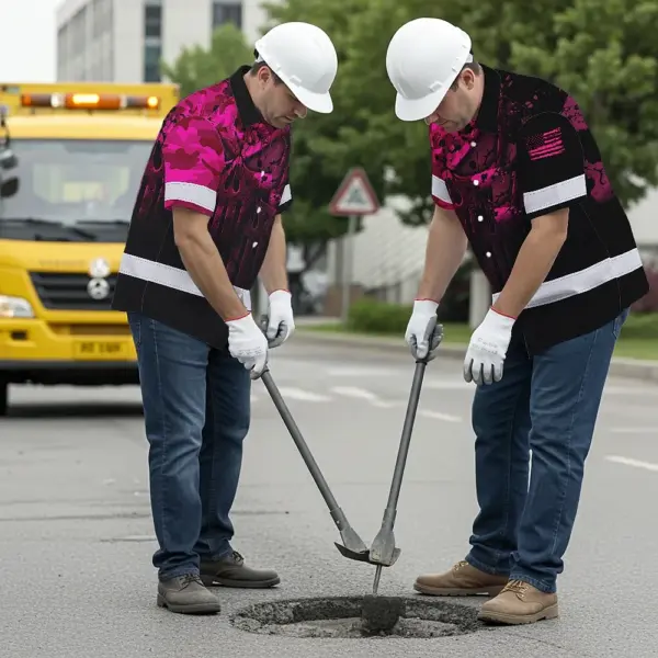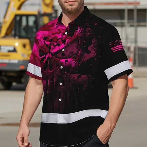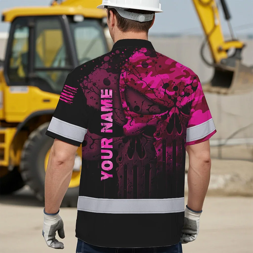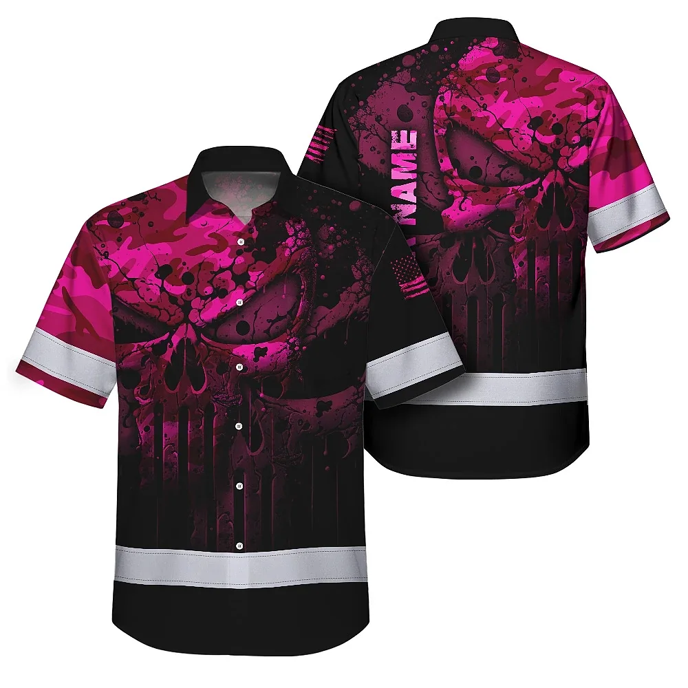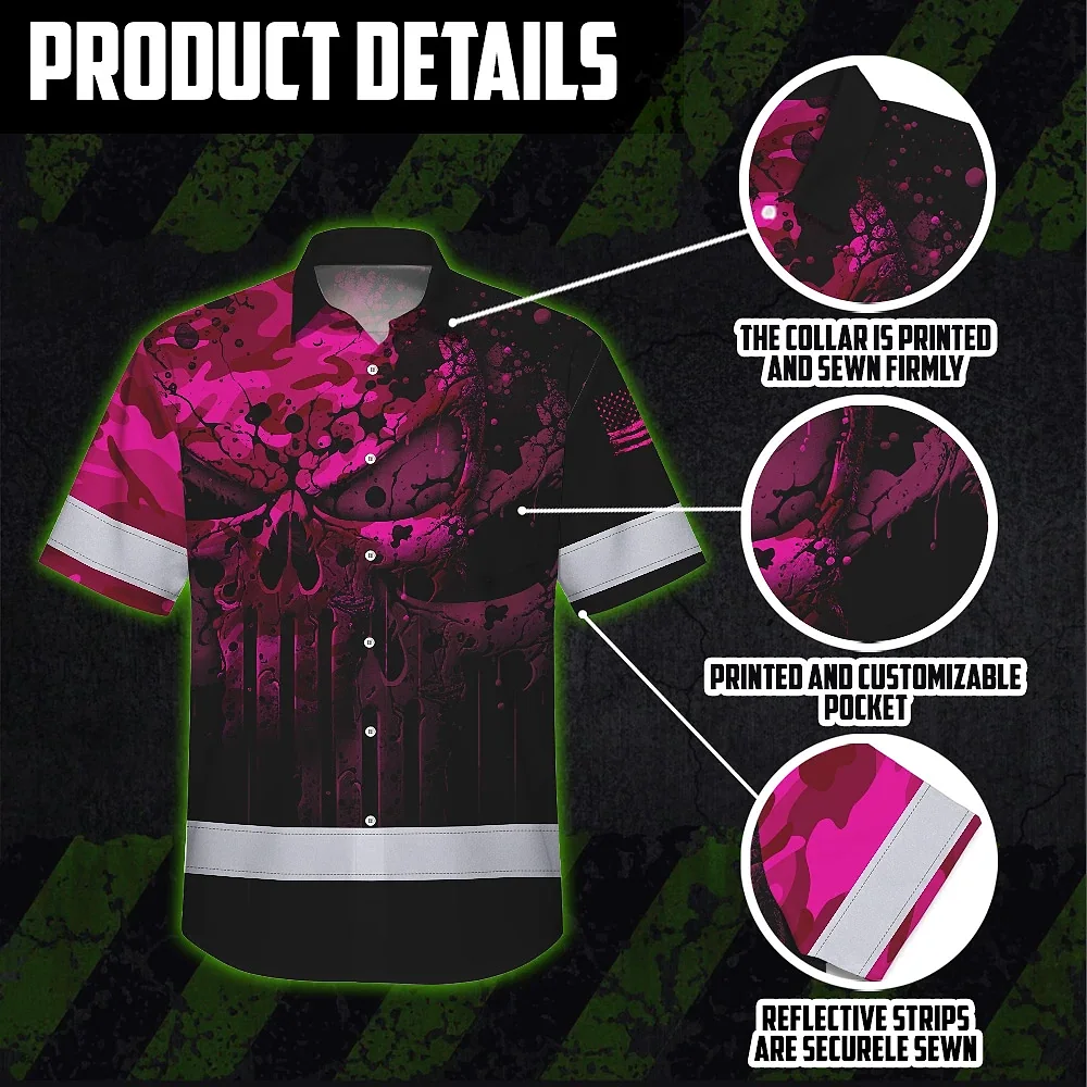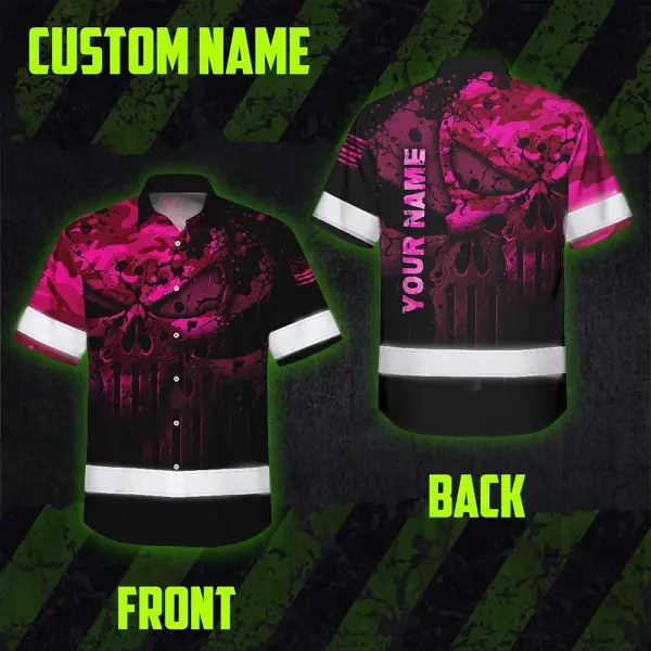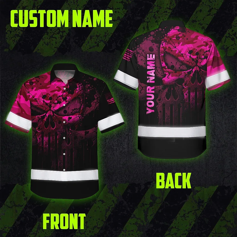 Hi Vis Hawaiian Skull Shirt, Pink Neon Custom Name High Visibility Short Sleeve Button Down Shirt for Workers, Truckers