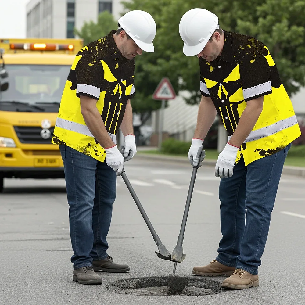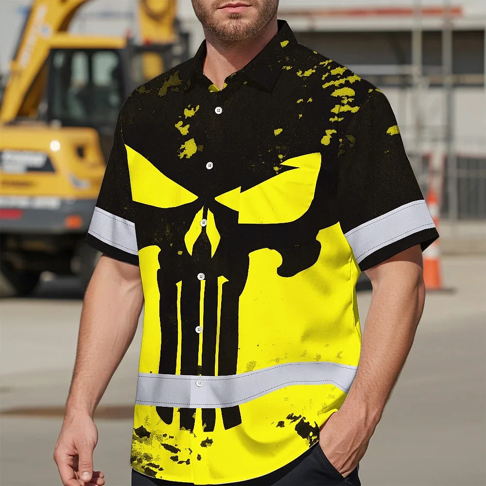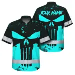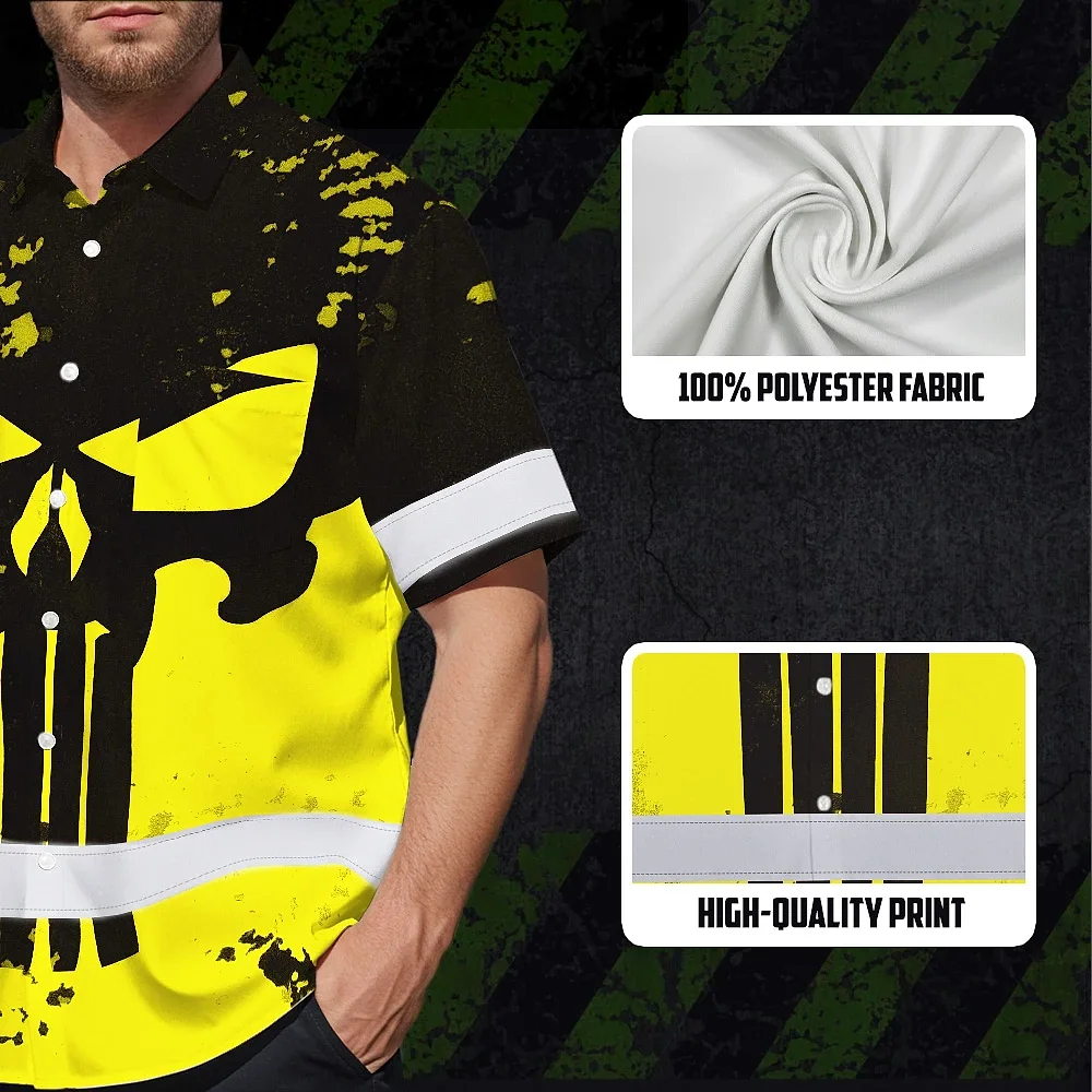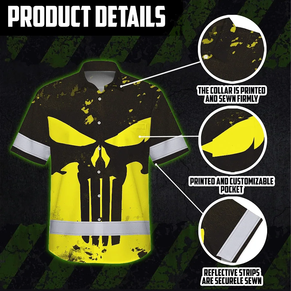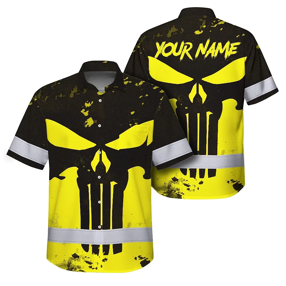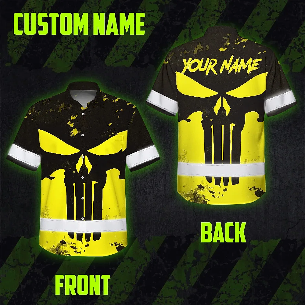 Hi Vis Hawaiian Skull Shirt, Yellow Neon Custom Name High Visibility Short Sleeve Button Down Shirt for Workers, Truckers