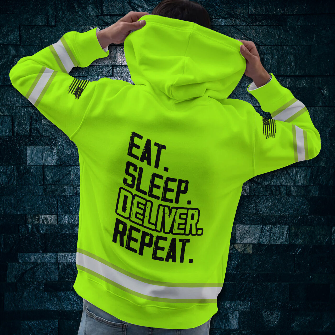 Hi Vis Hoodie Eat Sleep Deliver Repeat Custom Name and Logo Company Name Safety Workwear