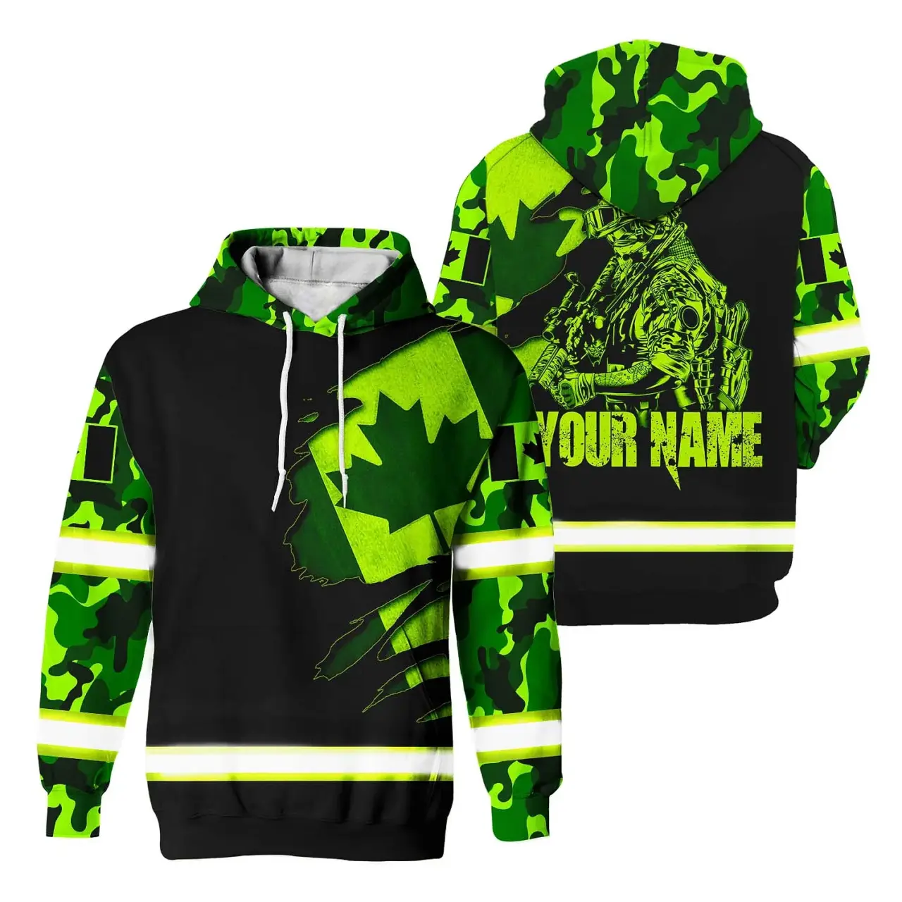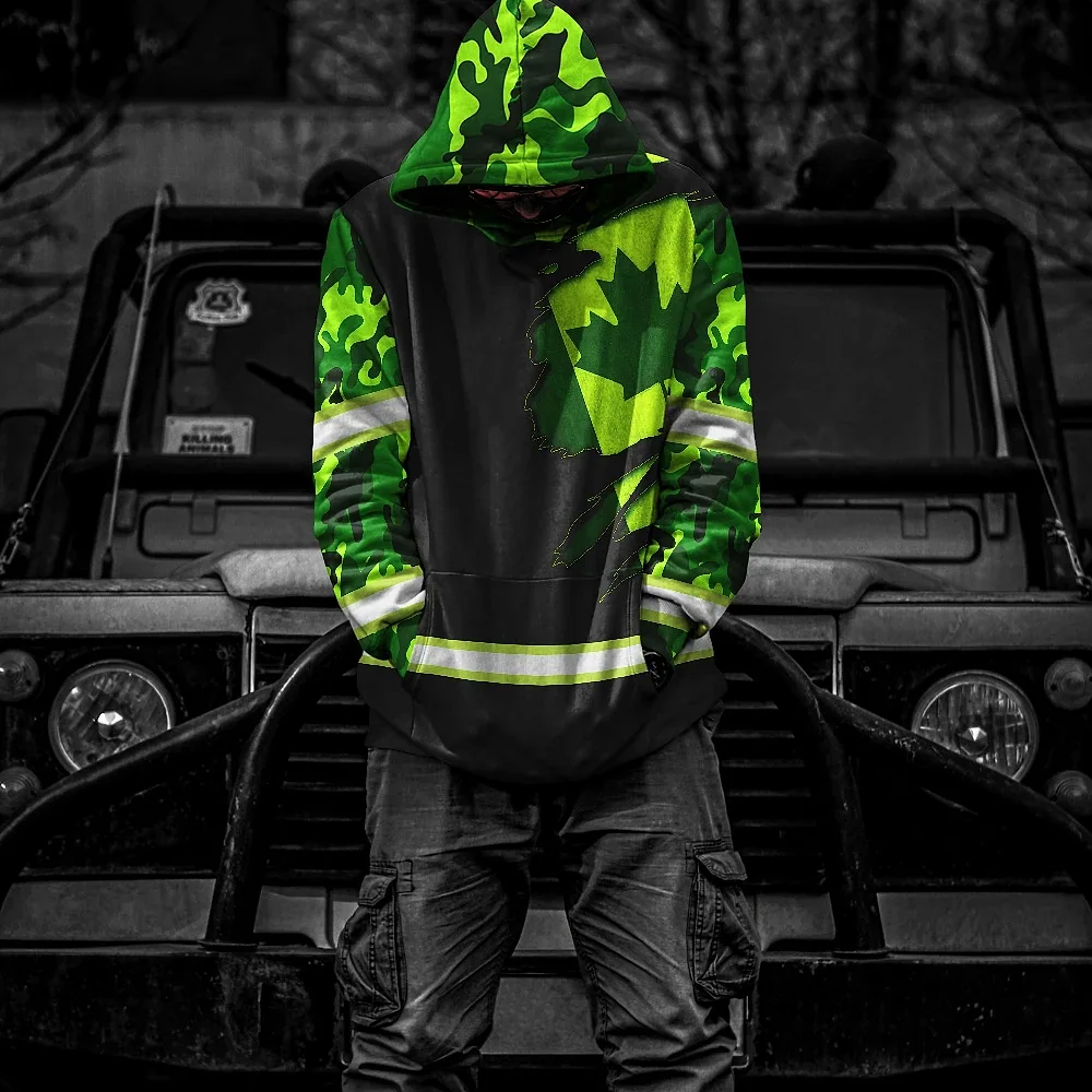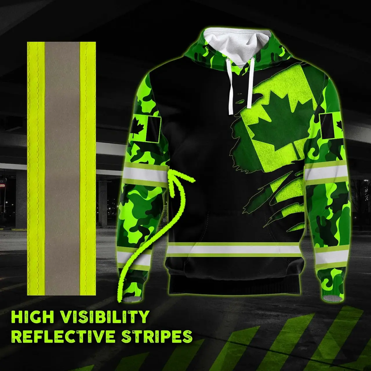 Hi Vis Hoodie Reflective Canada Flag Scratch Green Neon Veteran Custom Name Safety Workwear For Worker, Operator, Patriotic