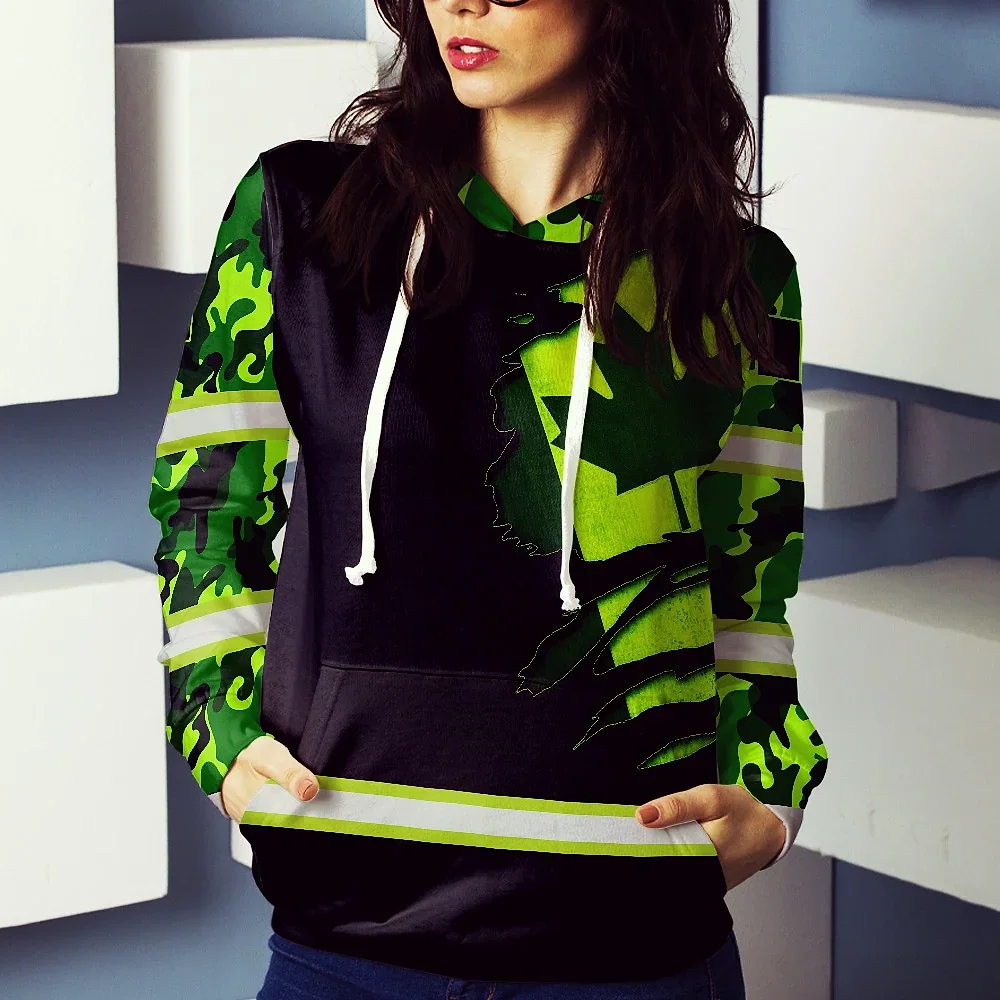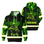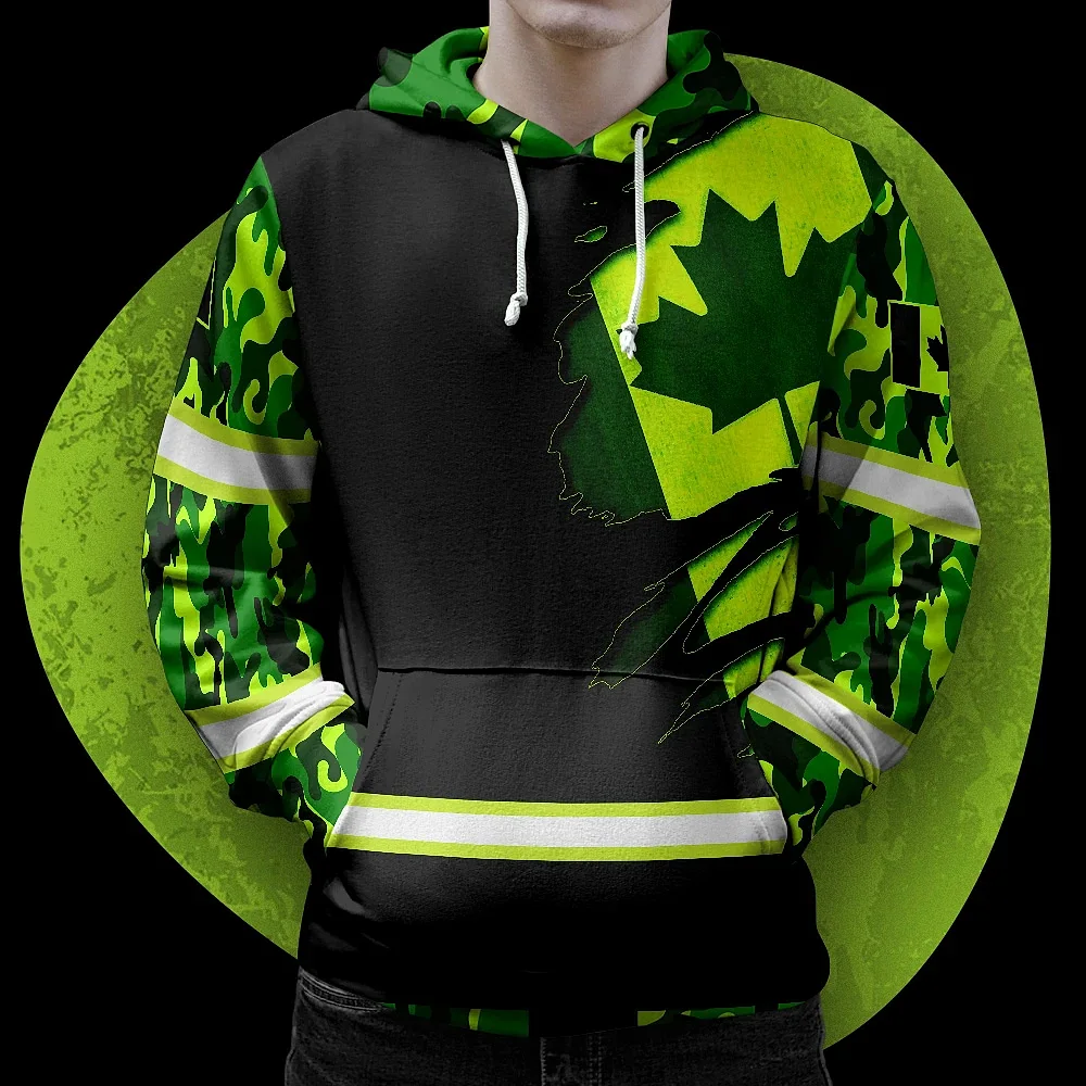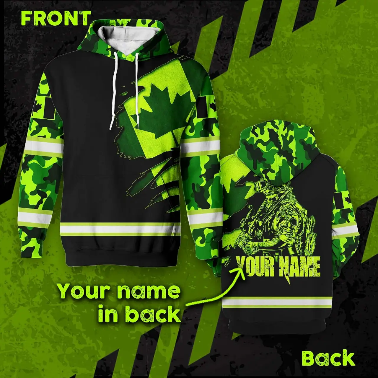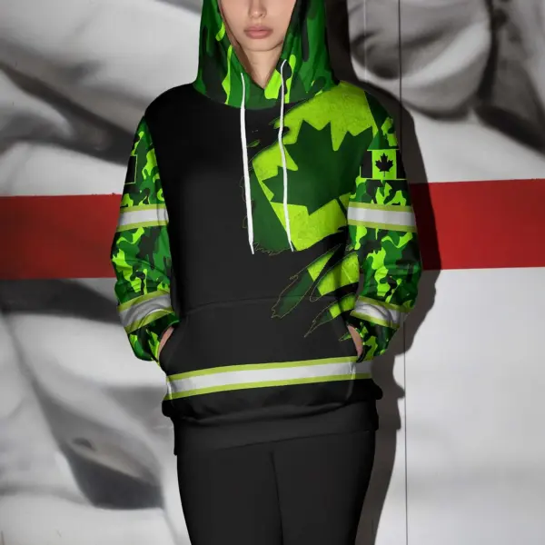 Hi Vis Hoodie Reflective Canada Flag Scratch Green Neon Veteran Custom Name Safety Workwear For Worker, Operator, Patriotic