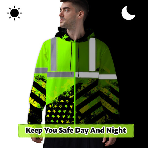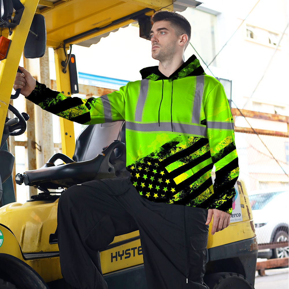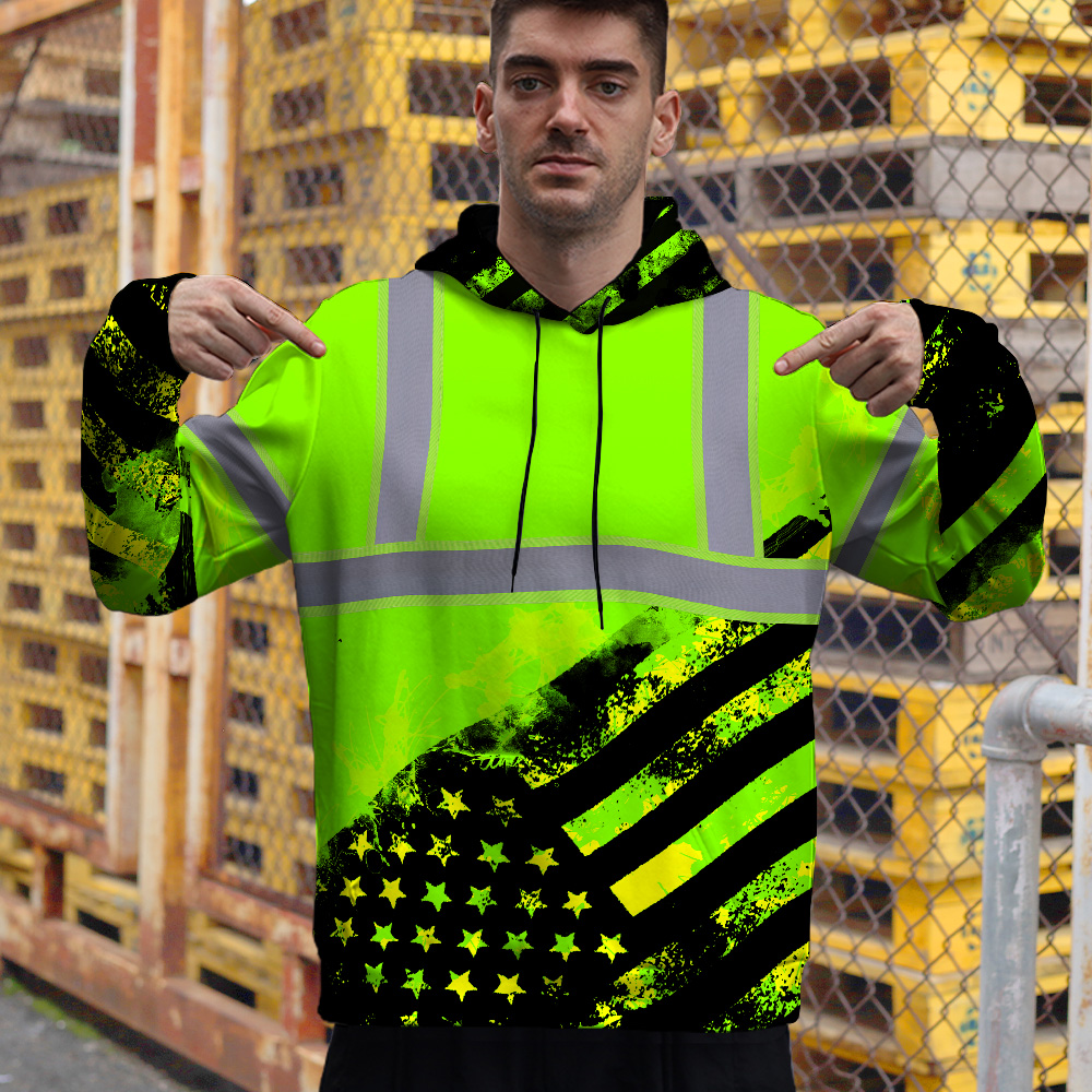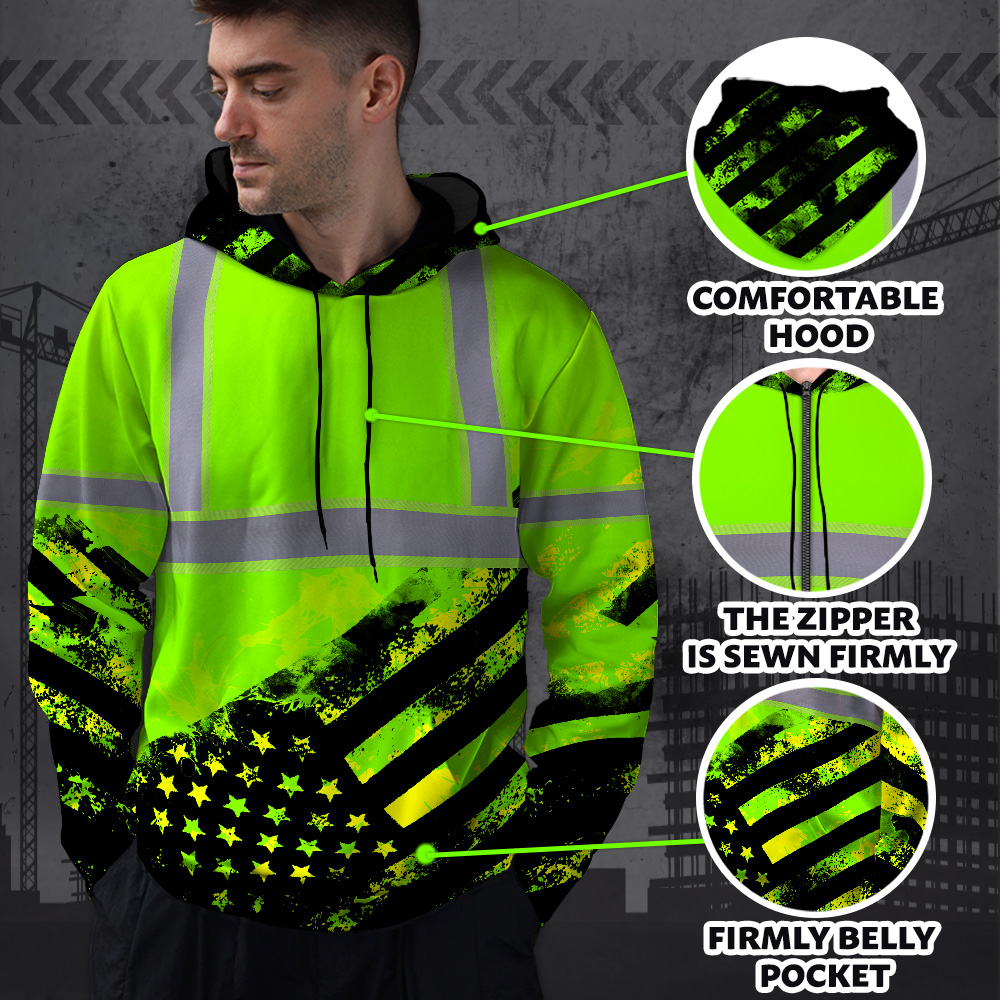 Select options This product has multiple variants. The options may be chosen on the product pageHi Vis Hoodie Patriotic Collection, Hi Vis Hoodies, Hi Vis Patriotic Products, Hi Vis Shirts, Reflective Safety HoodieHi Vis Hoodie Reflective Black Lime USA Flag Safety Workwear For Workers, Runners, Cyclists