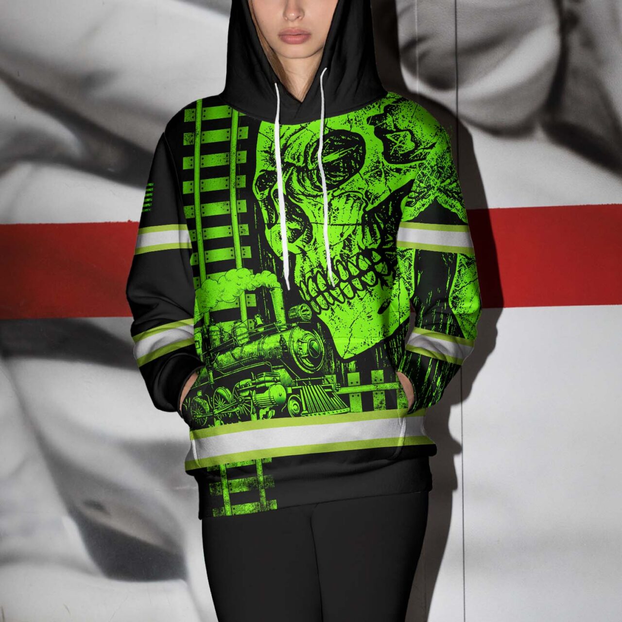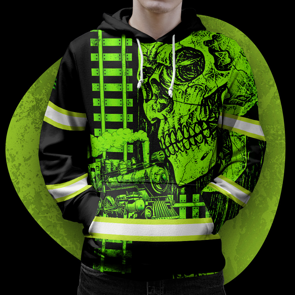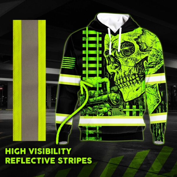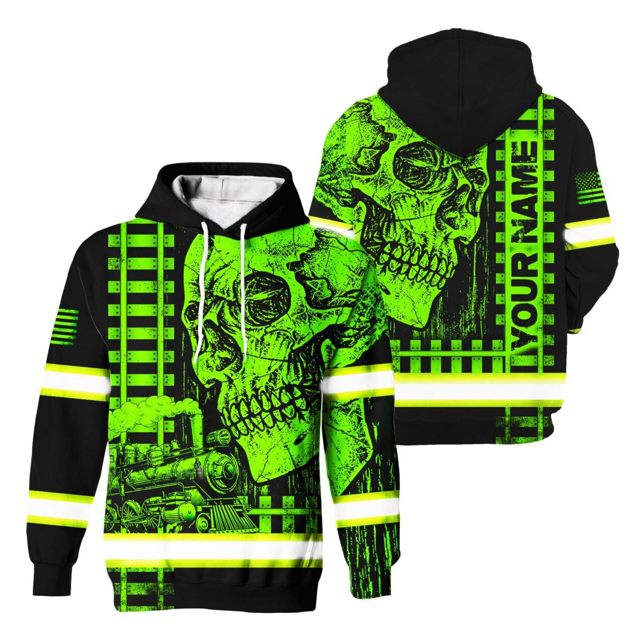 Hi Vis Hoodie Reflective Green Neon Skull US Flag Railroad Custom Name Safety Workwear For Workers, Runners, Cyclists, Patriotic