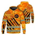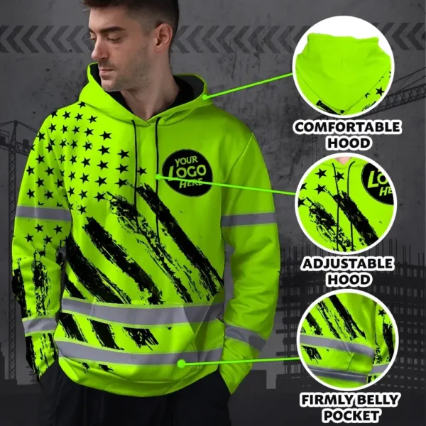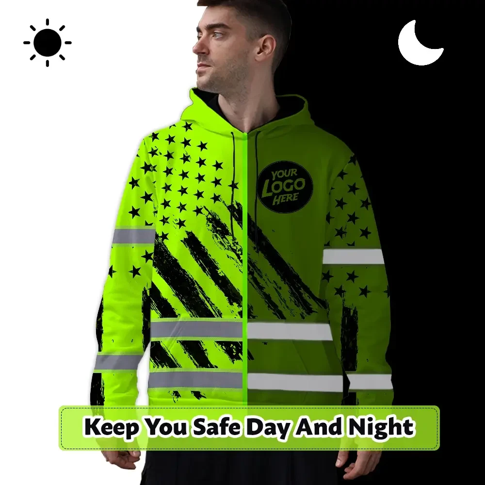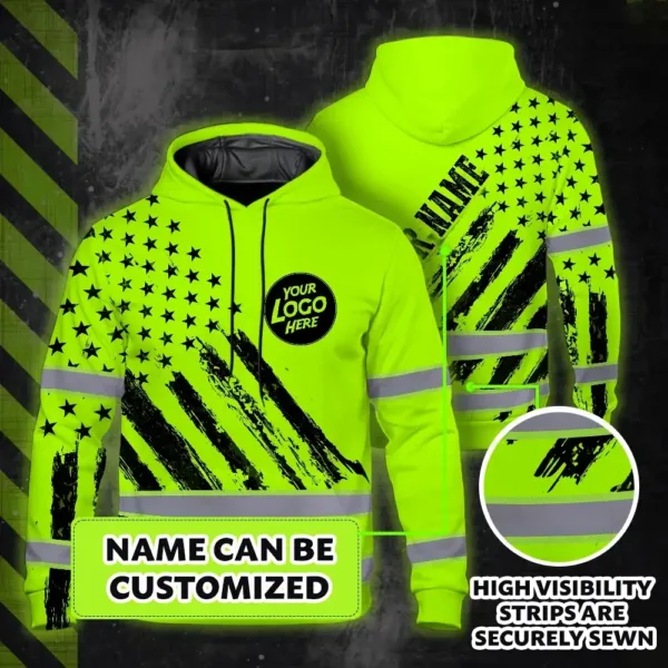 Hi Vis Hoodie Reflective Green Neon US Flag 2 Custom Name And Logo Safety Workwear For Truckers, Workers, Runners, Cyclists, Patriotic