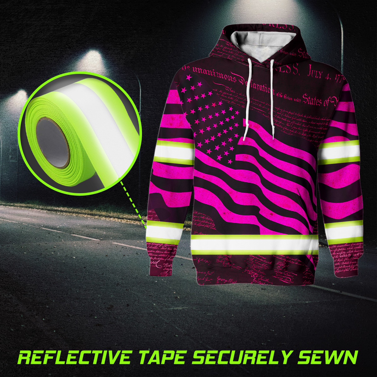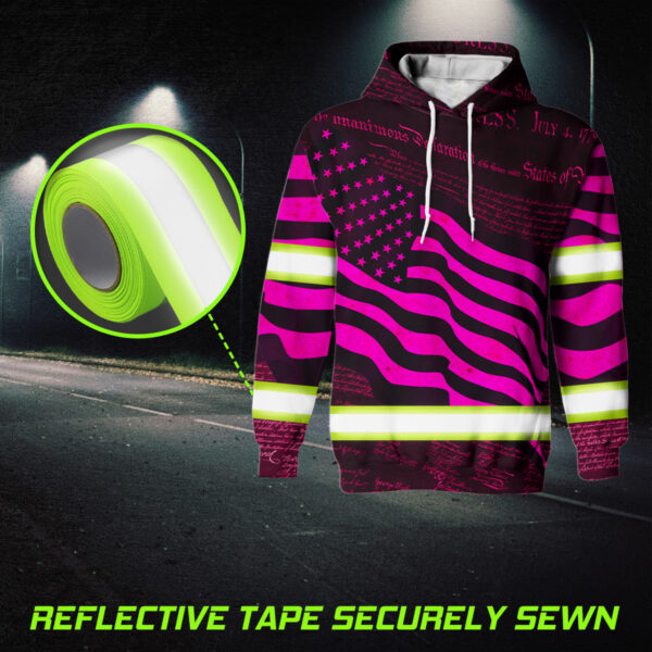 Hi Vis Hoodie Reflective Pink Neon Independence USA Flag Safety Workwear For Workers, Runners, Cyclists