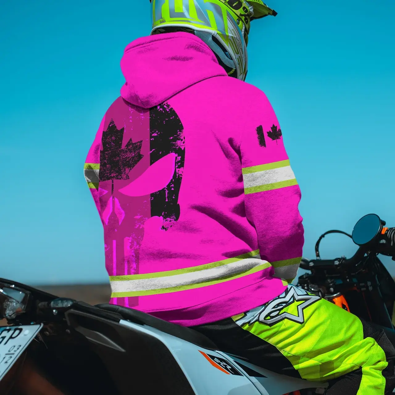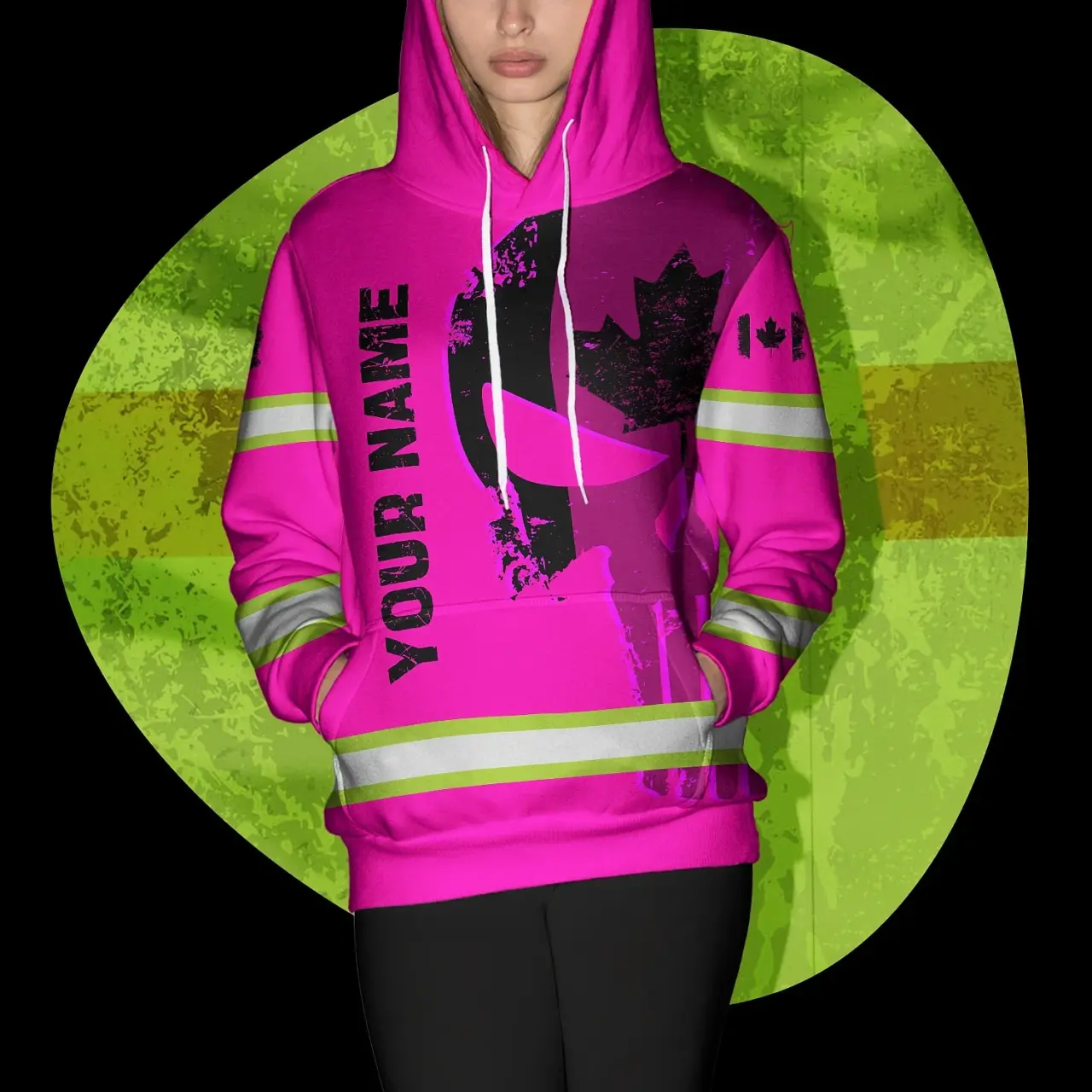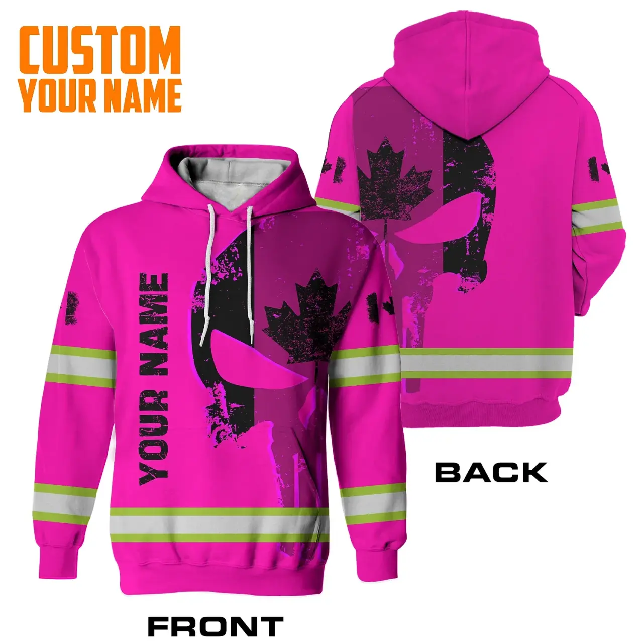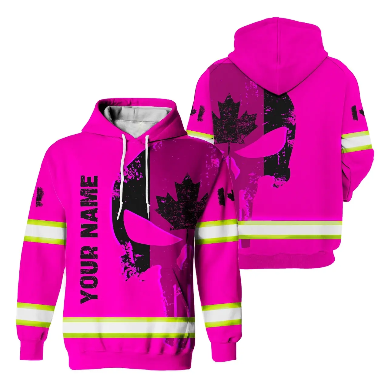 Hi Vis Hoodie Reflective Pink Neon Skull With Canada Flag Custom Name Safety Workwear For Worker, Operator, Patriotic