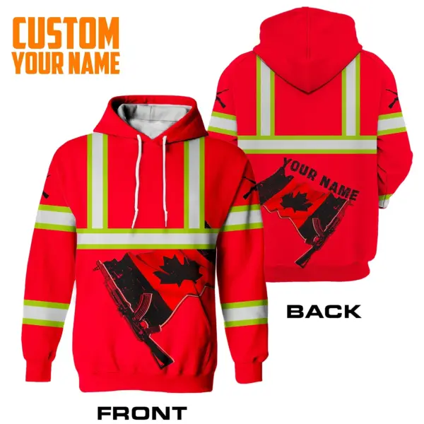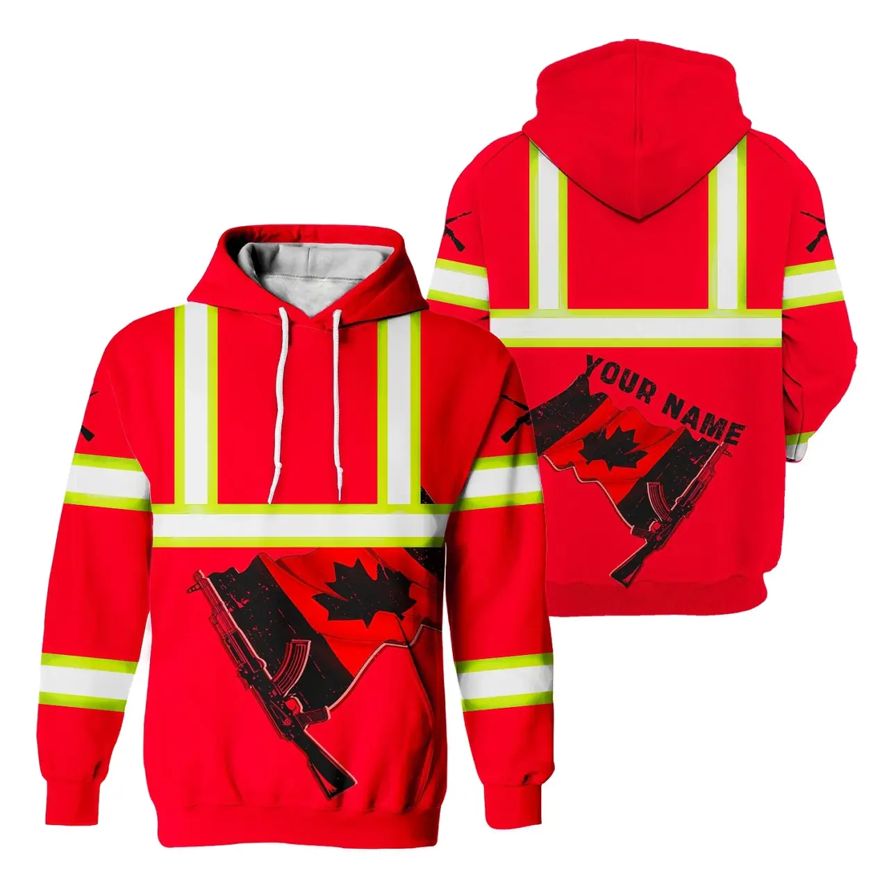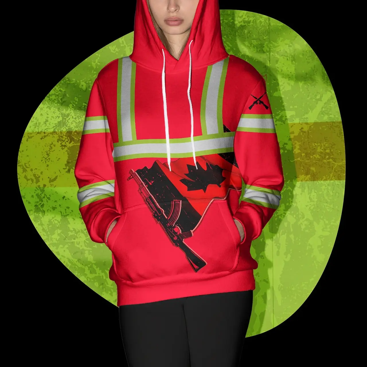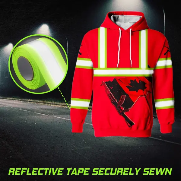 Hi Vis Hoodie Reflective Tapes Black Red Neon Gun Canada Flag Custom Name Safety Workwear For Worker, Operator, Patriotic