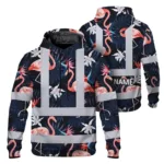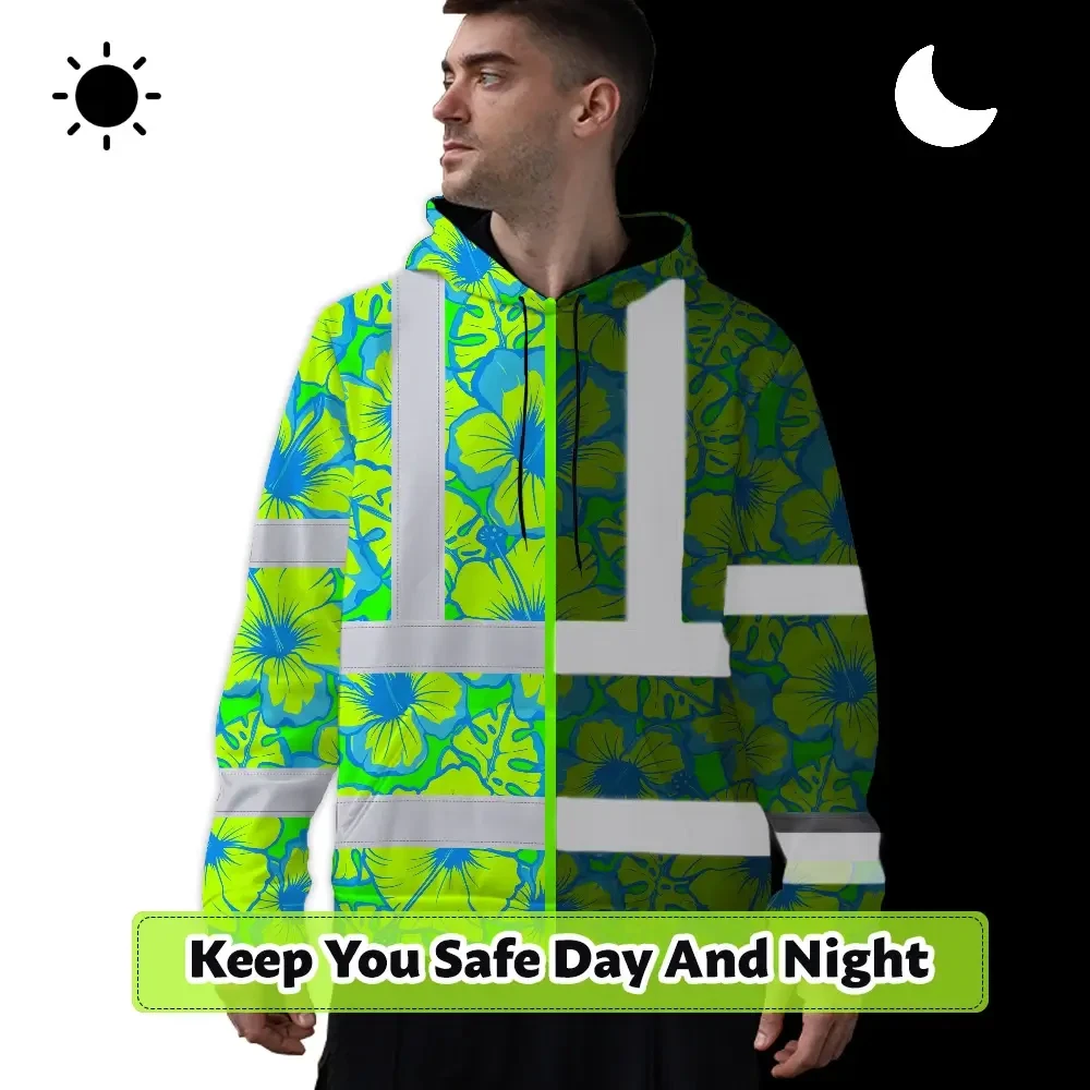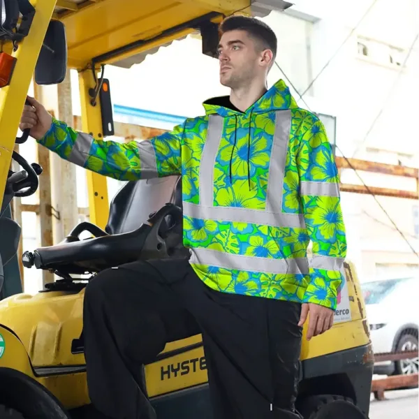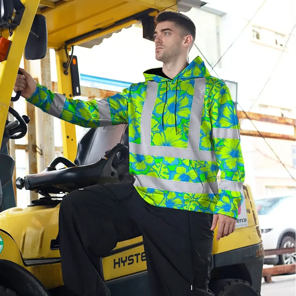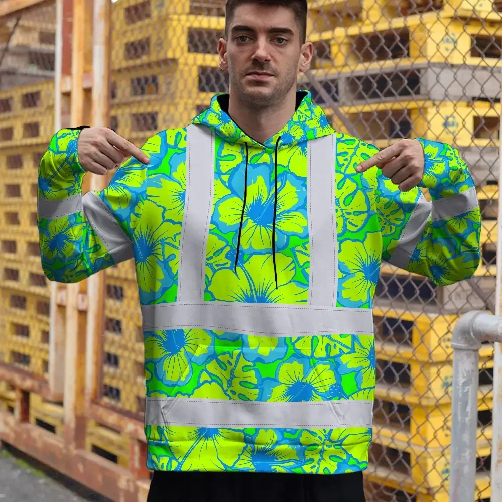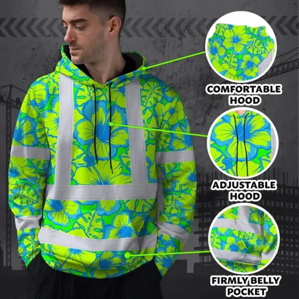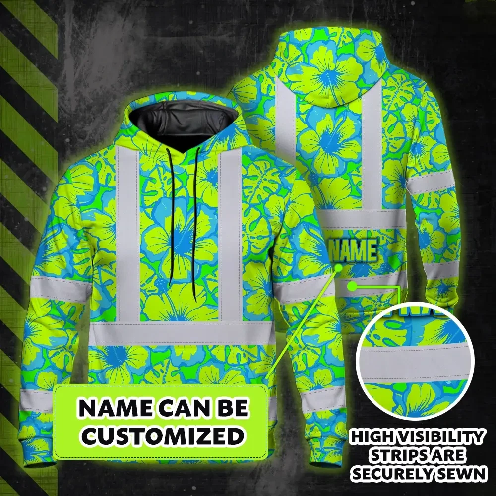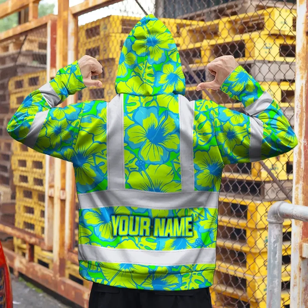 Hi Vis Hoodie Reflective Tapes Blue Neon And Green Flowers Custom Name Safety Workwear For Workers, Truckers, Operators
