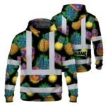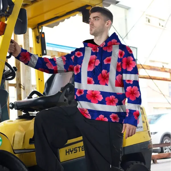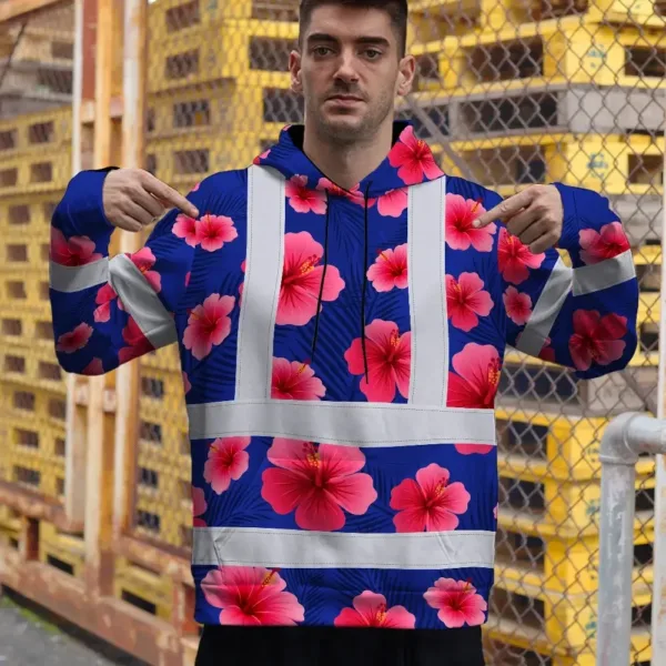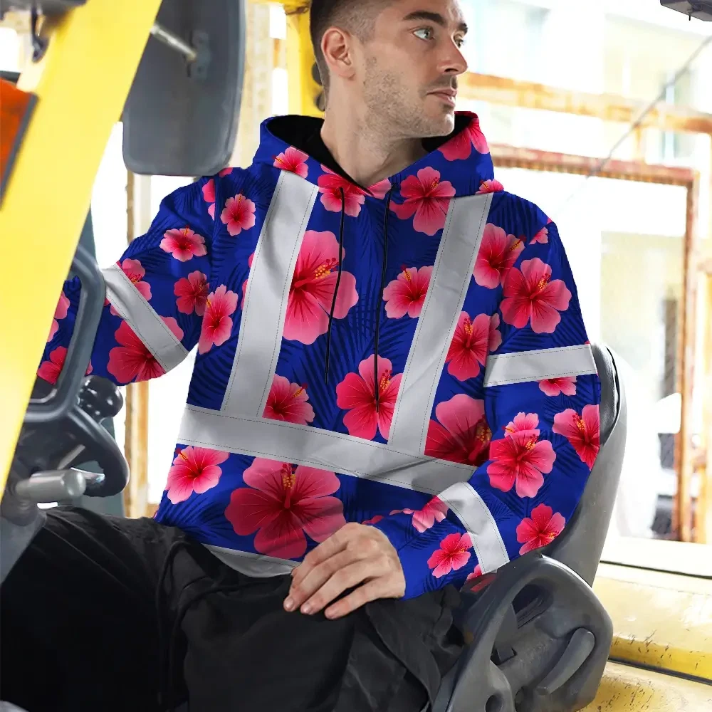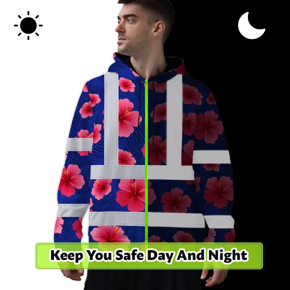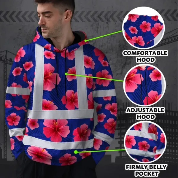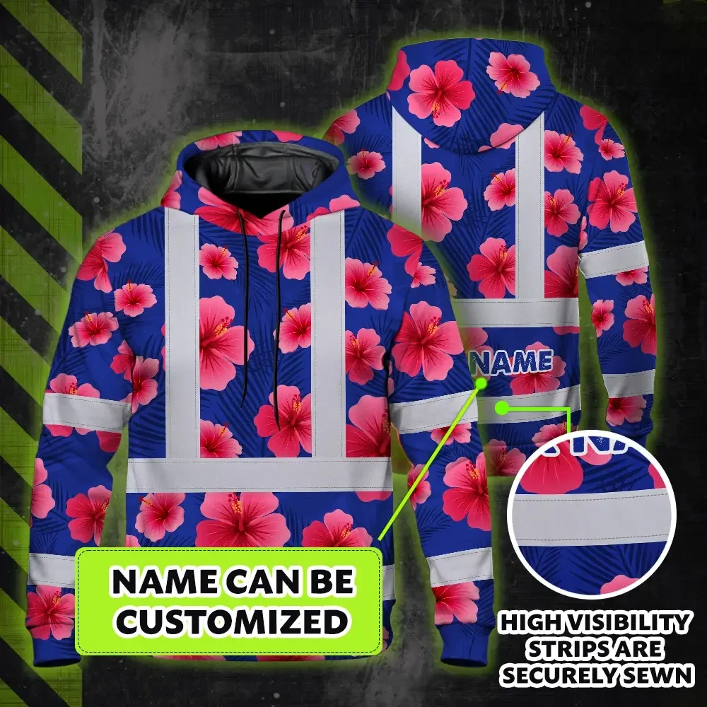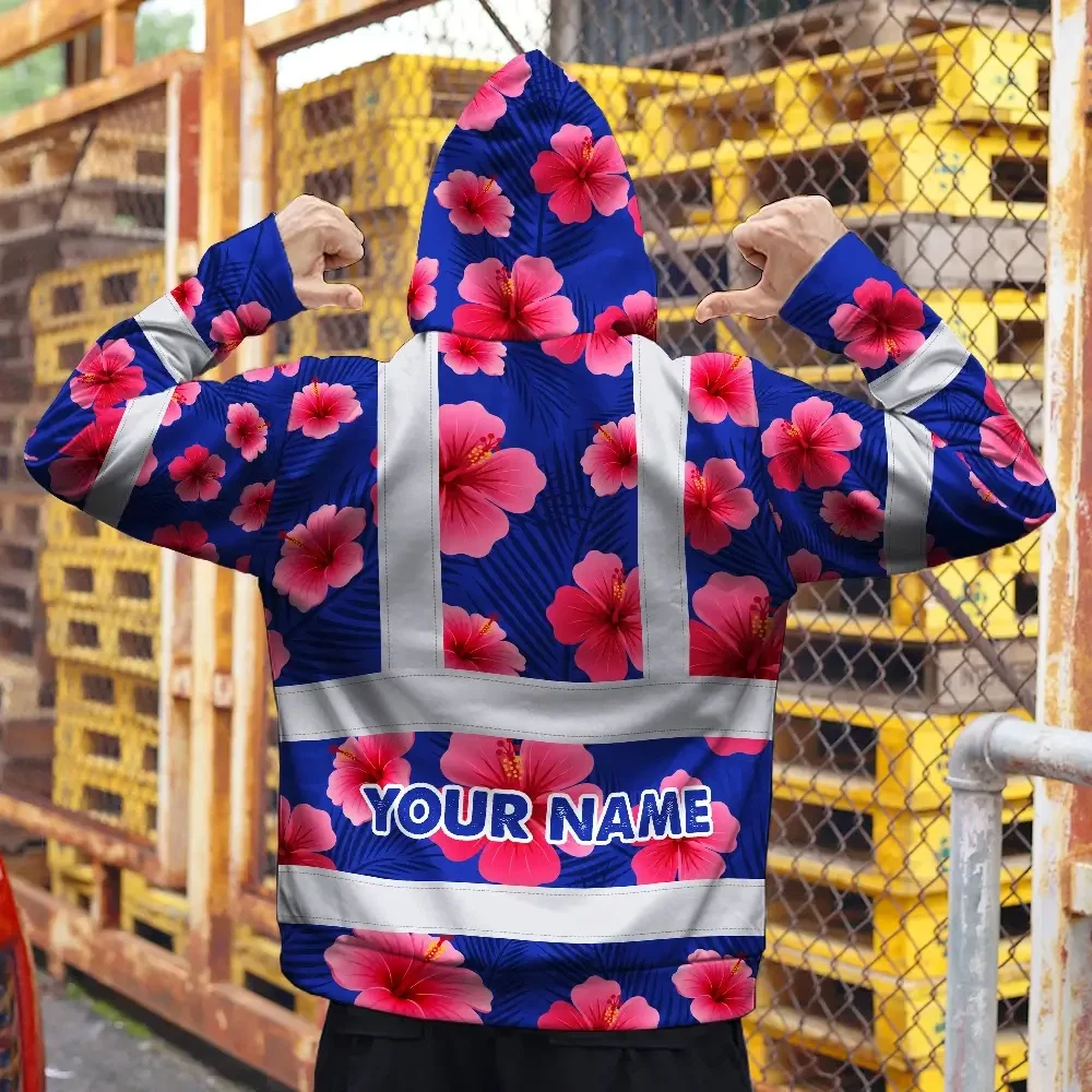 Hi Vis Hoodie Reflective Tapes Blue Neon Pink Flowers Custom Name Safety Workwear For Workers, Truckers, Operators
