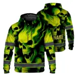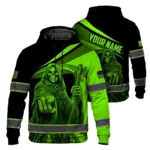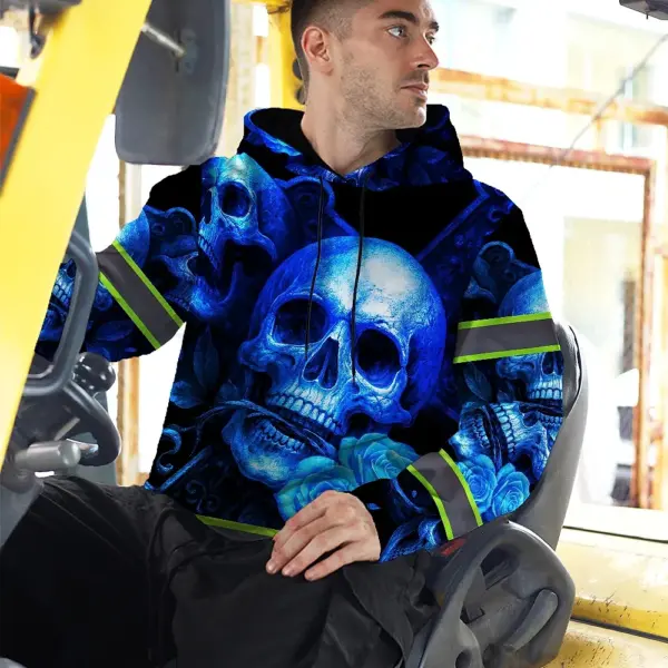 Hi Vis Hoodie Reflective Tapes Gradient Blue Neon Skull Custom Name Safety Workwear For Workers, Runners, Cyclists
