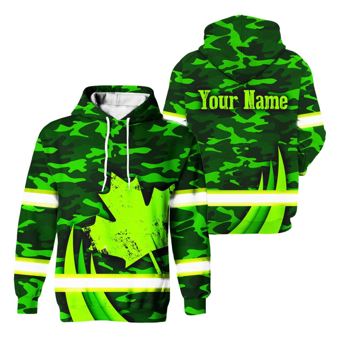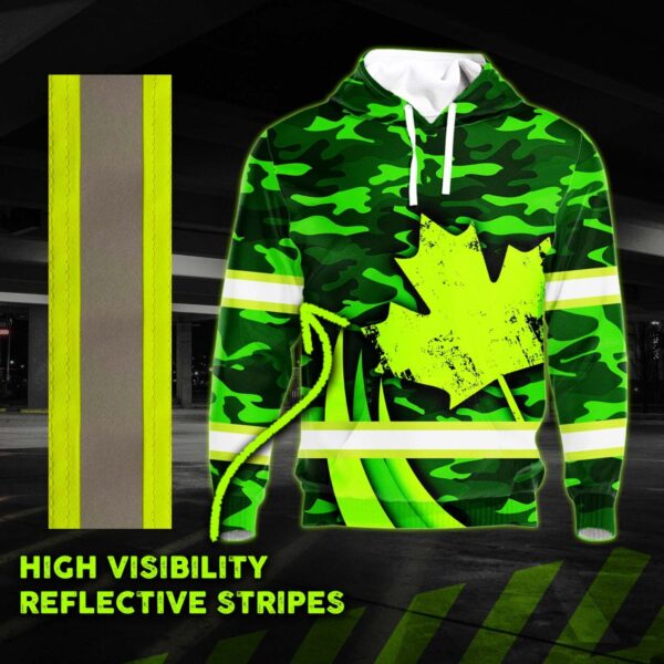 Hi Vis Hoodie Reflective Tapes Green And Black Camo Neon Canada Safety Workwear For Workers, Runners, Cyclists, Patriotic