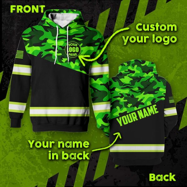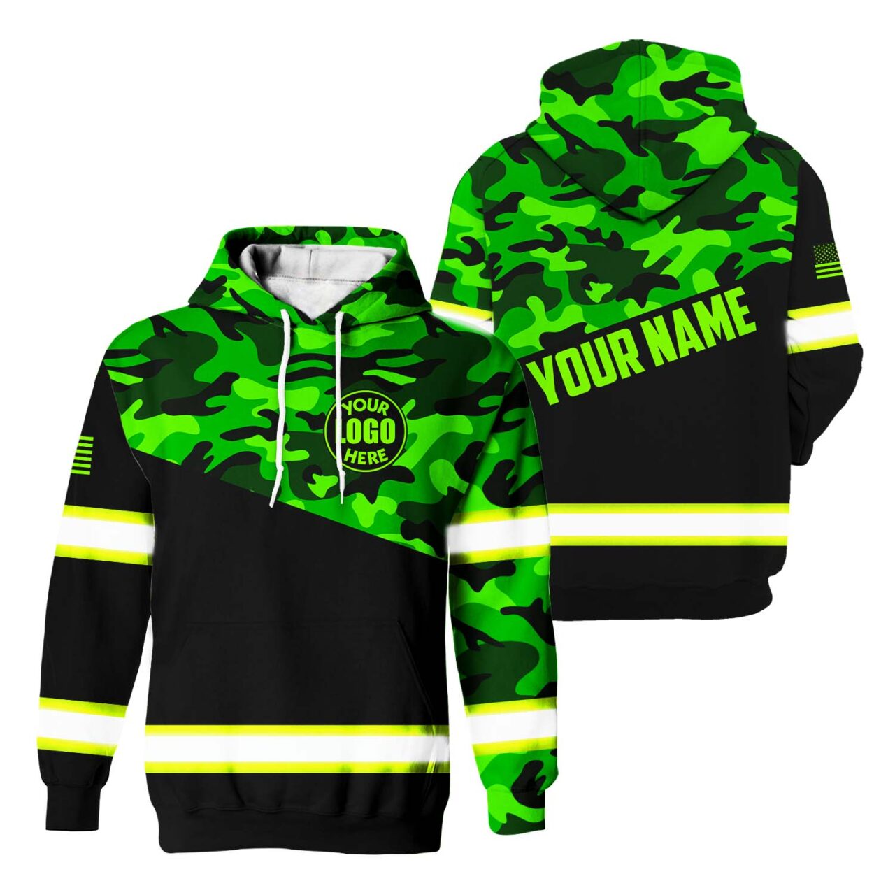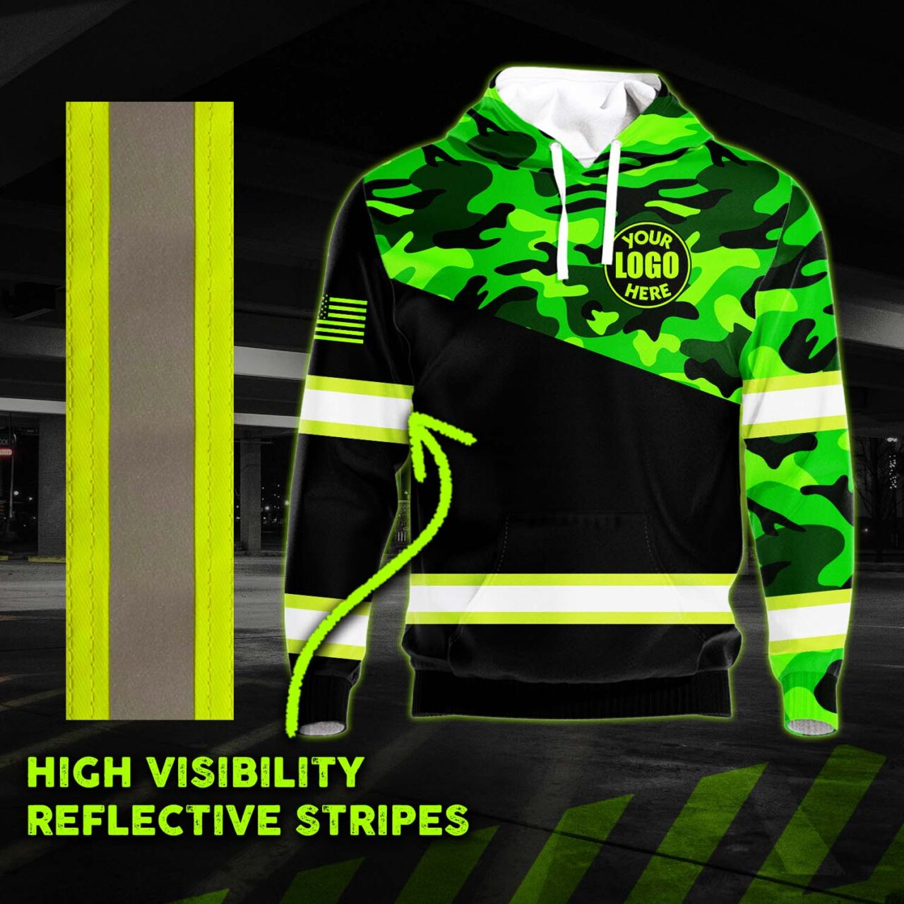 Hi Vis Hoodie Reflective Tapes Green And Black Camo Neon Canada Safety Workwear For Workers, Runners, Cyclists, Patriotic