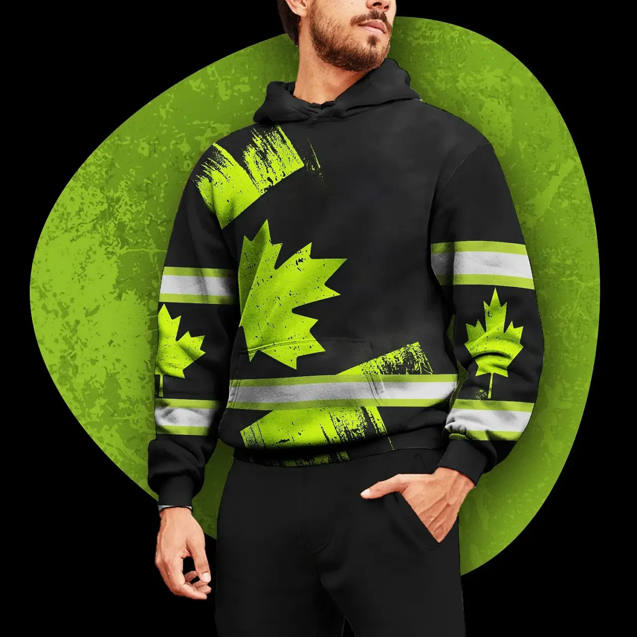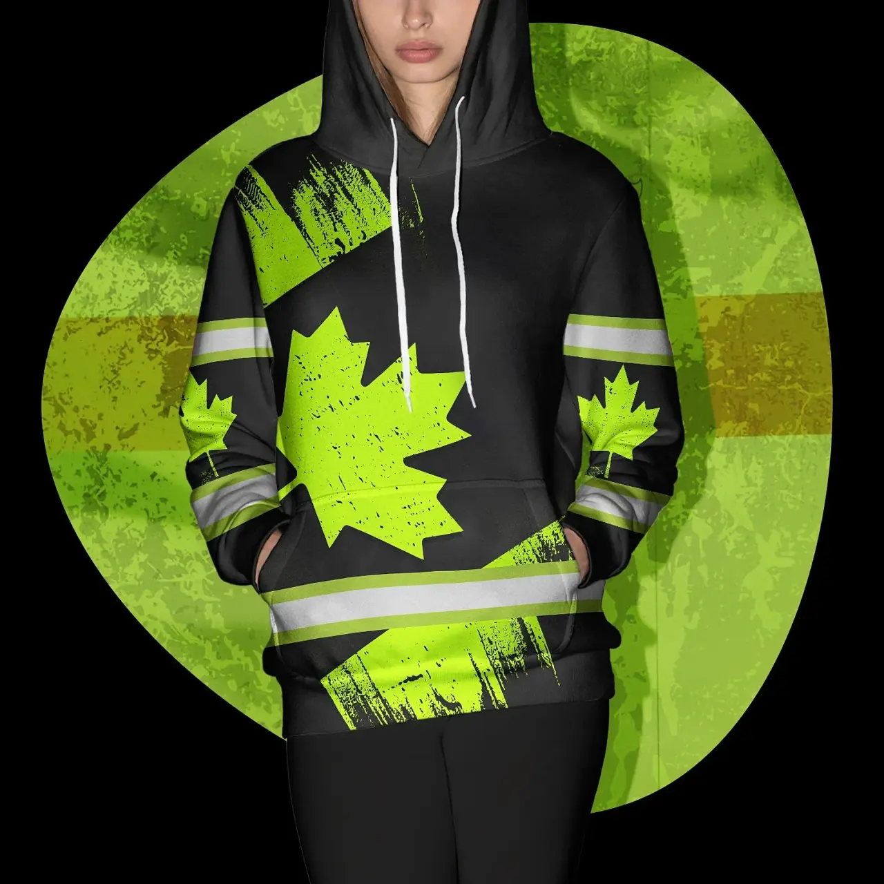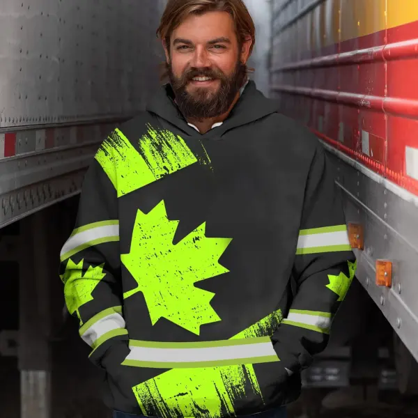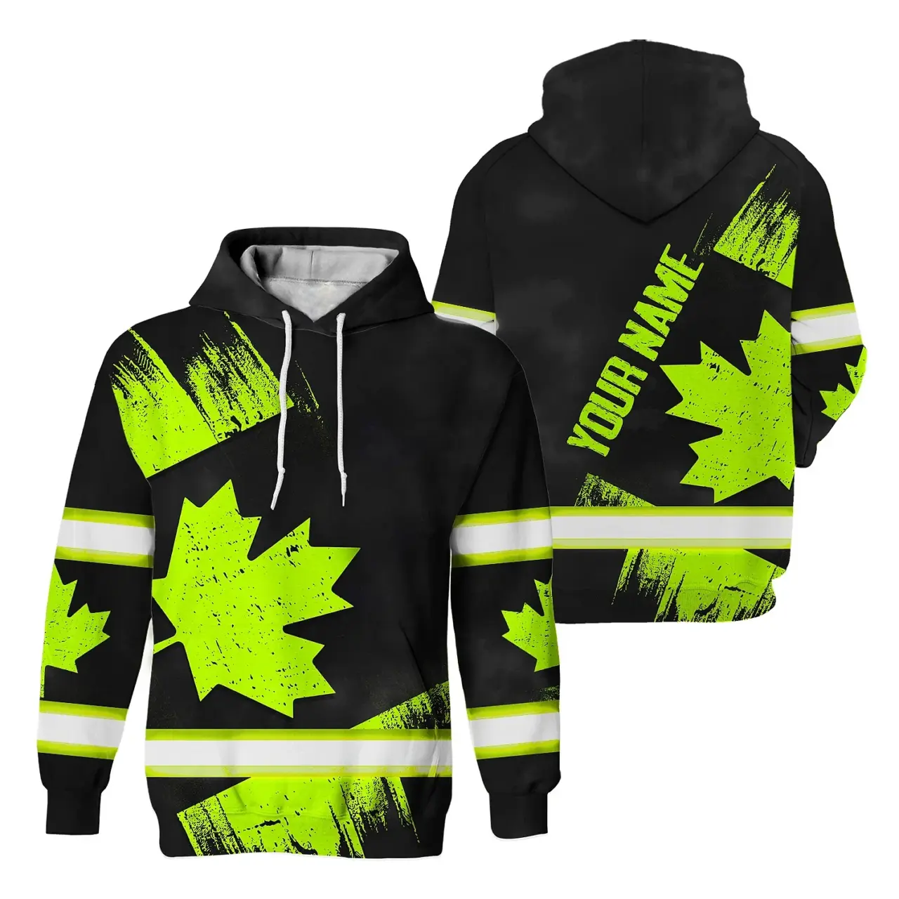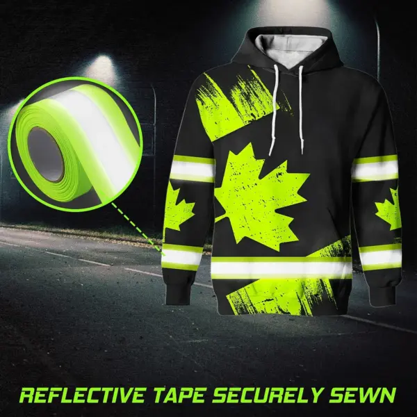 Hi Vis Hoodie Reflective Tapes Green Black Canada Flag Custom Name Safety Workwear For Worker, Operator, Patriotic