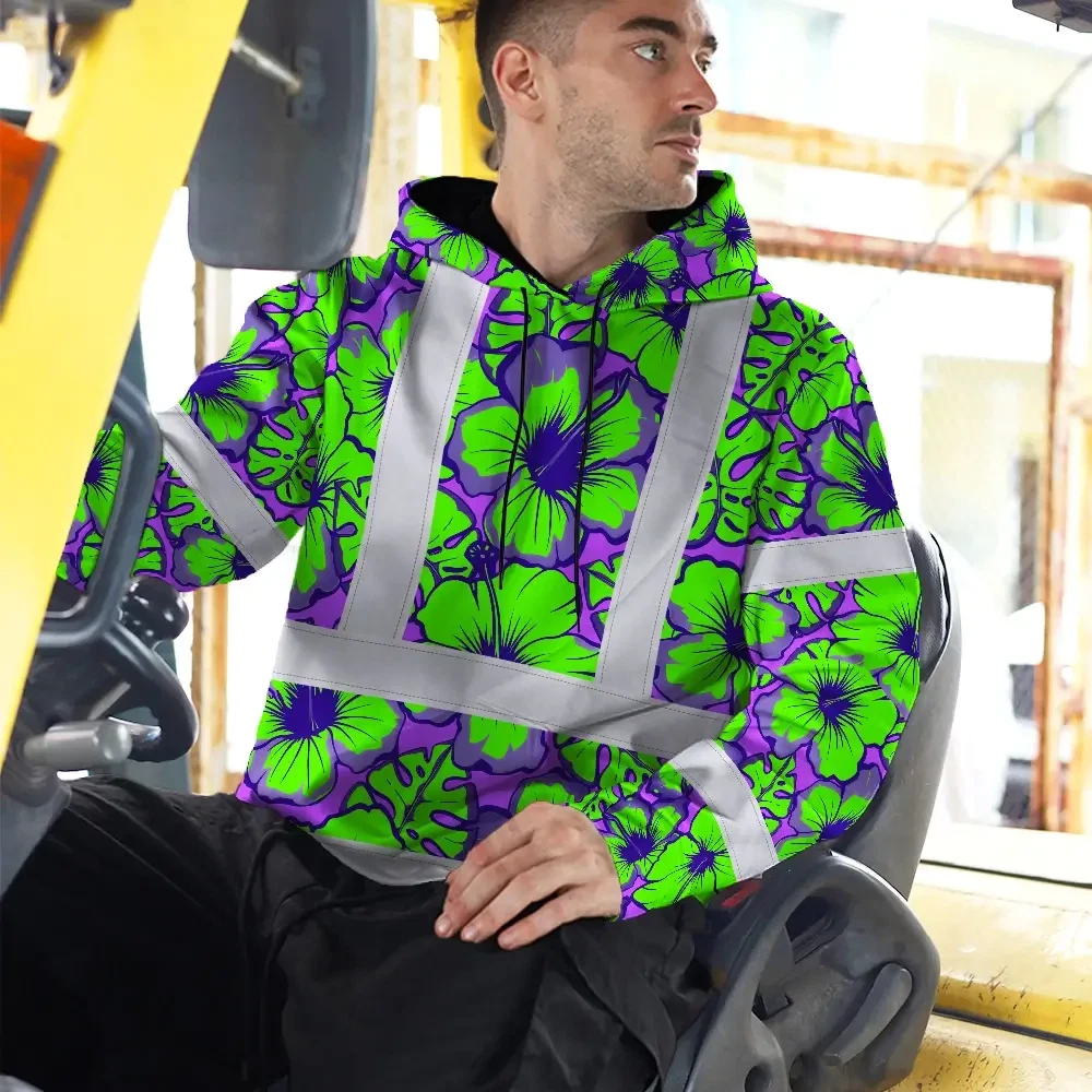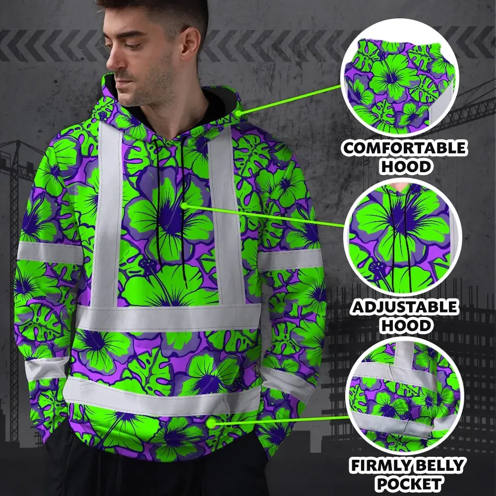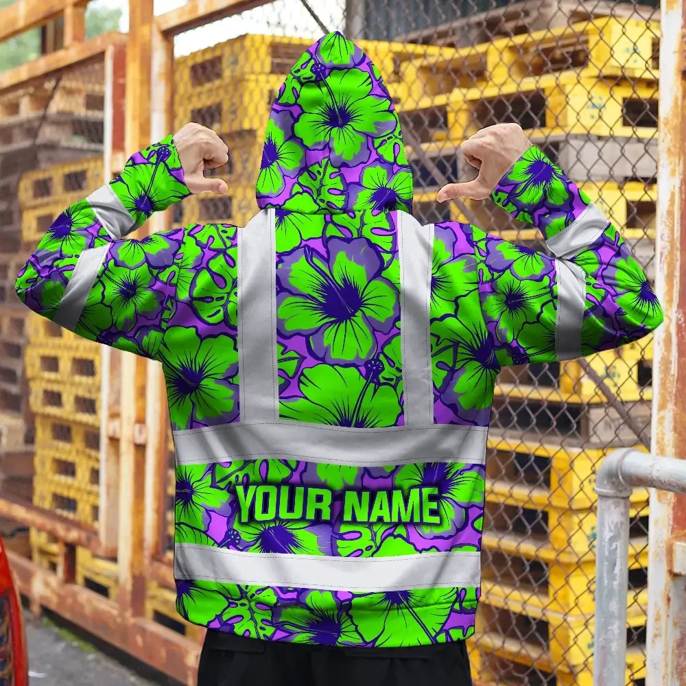 Hi Vis Hoodie Reflective Tapes Green Neon And Violet Flowers Custom Name Safety Workwear For Workers, Truckers, Operators