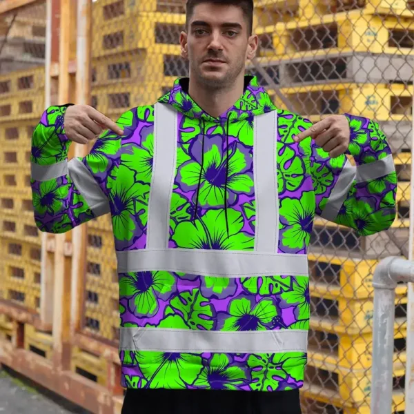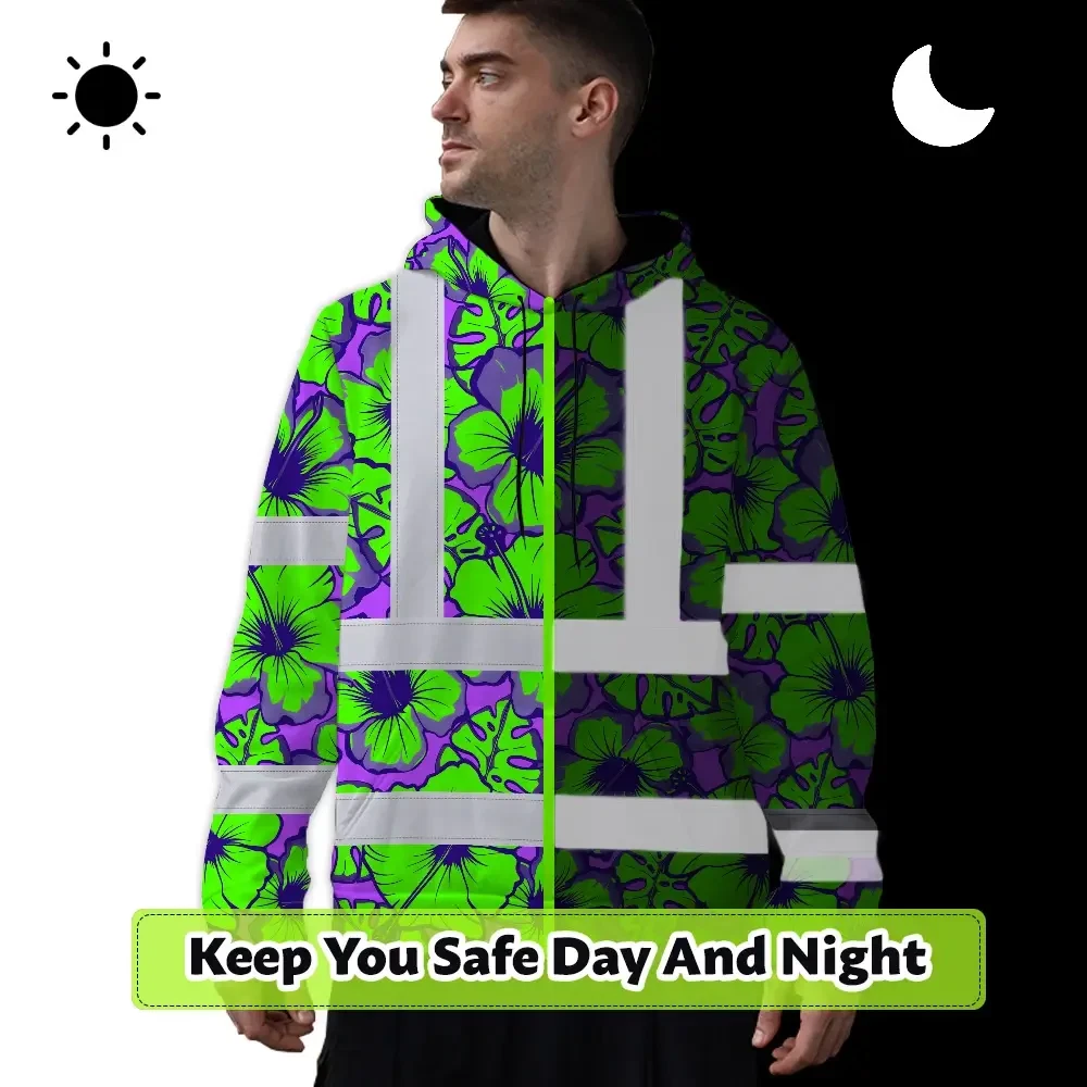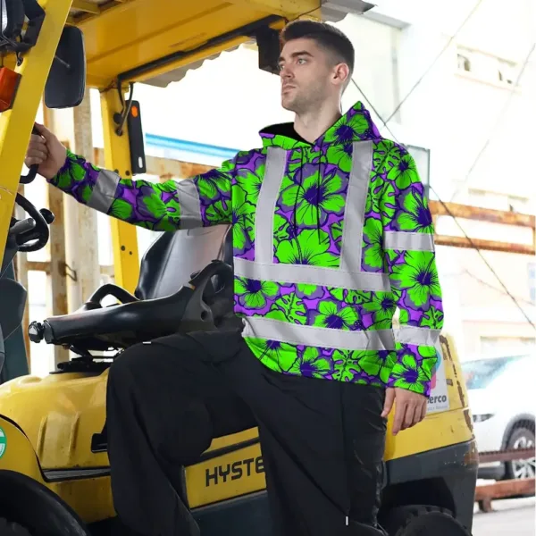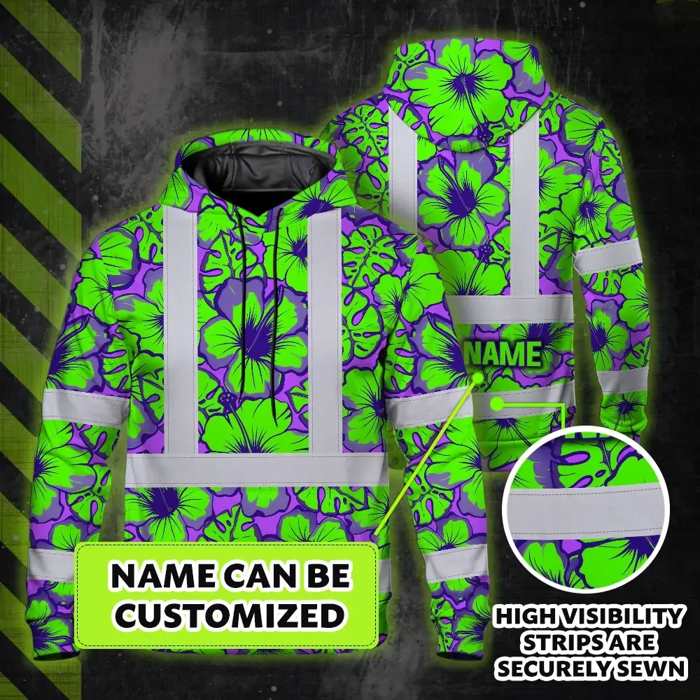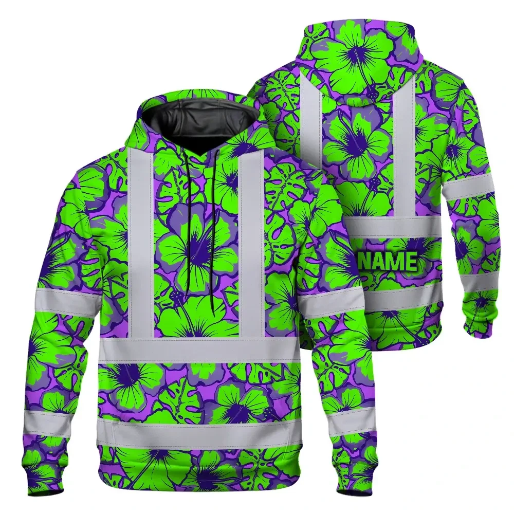Hi Vis Hoodie Reflective Tapes Green Neon And Violet Flowers Custom Name Safety Workwear For Workers, Truckers, Operators
