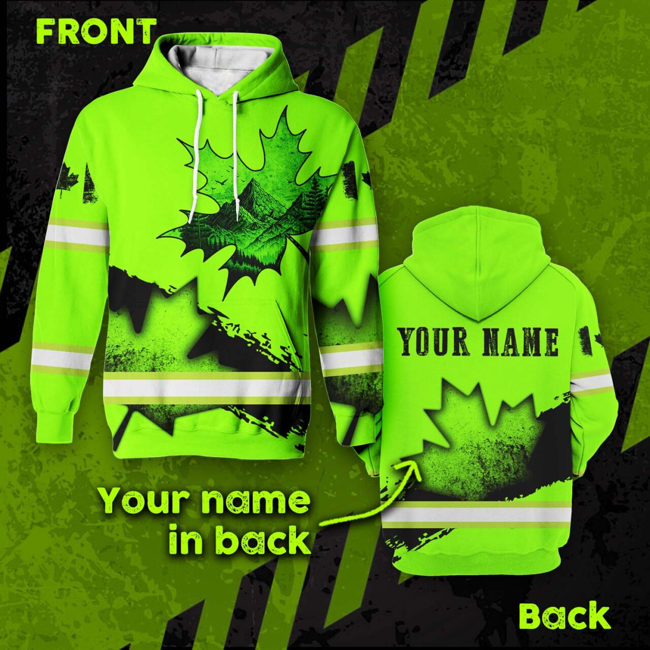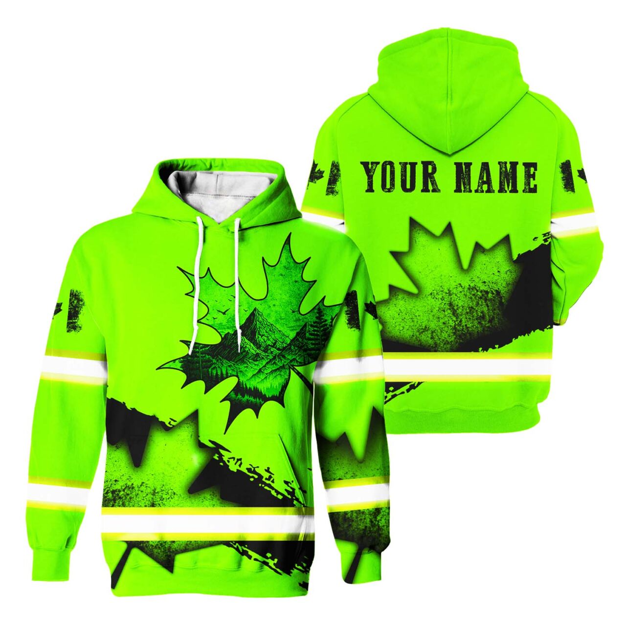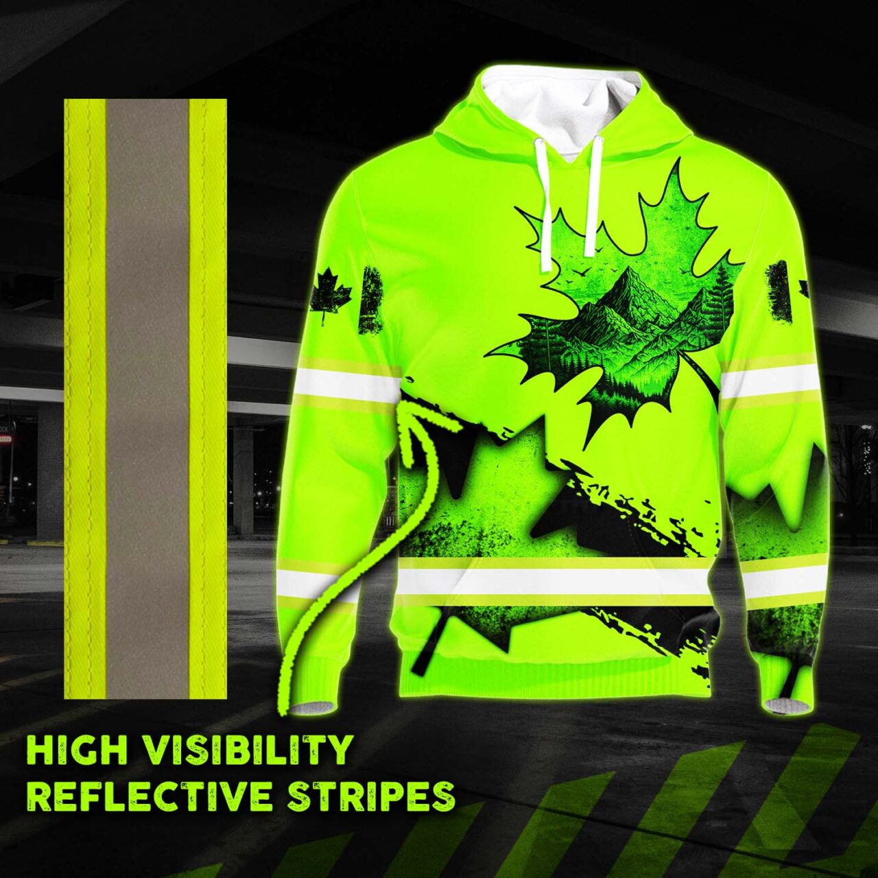 Hi Vis Hoodie Reflective Tapes Green Neon Black Canada Flag Paint Flakes Safety Workwear For Workers, Runners, Cyclists, Patriotic
