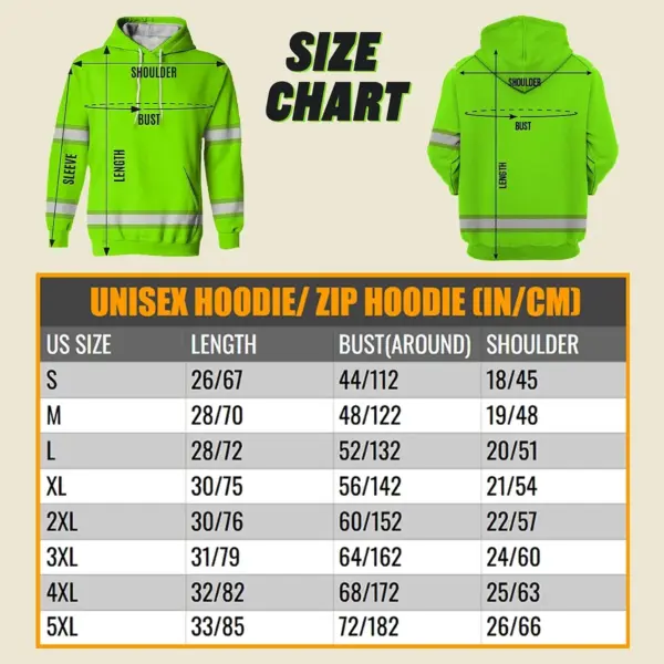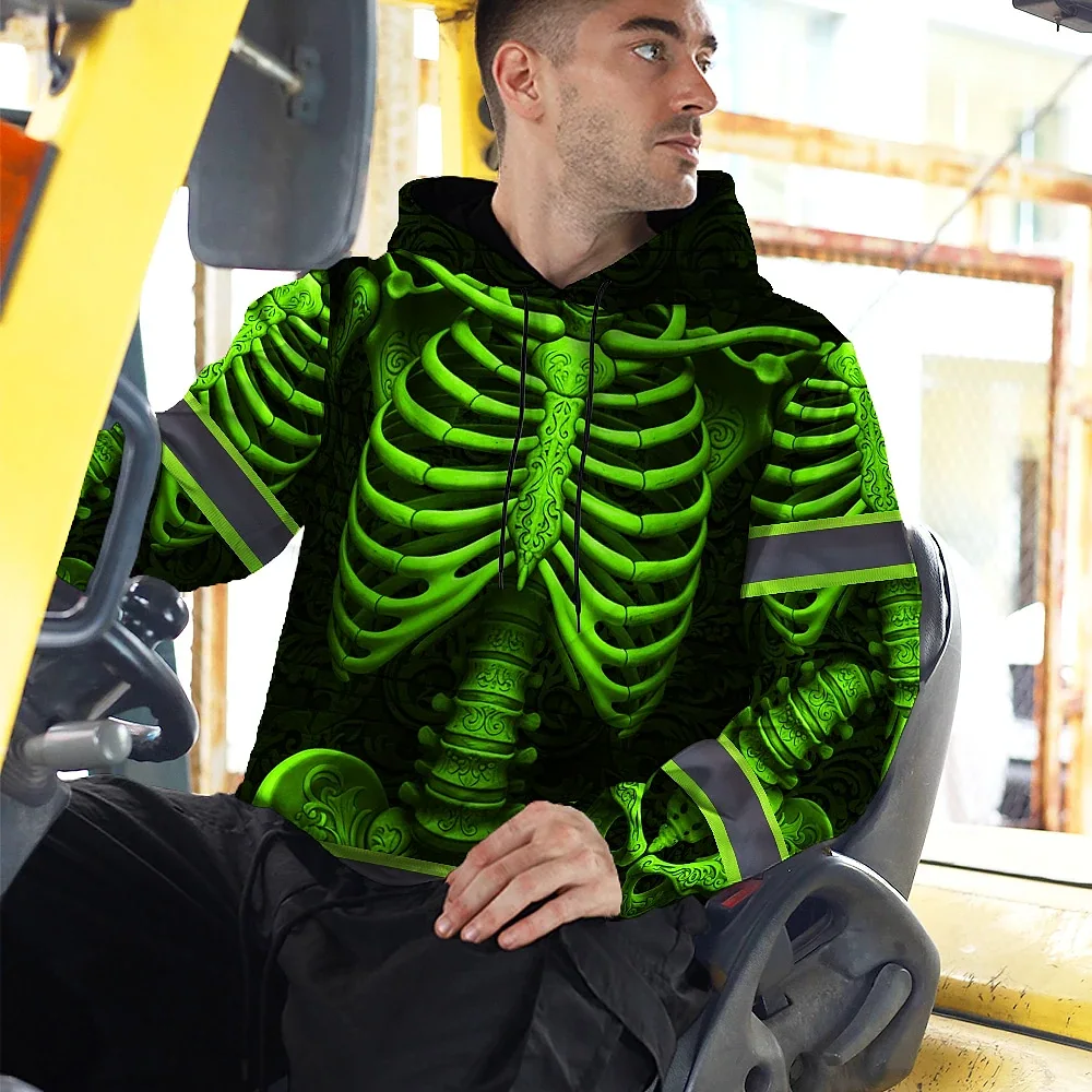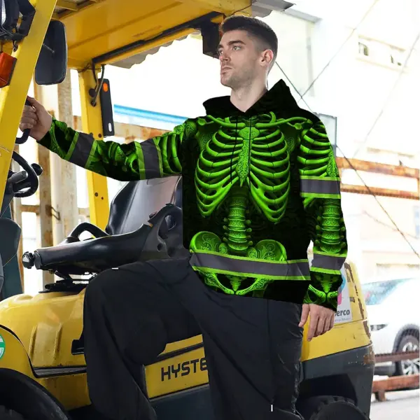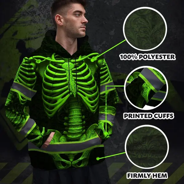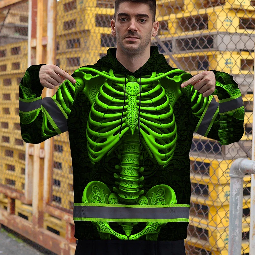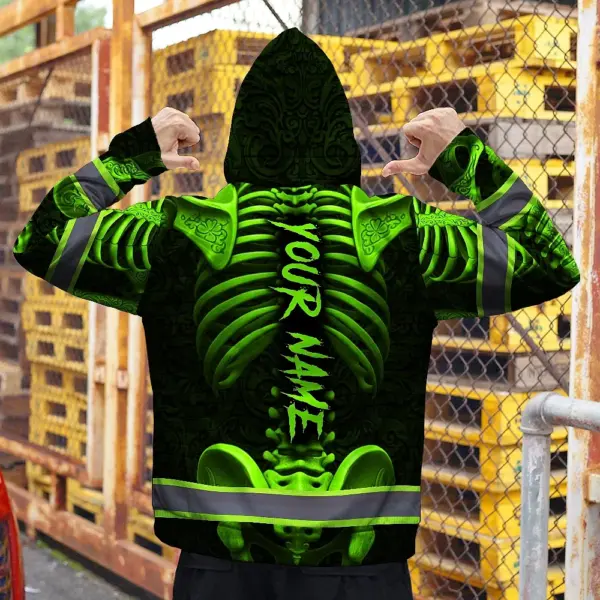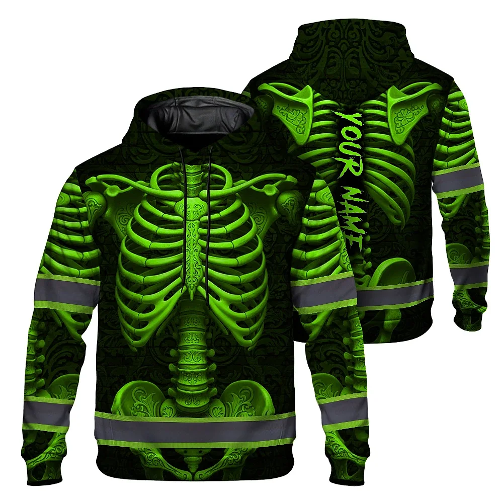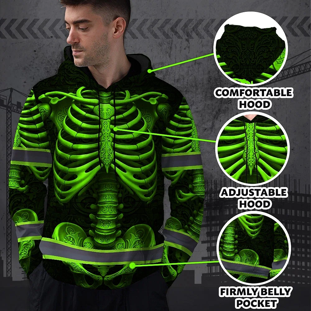 Hi Vis Hoodie Reflective Tapes Green Neon Bone Skull Custom Name Safety Workwear For Workers, Runners, Cyclists