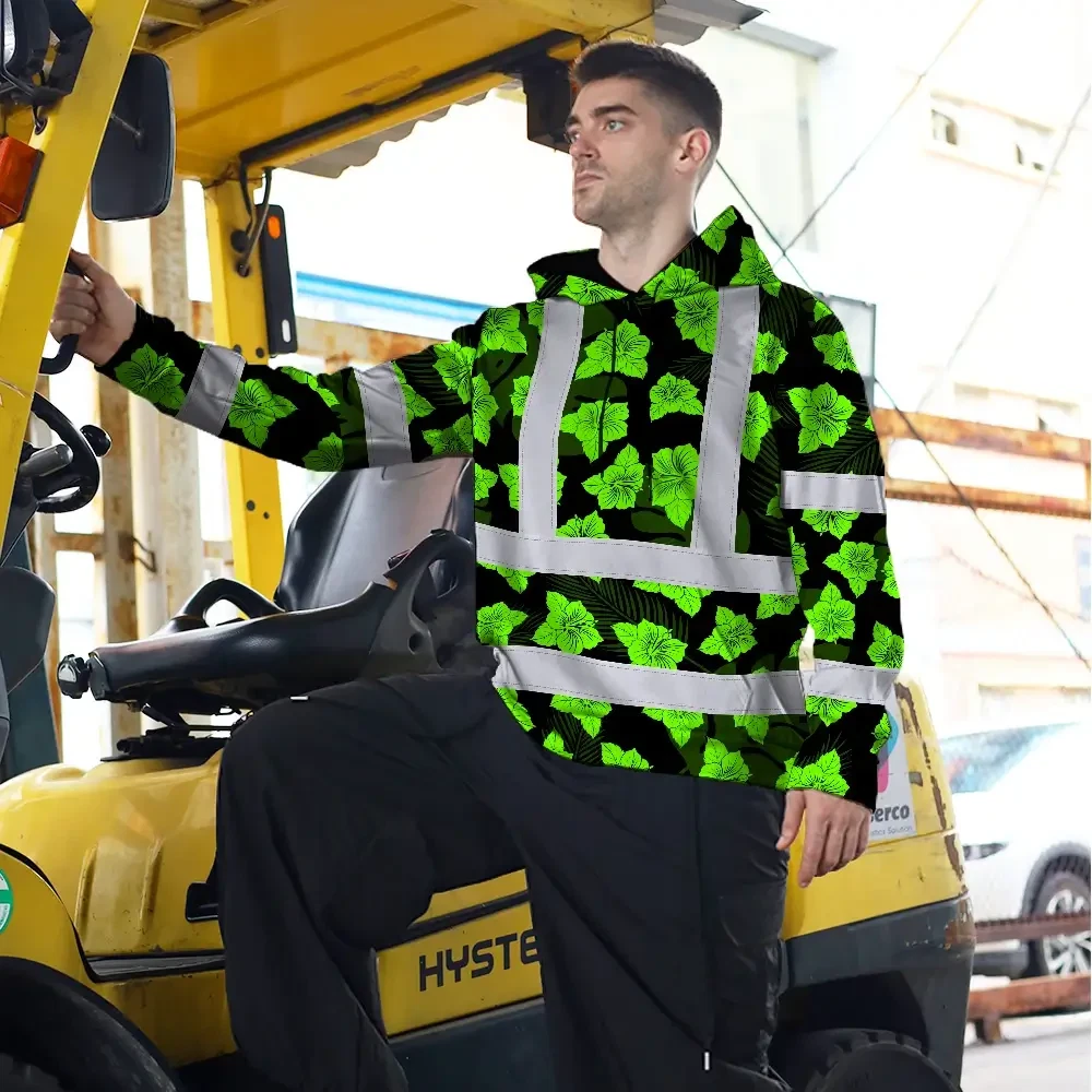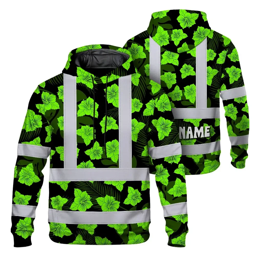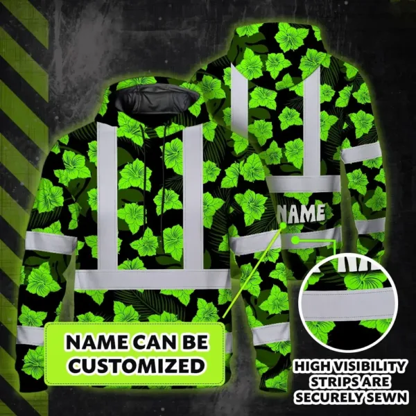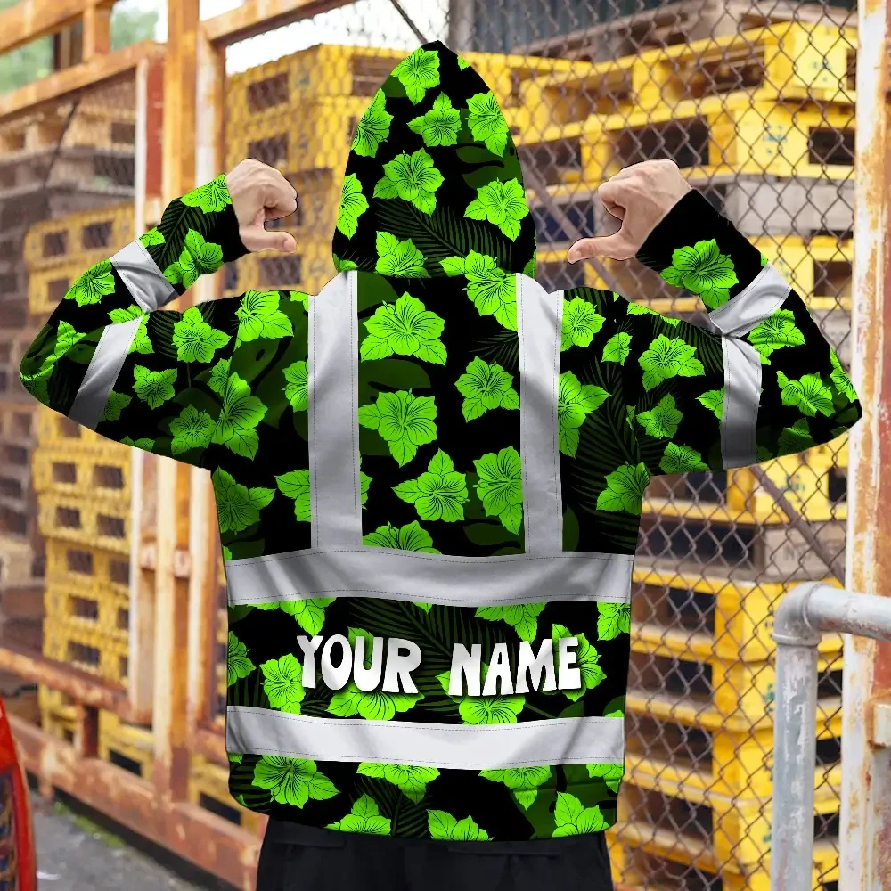 Hi Vis Hoodie Reflective Tapes Green Neon Flowers 3 Custom Name Safety Workwear For Workers, Truckers, Operators