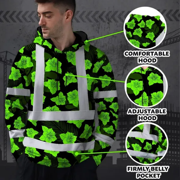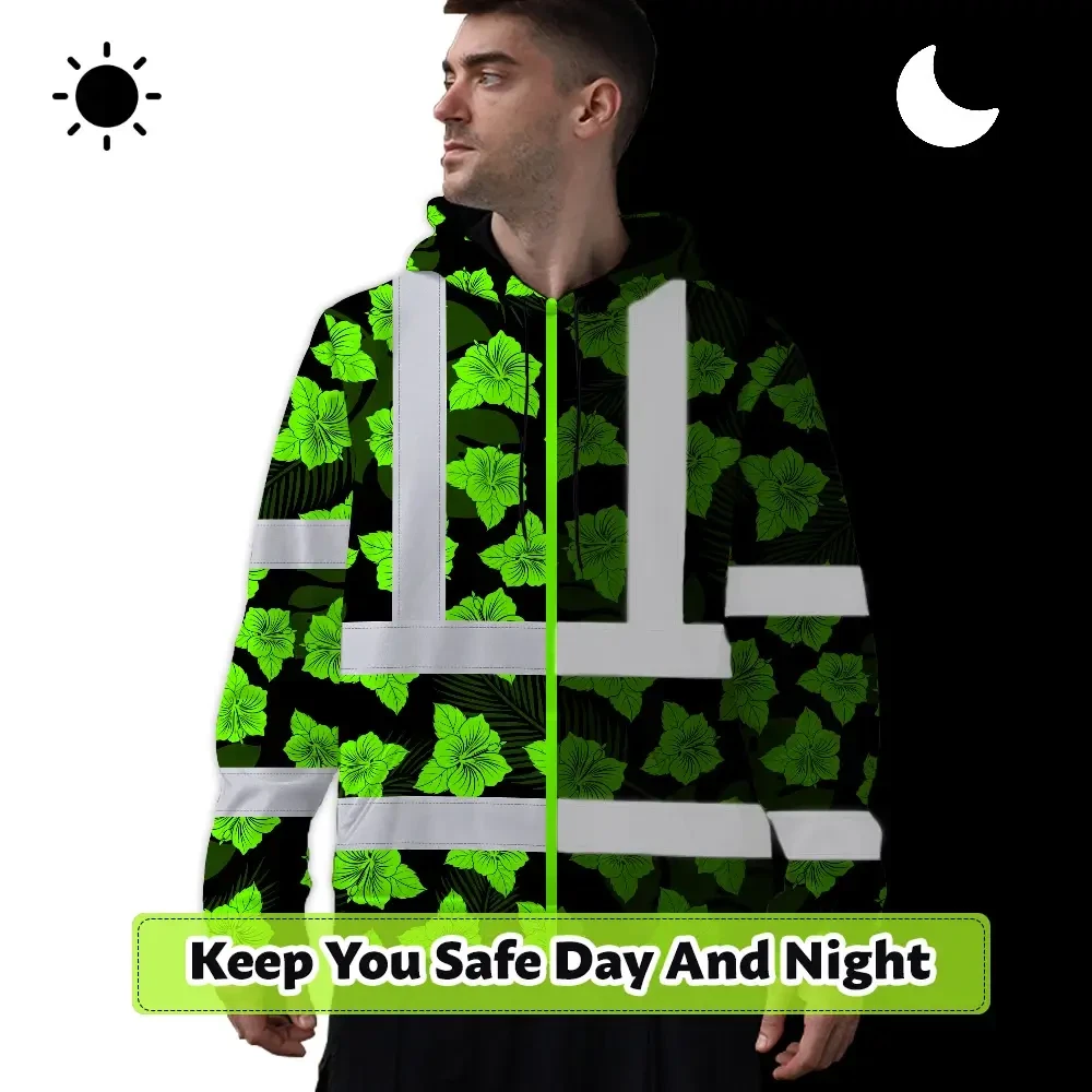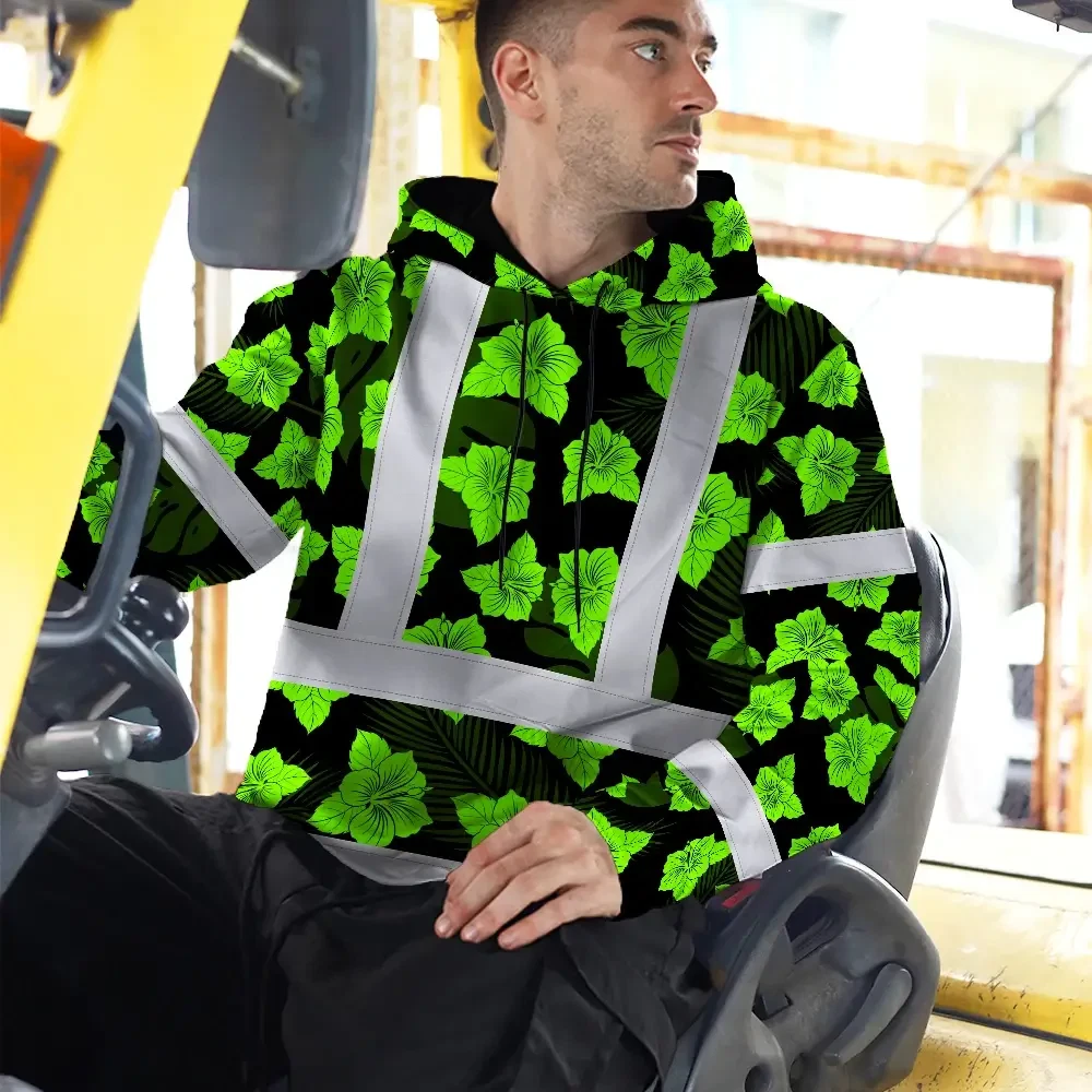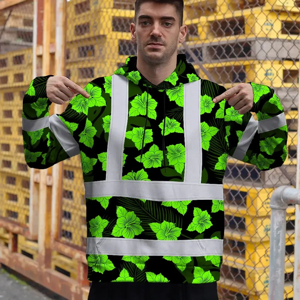 Hi Vis Hoodie Reflective Tapes Green Neon Flowers 3 Custom Name Safety Workwear For Workers, Truckers, Operators