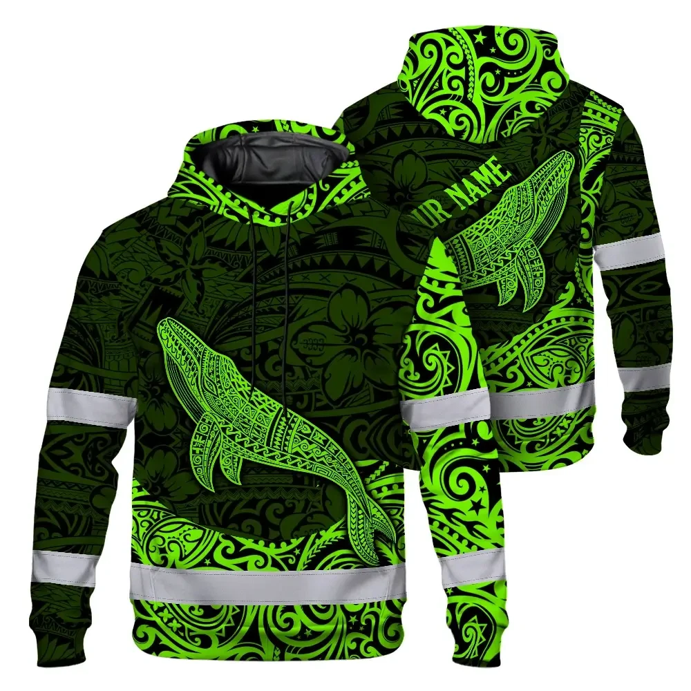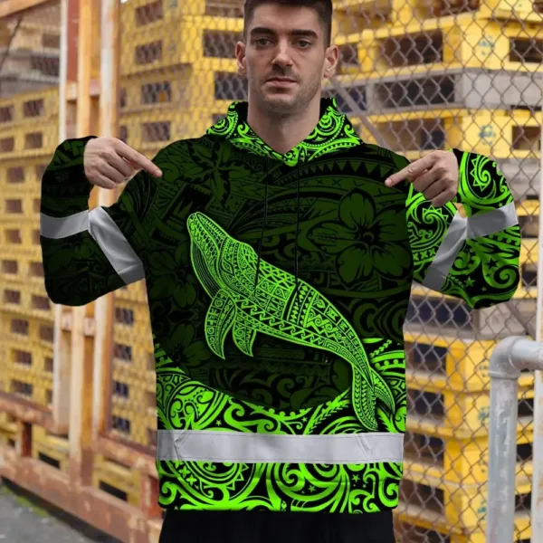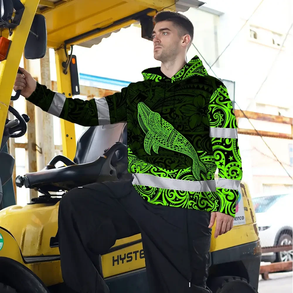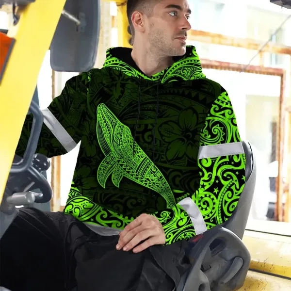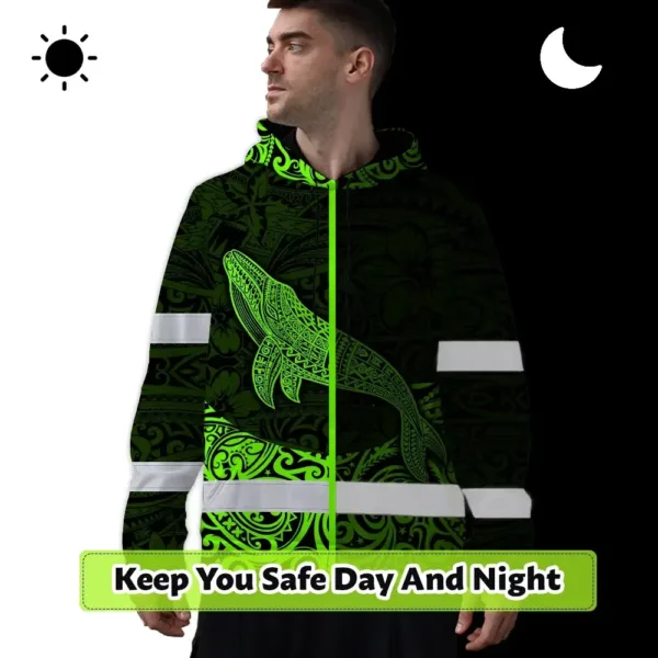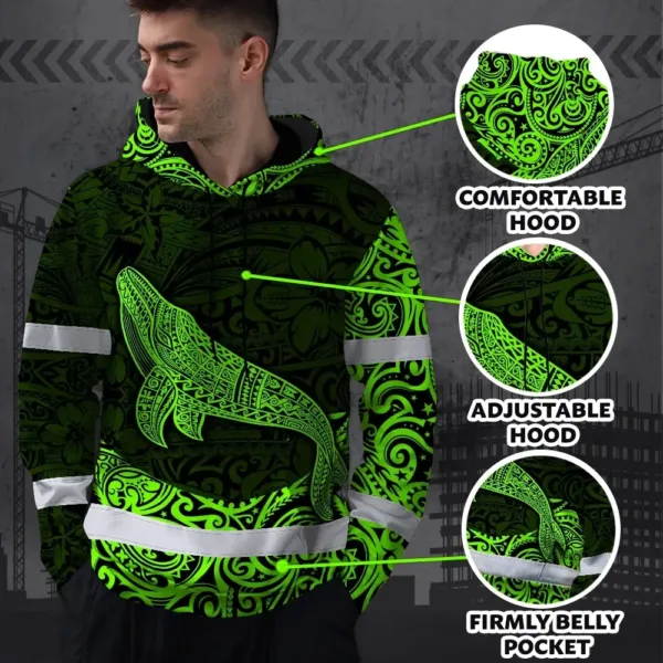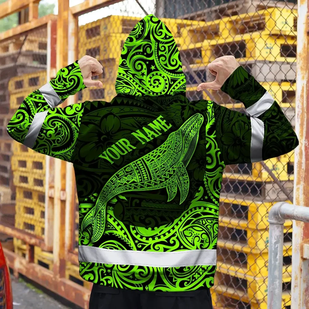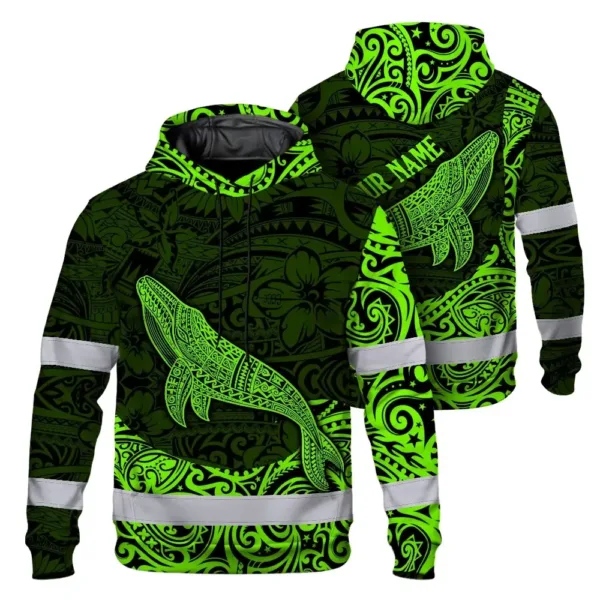 Hi Vis Hoodie Reflective Tapes Green Neon Hawaii Whale Custom Name Safety Workwear For Workers, Truckers, Operators