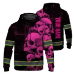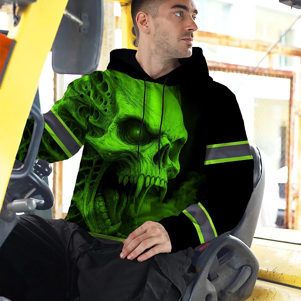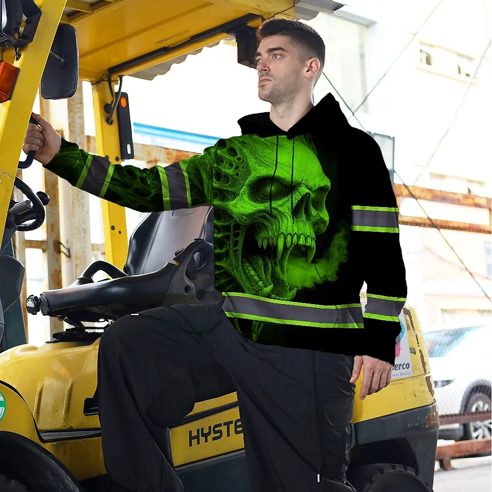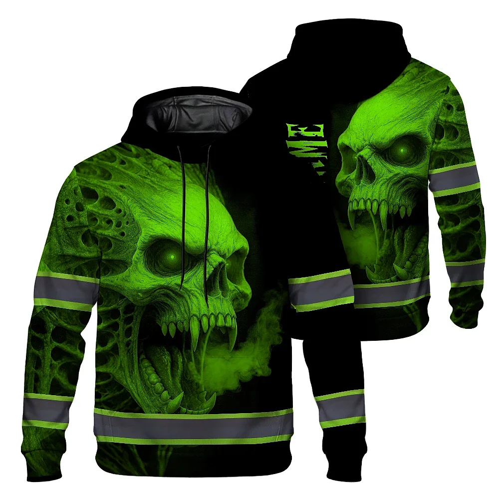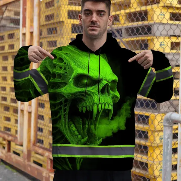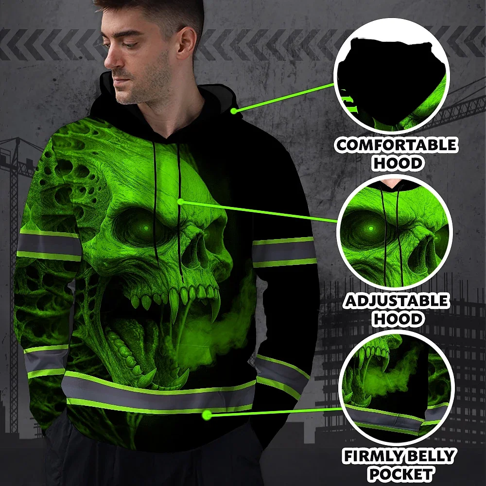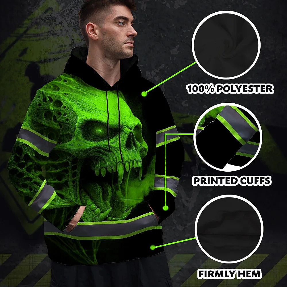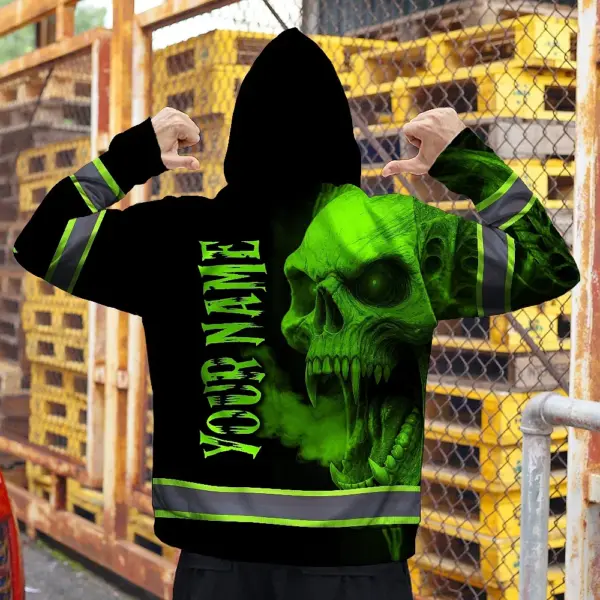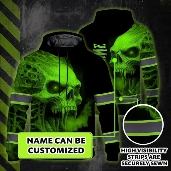 Hi Vis Hoodie Reflective Tapes Green Smoke Neon Skull Custom Name Safety Workwear For Workers, Runners, Cyclists