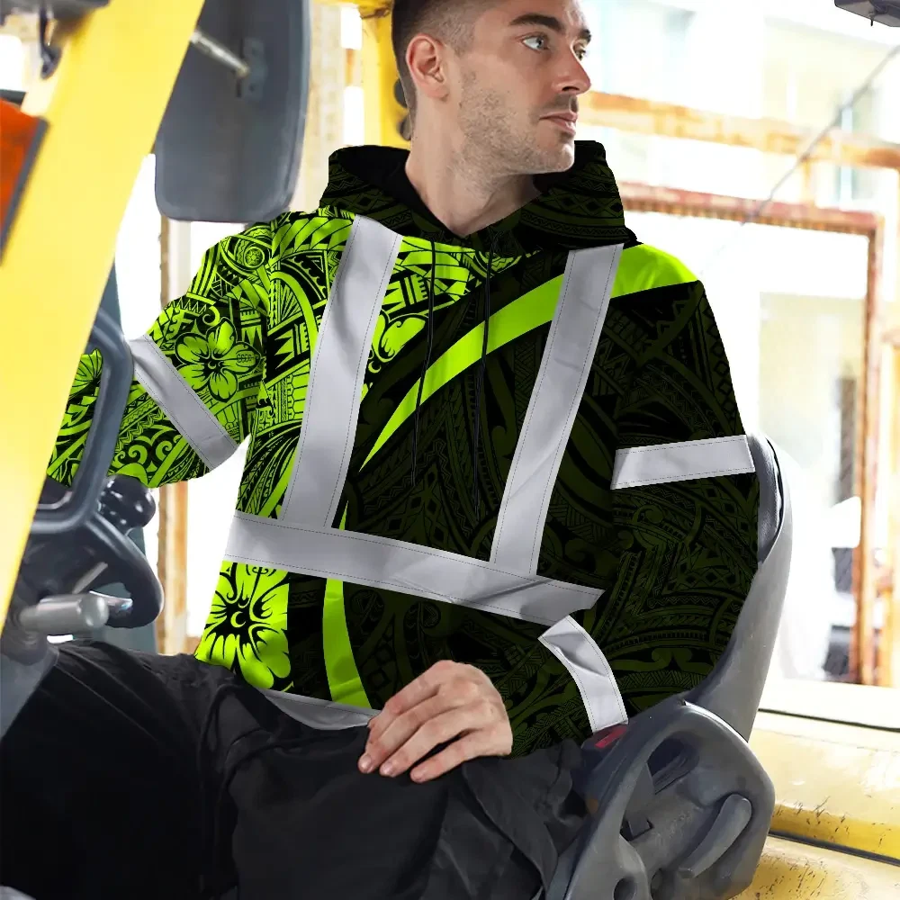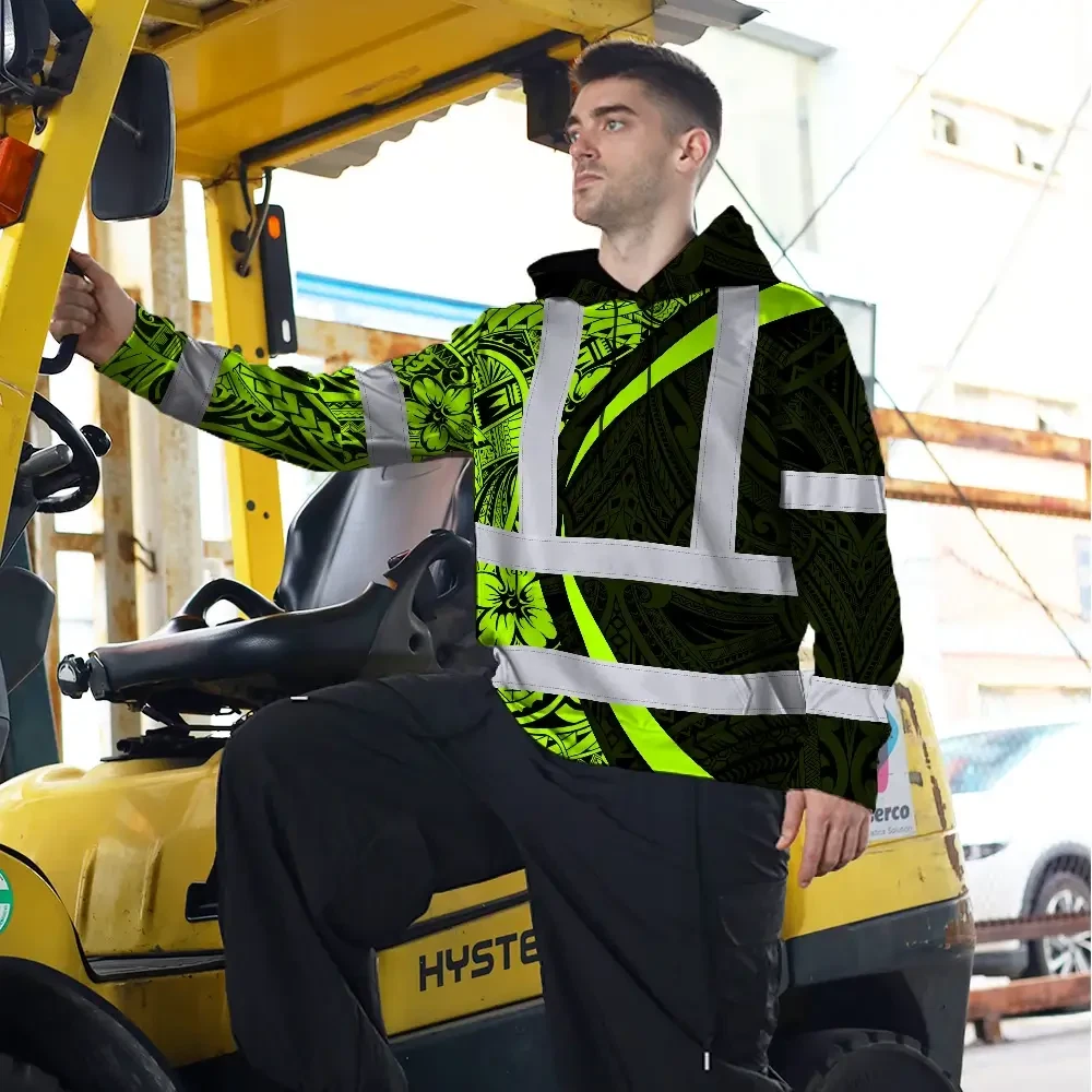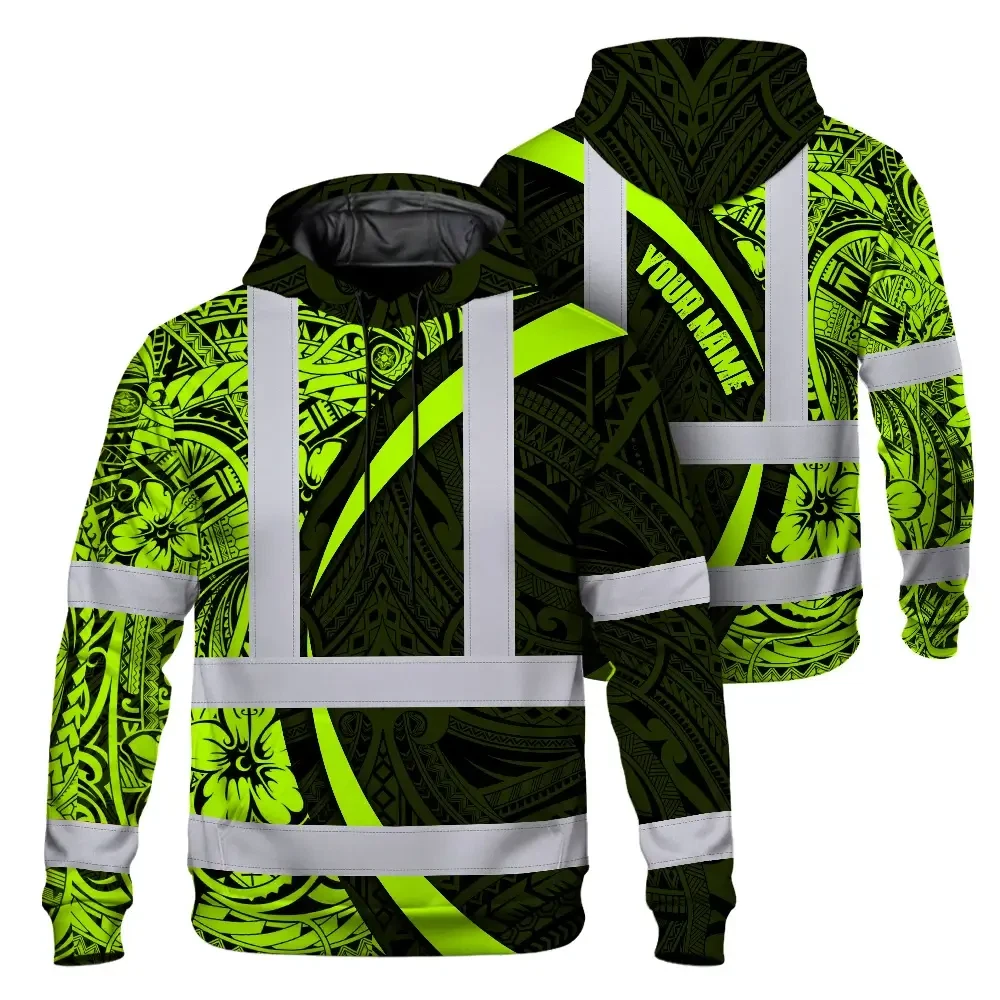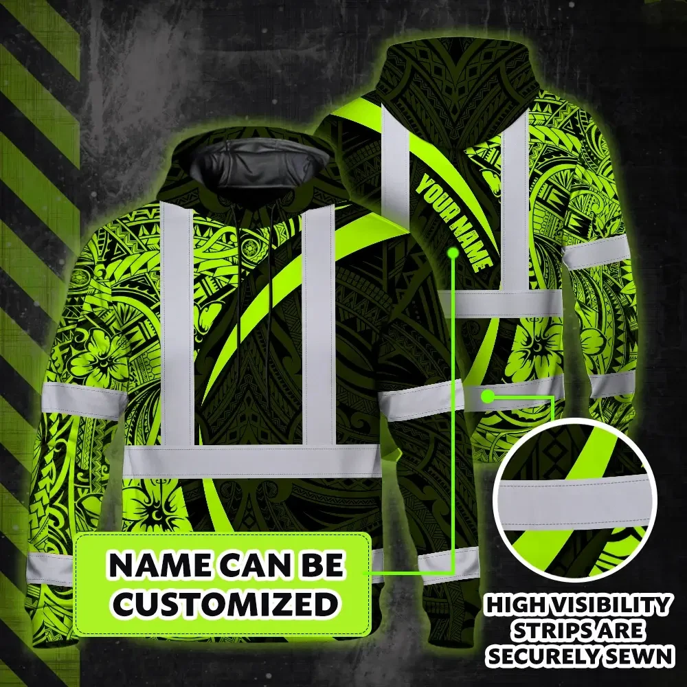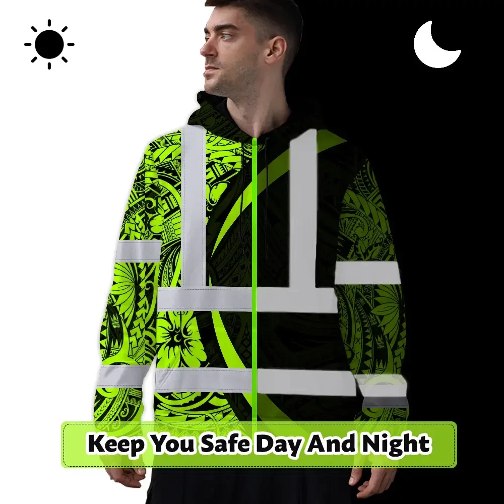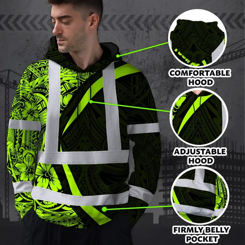 Hi Vis Hoodie Reflective Tapes Hawaiian Polynesian Tribal Custom Name Safety Workwear For Workers, Truckers, Operators