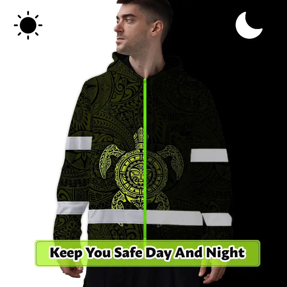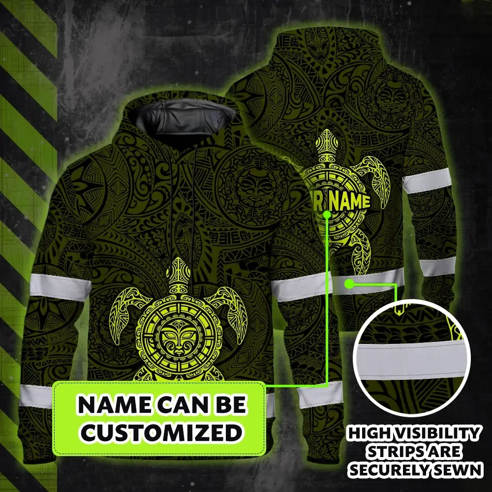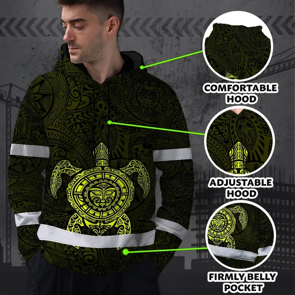 Hi Vis Hoodie Reflective Tapes Lime Neon Hawaii Turtle Custom Name Safety Workwear For Workers, Truckers, Operators