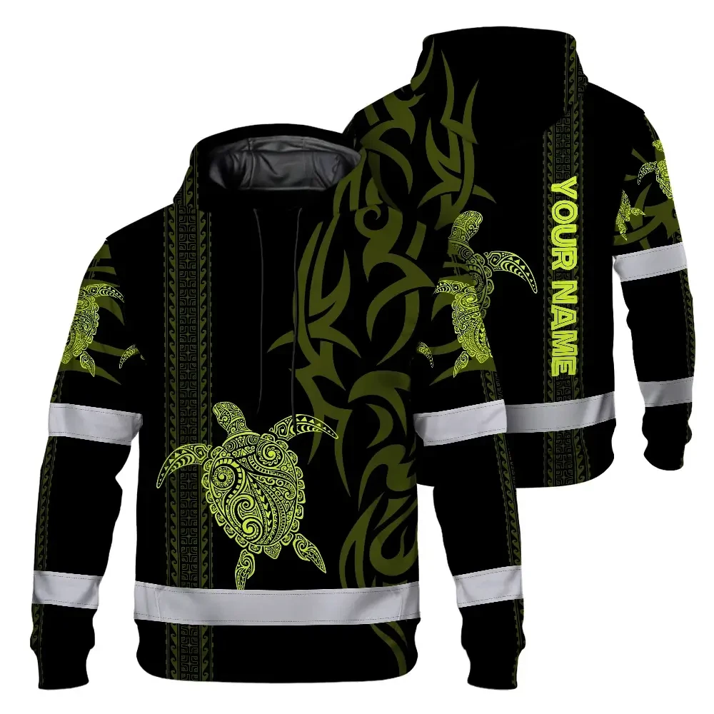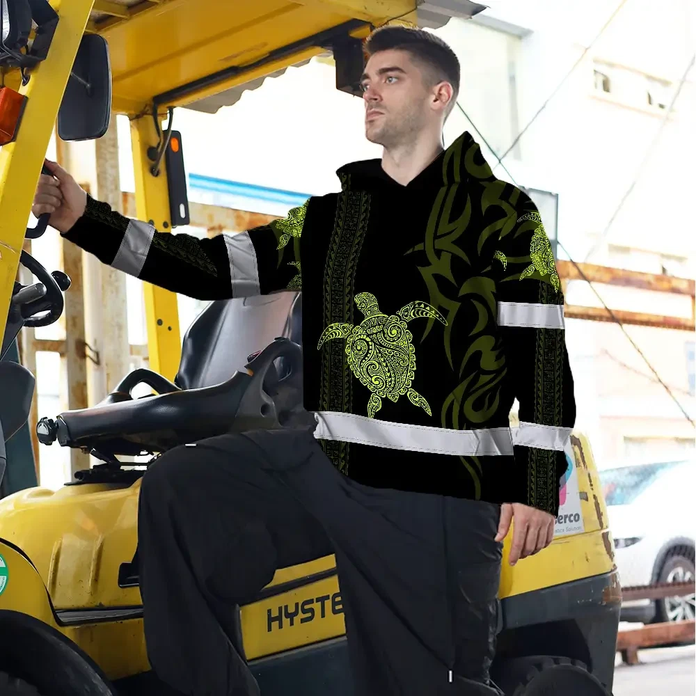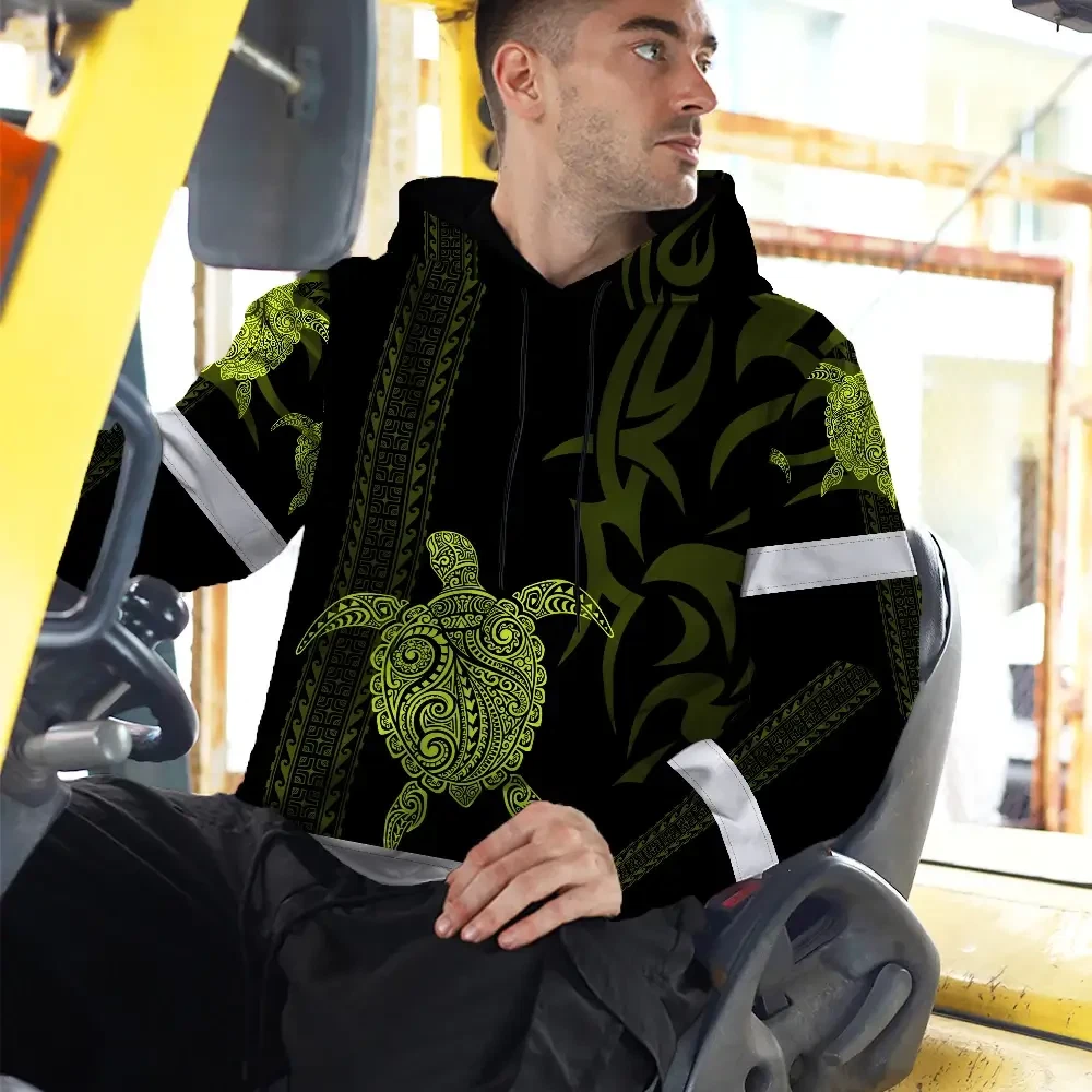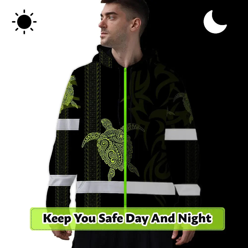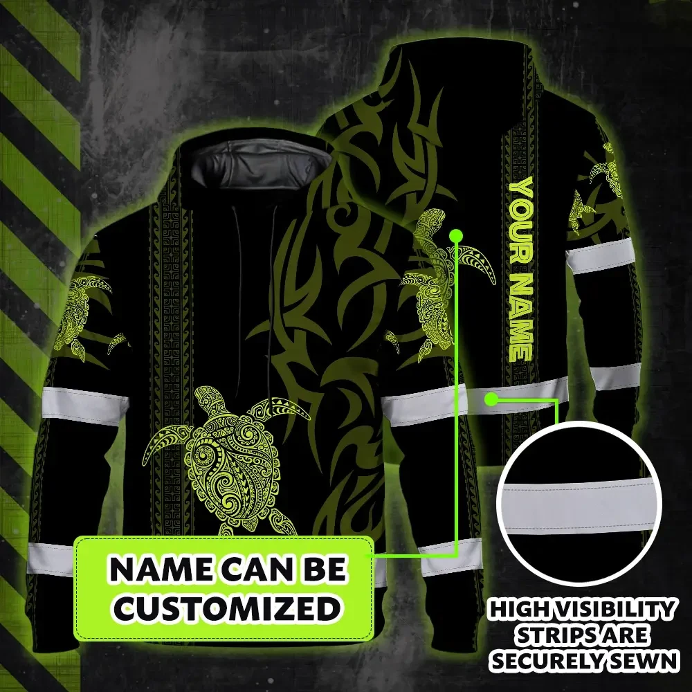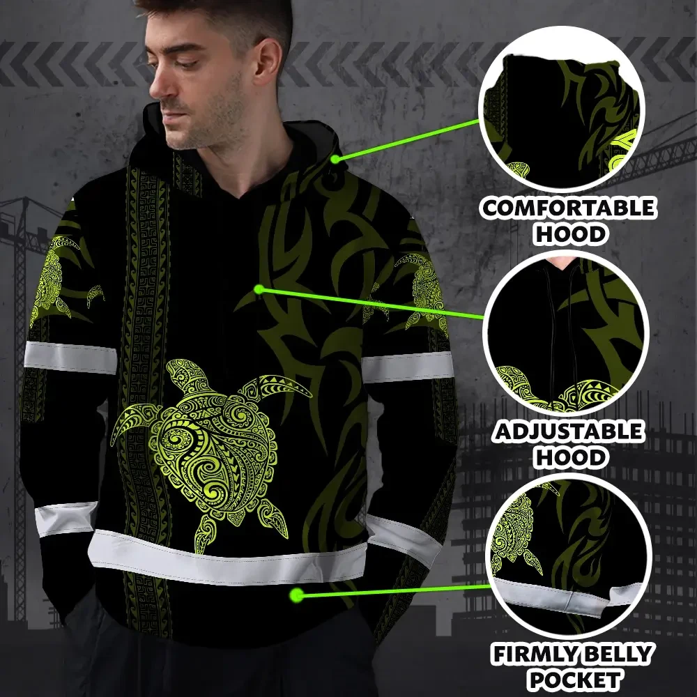 Hi Vis Hoodie Reflective Tapes Lime Neon Hawaiian Polynesian Tribal Custom Name Safety Workwear For Workers, Truckers, Operators
