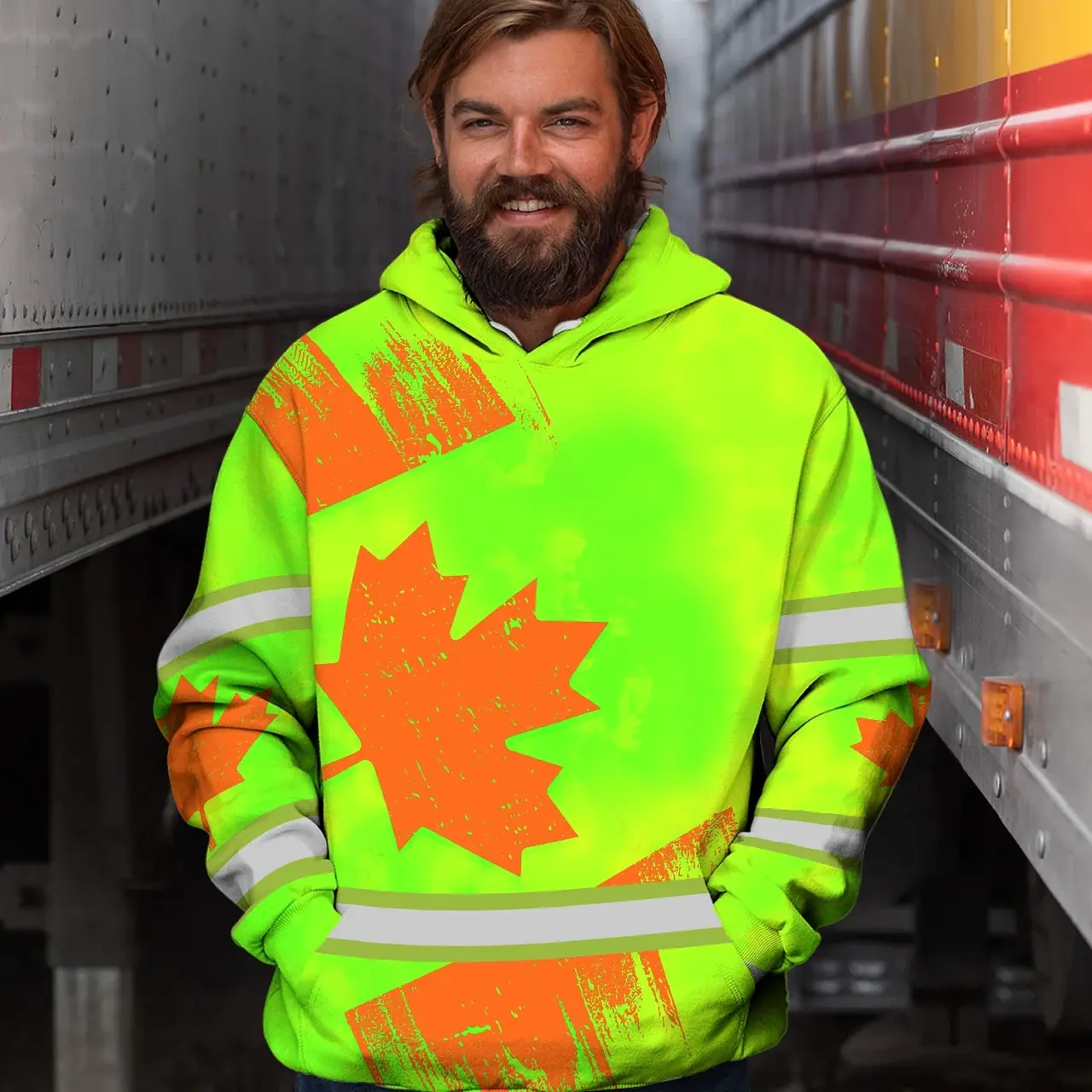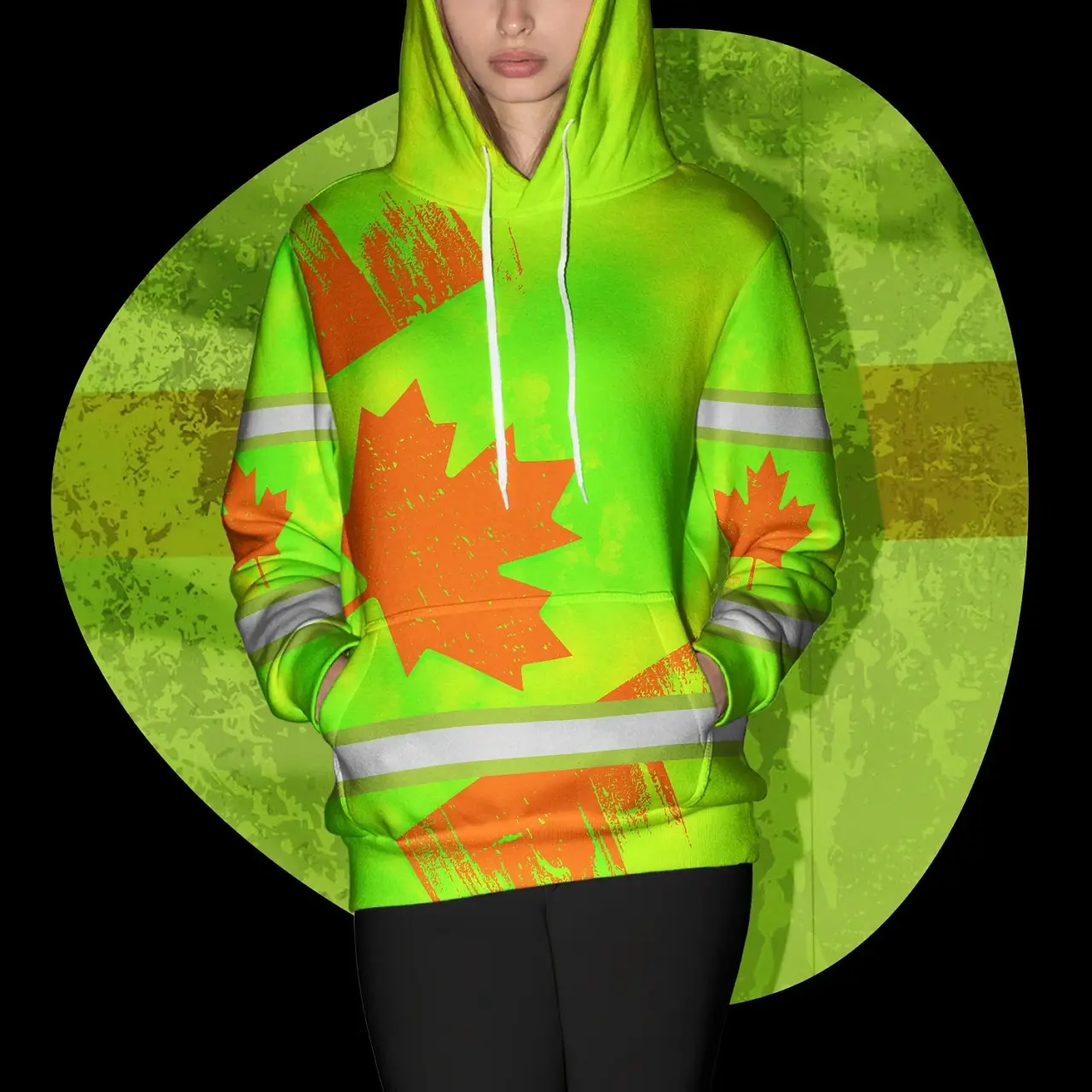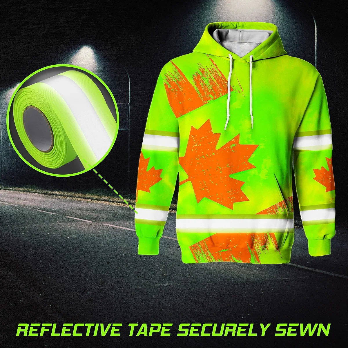 Hi Vis Hoodie Reflective Tapes Orange Green Canada Flag Custom Name Safety Workwear For Worker, Operator, Patriotic