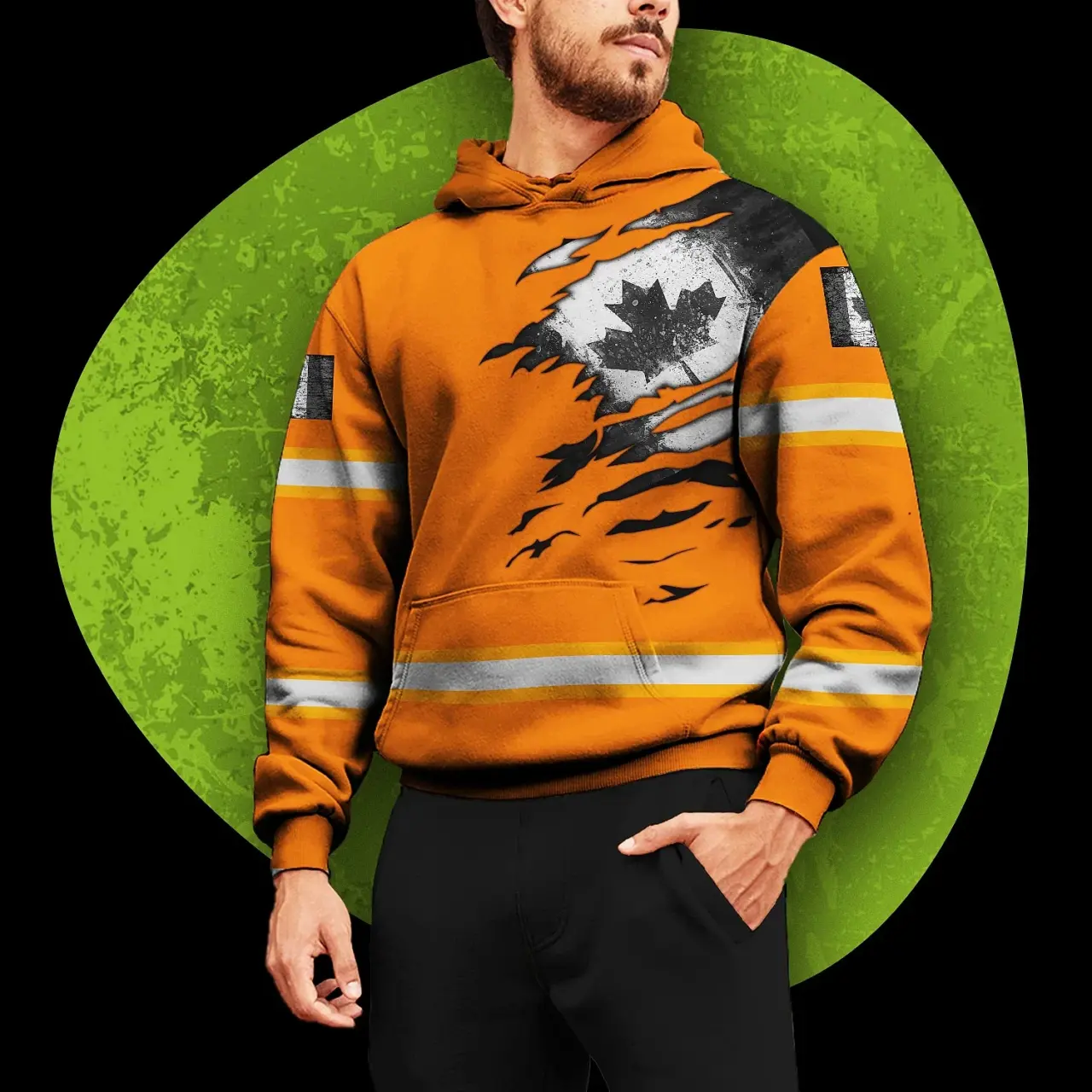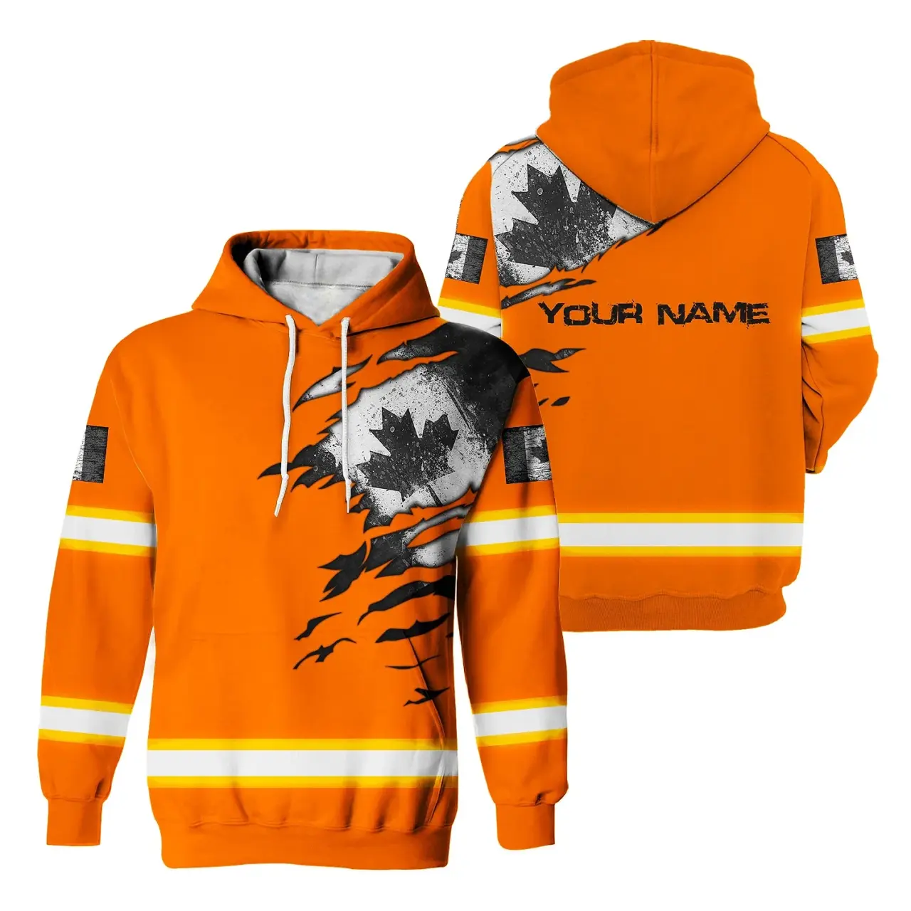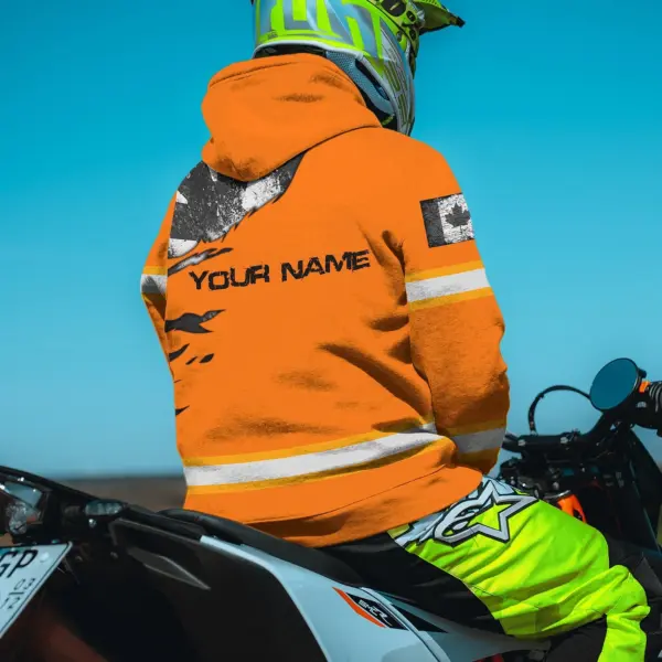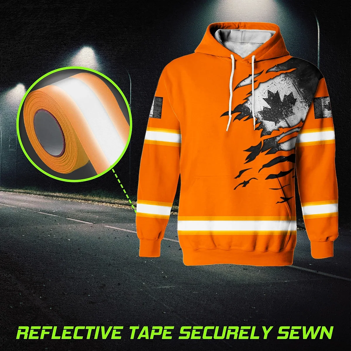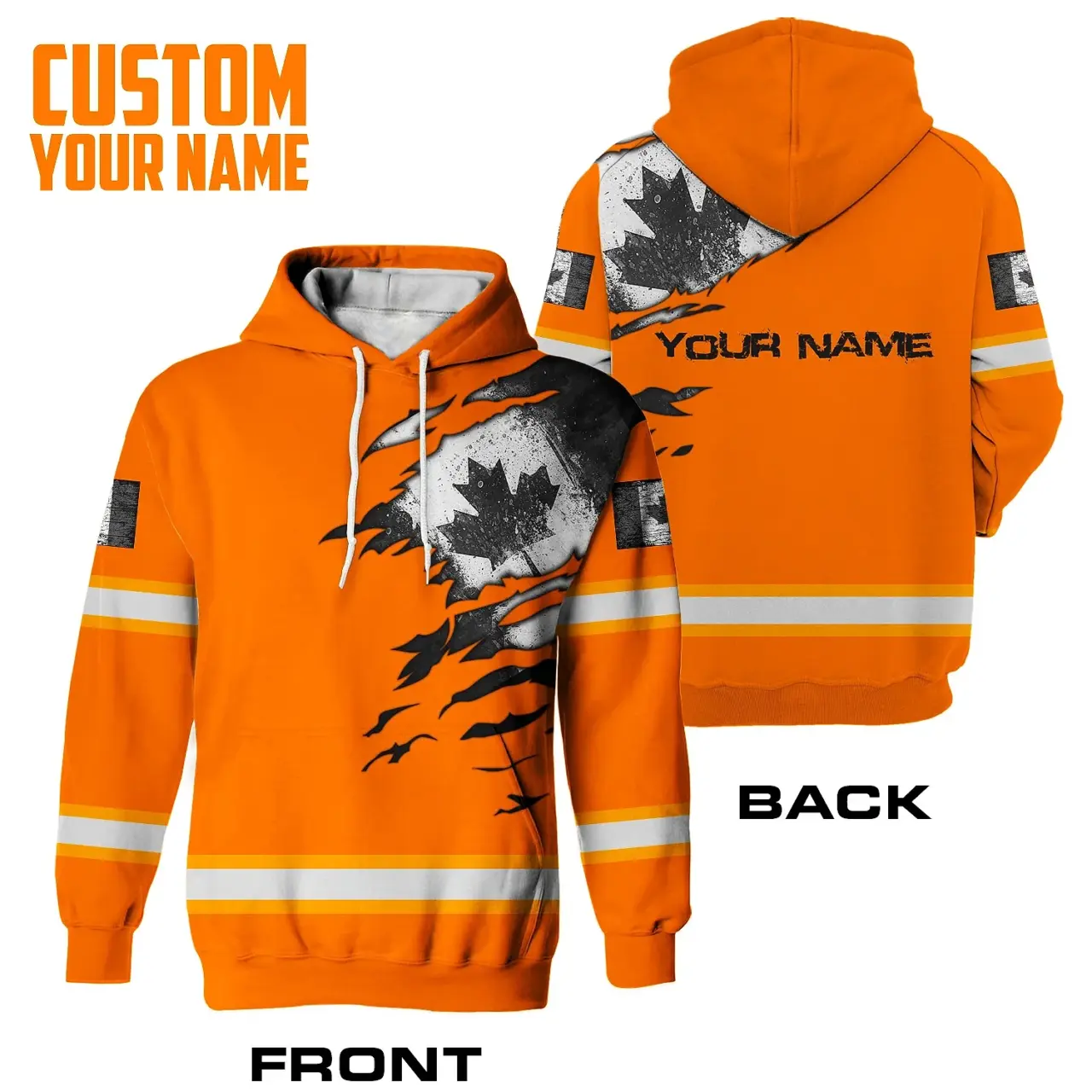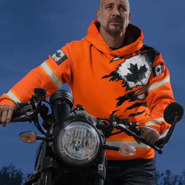 Hi Vis Hoodie Reflective Tapes Orange Neon Scratch Canada Flag Custom Name Safety Workwear For Worker, Operator, Patriotic
