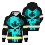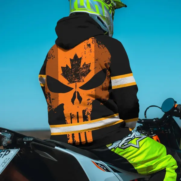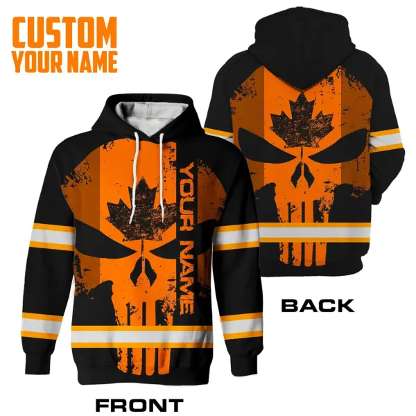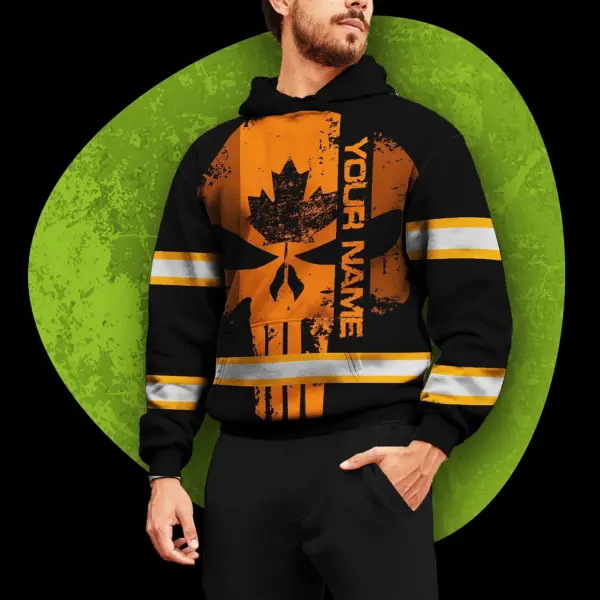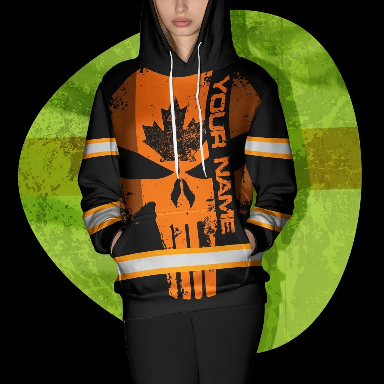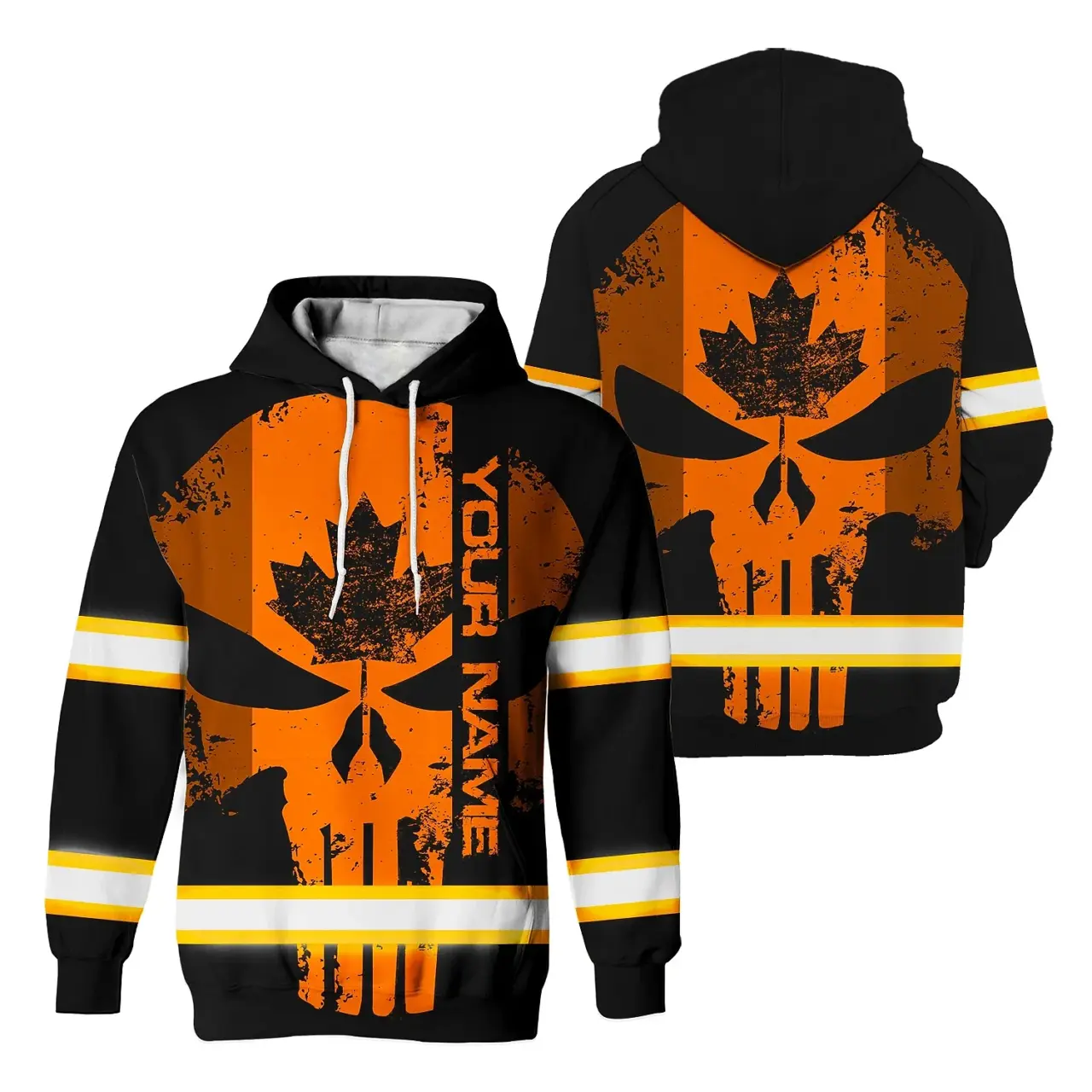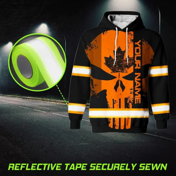 Hi Vis Hoodie Reflective Tapes Orange Neon Skull With Canada Flag Custom Name Safety Workwear For Worker, Operator, Patriotic